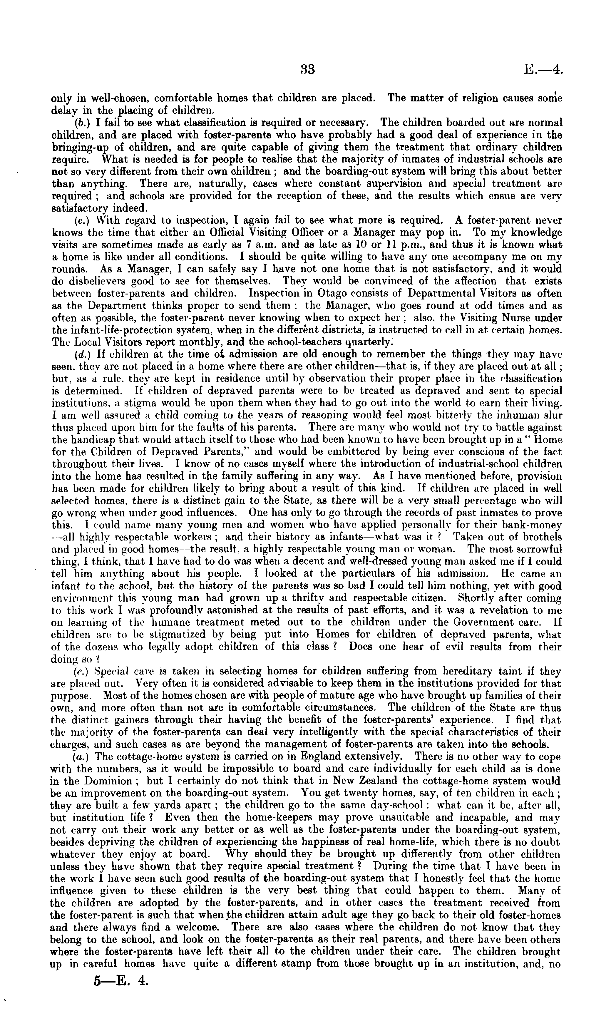 only in well-chosen, comfortable homes that children are placed. The matter of religion causes some delay in the placing of children. (6.) I fail to see what classification is required or necessary. The children boarded out are normal children, and are placed with foster-parents who have probably had a good deal of experience in the bringing-up of children, and are quite capable of giving them the treatment that ordinary children require. What is needed is for people to realise that the majority of inmates of industrial schools are not so very different from their own children ; and the boarding-out system will bring this about better than anything. There are, naturally, cases where constant supervision and spec -in 1 treatment are required : and schools are provided for the reception of these, and the results which ensue are very satisfactory indeed. (c.) With regard to inspection, I again fail to see what more is required. A foster-parent never knows the time that either an Official Visiting Officer or a Manager may pop in. To my knowledge visits are sometimes made as early as 7 a.m. and as late as 10 or 11 p.m., and thus it is known what, a home is like under all conditions. I should be quite willing to have any one accompany me on my rounds. As a Manager, I can safely say I have not one home that is not satisfactory, and it would do disbelievers good to see for themselves. They would be convinced of the affection that exists between foster-parents and children. Inspection in Otago consists of Departmental Visitors as often as the Department thinks proper to send them ; the Manager, who goes round at odd times and as often as possible, the foster-parent never knowing when to expect her : also, the Visiting Nurse under the infant-life-protection system, when in the different districts, is instructed to call in at certain homes. The Local Visitors report monthly, and the school-teachers quarterly. (d.) If children at the time of admission are old enough to remember the things they may nave seen, they are not placed in a home where there are other children—that is, if they an- placed out at all ; but. as a rule, they are kept in residence until by observation their proper place in the classification is determined. If children of depraved parents were to be treated as depraved and sent to special institutions, a stigma would be upon them when they had to go out into the world to earn their living. I am well assured a child coming to the years of reasoning would feel most bitterly the inhuman slur thus placed upon him for the faults of his parents. There are many who would not try to battle against the handicap that would attach itself to those who had been known to have been brought up in a " 1 [ome for the Children of Depraved Parents," and would be embittered by being ever conscious of the fact throughout their live*. I know of no cases myself where Ihe introduction of industrial-school children into the home has resulted in the family suffering in any way. As I have mentioned before, provision has been made for children likely to bring about a result of this kind. If children are placed in well selected homes, there is a distinct gain to the State, as there will be a very small percentage who will go wrong when under good influences. One has only to go through the records of past inmates to prove this. I could name many young men and women who have applied personally for their bank-money -all highly respectable workers; and their history as infants what was it '. Taken out of brothels and placed in good homes —the result, a highly respectable young man or woman. The most sorrowful thing. 1 think, that I have had to do was when a decent and well-dressed young man asked me if I could tell him anything about his people. I looked at the particulars of his admission. He came an infant to the school, but the history of the parents was so bad I could tell him nothing, vet with good environment this young man had grown up a thrifty and respectable citizen. Shortly after coming to this work I was profoundly astonished at the results of past efforts, and it was a revelation to me on learning of the humane treatment meted out to the children under the Government care. If children are to be stigmatized by being put into Homes for children of depraved parents, what of the dozens who legally adopt children of this class? Does one hear of evil results from their doing so ? (c.) Special care is taken in selecting homes for children suffering from hereditary taint if they are plae-ed out. Very often it is considered advisable to keep them in the institutions provided for that purpose. Most of the homes chosen are with people of mature age who have brought up families of their own, and more often than not are in comfortable circumstances. The children of the State are thus the distinct gainers through their having the benefit of the foster-parents' experience. I find that tin- majority of the foster-parents can deal very intelligently with the special characteristics of their charges, and such cases as are beyond the management of foster-parents are taken into the schools. (a.) The cottage-home system is carried on in England extensively. There is no other way to cope with the numbers, as it would be impossible to board and care individually for each child as is done in the Dominion ; but I certainly do not think that in New Zealand the cottage-home system would be an improvement on the boarding-out system. You get twenty homes, say, of ten children in each ; they are built a few yards apart ; the children go to the same day-school : what can it be, after all. but institution life ? Even then the home-keepers may prove unsuitable and incapable, and may not carry out their work any better or as well as the foster-parents under the boarding-out system, besides depriving the children of experiencing the happiness of real home-life, which there is no doubt whatever they enjoy at board. Why should they b