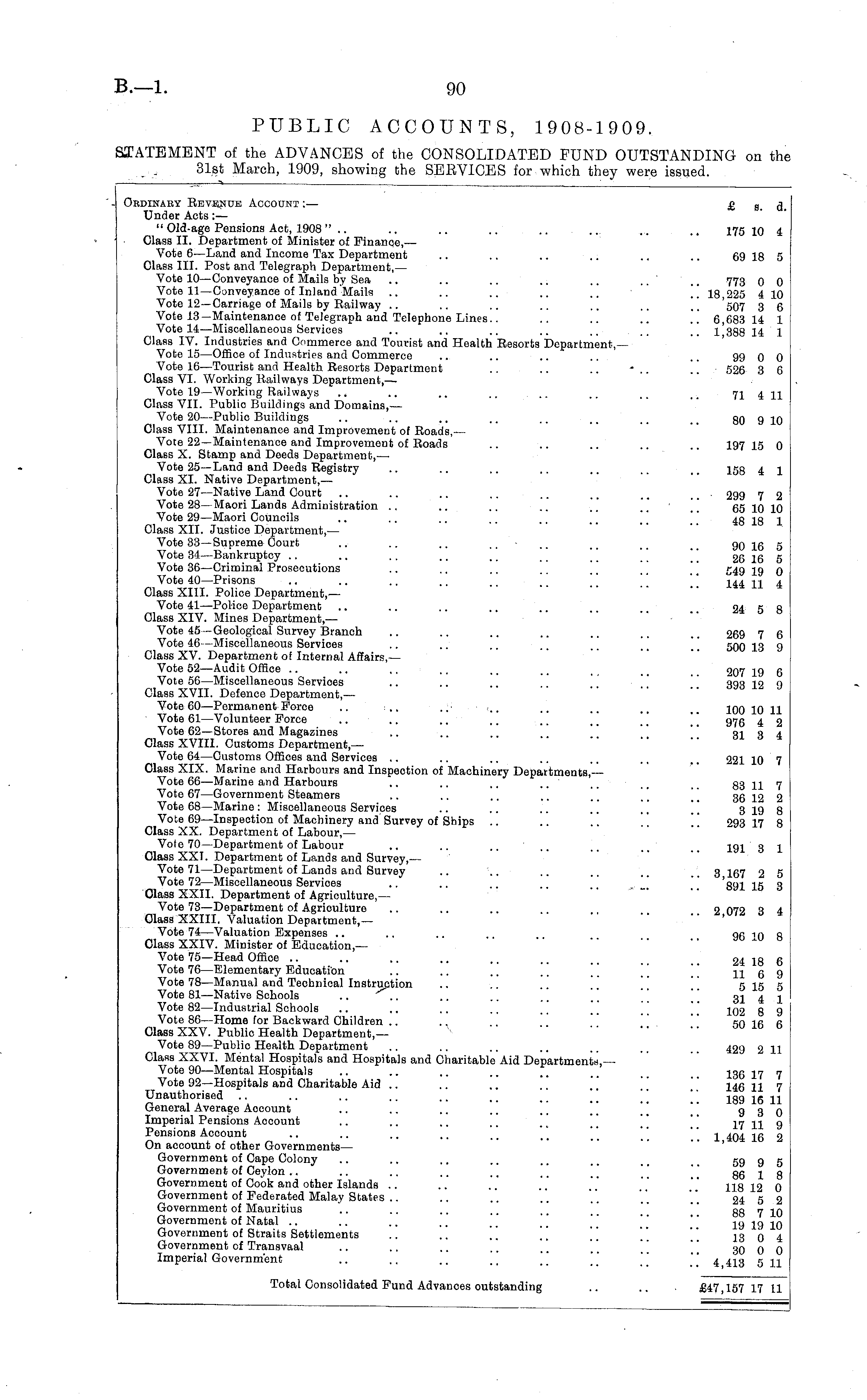 irdinary Revenue Account :— Under Acts: — " Old-age Pensions Act, 1908 " .. Class II. Department of Minister of Finance, — Vote 6—Land and Income Tax Department Class III. Post and Telegraph Department,— Vote 10 —Conveyance of Mails by Sea Vote 11—Conveyance of Inland Mails .. Vote 12—Carriage of Mails by Railway Vote 13—Maintenance of Telegraph and Telephone Lines.. Vote 14—Miscellaneous Services Class IV. Industries and Commerce and Tourist and Health Resorts Department — Vote 15—Office of Industries and Commerce Vote 16—Tourist and Health Resorts Department Class VI. Working Railways Department,— Vote 19—Working Railways Class VII. Public Buildings and Domains, — Vote 20—Public Buildings Class VIII. Maintenance and Improvement of Roads, — Vote 22—Maintenance and Improvement of Roads ClaBS X. Stamp and Deeds Department,— Vote 25—Land and Deeds Registry Class XI. Native Department,— Vote 27—Native Land Court Vote 28 —Maori Lands Administration Vote 29—Maori Councils Class XII. Justice Department,— Vote 33—Supreme Court .. .. .. Vote 34—Bankruptcy Vote 36—Criminal Prosecutions Vote 40 —Prisons Class XIII. Police Department,— Vote 41—Police Department Class XIV. Mines Department,— Vote 45 -Geological Survey Branch Vote 46—Miscellaneous Services Class XV. Department of Internal Affairs, — Vote 52—Audit Office Vote 56—Miscellaneous Servioes Glass XVII. Defence Department,— Vote 60 —Permanent Force .. :.. ■ .;■ ... Vote 61—Volunteer Force Vote 62—Stores and Magazines Class XVIII. Customs Department,— Vote 64 —Customs Offices and Services Class XIX. Marine and Harbours and Inspection of Machinery Departments, Vote 66 —Marine and Harbours Vote 67 —Government Steamers Vote 68—Marine : Miscellaneous Services Vote 69 —Inspection of Machinery and Survey of Ships .. .. .' Class XX. Department of Labour, — Vote 70—Department of Labour Class XXI. Department of Lands and Survey,— Vote 71 —Department of Lands and Survey .. Vote 72—Miscellaneous Services Class XXII. Department of Agriculture,— Vote 73—Department of Agriculture Class XXIII. Valuation Department,— Vote 74 —Valuation Expenses Class XXIV. Minister of Education, — Vote 75—Head Office Vote 76 —Elementary Education Vote 78—Manual and Technical Instruction Vote 81—Native Schools .. .. Vote 82 —Industrial Schools Vote 86—Home for Backward Children Class XXV. Public Health Department,— Vote 89—Public Health Department Class XXVI. Mental Hospitals and Hospitals and Charitable Aid Departments,— Vote 90—Mental Hospitals .. .. .. .. f. Vote 92—Hospitals and Charitable Aid .. .. .. .' Unauthorised General Average Aocount Imperial Pensions Account Pensions Account On account of other Governments— Government of Cape Colony Government of Ceylon Government of Cook and other Islands Government of Federated Malay States .. Government of Mauritius Government of Natal Government of Straits Settlements .. .. '' \] Government of Transvaal Imperial Government £ s. d. 175 10 4 69 18 5 773 0 0 .. 18,225 4 10 507 3 6 .. 6,683 14 1 .. 1,388 14 1 99 0 0 .. 526 3 6 71 4 11 80 9 10 197 15 0 158 4 1 .. 299 7 2 65 10 10 48 18 1 90 16 5 26 16 5 549 19 0 144 11 4 24 5 8 269 7 6 500 13 9 207 19 6 393 12 9 100 10 11 976 4 2 31 3 4 221 10 7 83 11 7 36 12 2 3 19 8 293 17 8 191 3 1 .. 3,167 2 5 891 15 3 .. 2,072 3 4 96 10 8 24 18 6 11 6 9 5 15 5 31 4 1 102 8 9 50 16 6 429 2 11 136 17 7 146 11 7 189 16 11 9 3 0 17 11 9 .. 1,404 16 2 59 9 5 86 1 8 118 12 0 24 5 2 88 7 10 19 19 10 13 0 4 30 0 0 .. 4,413 5 11 Total Consolidated Fund Advances outstanding £47,157 17 11 £47,157 17 11