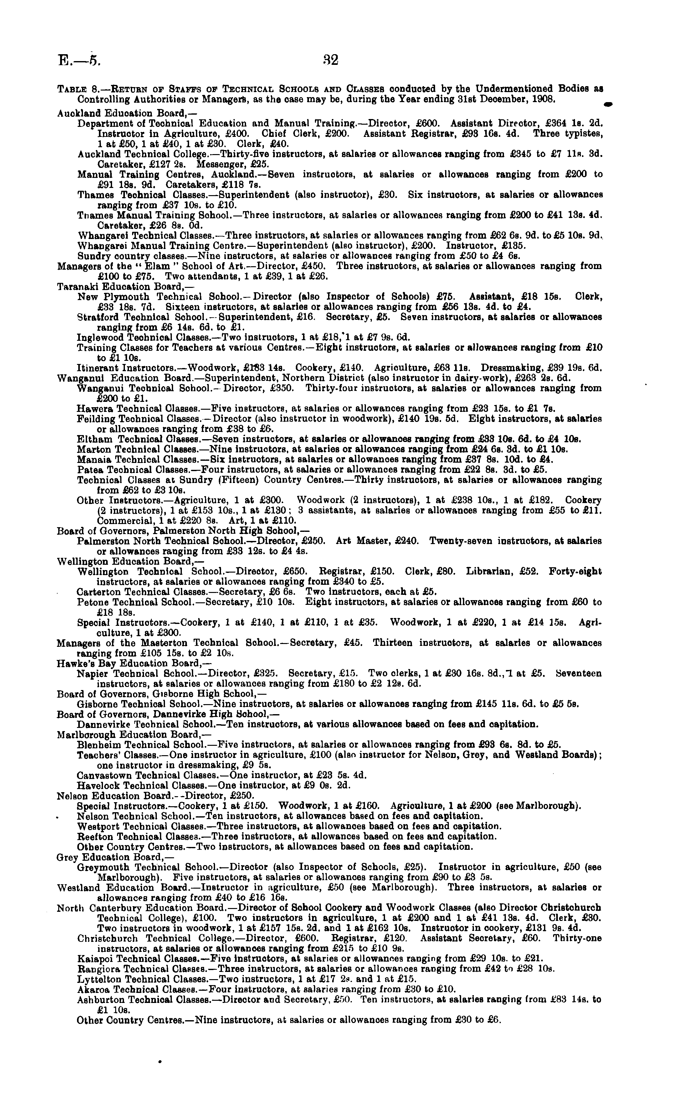 Table 8. —Return op Staffs of Technical Schools and Classes oonduoted by the Undermentioned Bodies as Controlling Authorities or Managers, as the oase may be, during the Year ending 31st Deoember, 1908. Auckland Eduoation Board, — Department of Teohnical Education and Manual Training.—Director, £600. Assistant Director, £364 Is. 2d. Instructor in Agriculture, £400. Chief Clerk, £200. Assistant Registrar, £93 16s. 4d. Three typistes, lat £50, lat £40, lat £30. Clerk, £40. Auckland Technical College.—Thirty-five instructors, at salaries or allowances ranging from £345 to £7 lis. 3d. Caretaker, £127 2s. Messenger, £25. Manual Training Centres, Auckland.—Seven instructors, at salaries or allowances ranging from £200 to £91 18s. 9d. Caretakers, £118 7s. Thameß Teohnical Classes.—Superintendent (also instructor), £30. Six instructors, at salaries or allowances ranging from £37 10s. to £10. Tnames Manual Training Sohool.—Three instructors, at salaries or allowances ranging from £200 to £41 13s. 4d. Caretaker, £26 Bs. Od. Whangarei Technical Classes.—Three instructors, at salaries or allowances ranging from £62 6s. 9d. to £5 10s. 9d, Whangarei Manual Training Centre.—Superintendent (also instructor), £200. Instructor, £135. Sundry country classes. —Nine instructors, at salaries or allowances ranging from £50 to £4 6s. Managers of the " Elam " School of Art.—Director, £450. Three instructors, at salaries or allowances ranging from £100 to £75. Two attendants, lat £39, lat £26. Taranaki Education Board, — New Plymouth Technical School.— Director (also Inspector of Schools) £75. Assistant, £18 15s. Clerk, £33 18s. 7d. Sixteen instructors, at salaries or allowances ranging from £56 13s. 4d. to £4. Stratford Teohnical School.- Superintendent, £16. Secretary, £5. Seven instructors, at salaries or allowances ranging from £6 14s. 6d. to £1. Inglewood Teohnioal Classes. —Two instructors, 1 at £18,*1 at £7 9s. Od. Training Classes for Teachers at various Centres.—Eight instructors, at salaries or allowances ranging from £10 to £1 10s. Itinerant Instructors.—Woodwork, £183 14s. Cookery, £140. Agriculture, £63 lis. Dressmaking, £39 19s. 6d. Wanganui Education Board.—Superintendent, Northern District (also instructor in dairy-work), £263 2s. 6d. Wanganui Technical School.- Director, £350. Thirty-four instructors, at salaries or allowances ranging from £200 to £1. Hawera Technical Classes. —Five instructors, at salaries or allowances ranging from £23 15s. to £1 7s. Peilding Teohnical Classes. — Director (also instructor in woodwork), £140 19s. sd. Eight instructors, at salaries or allowances ranging from £38 to £6. Eltham Technical Classes.—Seven instructors, at salaries or allowances ranging from £33 10s. Od. to fc4 10s. Marton Technical Classes. —Nine instructors, at salaries or allowances ranging from £24 6s. 3d. to £1 10s. Manaia Technical Classes. —Six instructors, at salaries or allowances ranging from £37 Bs. lOd. to £4. Patea Technical Classes. —Four instructors, at salaries or allowances ranging from £22 Bs. 3d. to £5. Technioal Classes at Sundry (Fifteen) Country Centres. —Thirty instructors, at salaries or allowances ranging from £62 to £3 10s. Other Instructors.—Agriculture, lat £300. Woodwork (2 instructors), lat £238 10s., lat £182. Cookery (2 instructors), lat £153 10s., lat £130; 3 assistants, at salaries or allowances ranging from £55 to £11. Commercial, lat £220 Bs. Art, lat £110. Board of Governors, Palmerston North High Sohool, — Palmerston North Technical Sohool.—Director, £250. Art Master, £240. Twenty-seven instructors, at salaries or allowances ranging from £33 12s. to £4 4s. Wellington Education Board, — Wellington Technioal School.—Direotor, £650. Registrar, £150. Clerk, £80. Librarian, £52. Forty-eight instructors, at salaries or allowances ranging from £340 to £5. Carterton Technical Classes. —Secretary, £6 6s. Two instructors, each at £5. Petone Technioal School. —Secretary, £10 10s. Eight instructors, at salaries or allowances ranging from £60 to £18 18s. Special Instructors.—Cookery, lat £140, lat £110, lat £35. Woodwork, 1 at £220, lat £14 15s, Agriculture, 1 at £300. Managers of the Masterton Technical Sohool.—Secretary, £45. Thirteen instructors, at salaries or allowances ranging from £105 15s. to £2 10s. Hawke's Bay Education Board, — Napier Teohnical School.—Director, £325. Secretary, £15. Two olerks, lat £30 16s. Bd.,T at £5. Seventeen instructors, at salaries or allowances ranging from £180 to £2 12s. Od. Board of Governors, Gisborne High School, — Gisborne Technioal Sohool.—Nine instructors, at salaries or allowances ranging from £145 lis. 6d. to £5 ss. Board of Governors, Dannevirke High Sohool, — Dannevirke Teohnical School.—Ten instructors, at various allowances based on fees and capitation. Marlborough Education Board,— Blenheim Teohnical School.—Five instructors, at salaries or allowances ranging from £93 6s. Bd. to £5. Teachers' Classes.—One instructor in agriculture, £100 (also instructor for Nelson, Grey, and Westland Boards); one instructor in dressmaking, £9 ss. Canvastown Technical Classes.—One instructor, at £23 ss. 4d. Havelock Technical Classes. —One instructor, at £9 os. 2d. Nelson Education Board.--Director, £250. Special Instructors. —Cookery, lat £150. Woodwork, lat £160. Agrioulture, lat £200 (see Marlborough;. Nelson Technical School.—Ten instructors, at allowances based on fees and capitation. Westport Technical Classes. —Three instructors, at allowances baßed on fees and capitation. Reefton Technical Classes.—Three instructors, at allowances based on fees and capitation. Other Country Centres.—Two instructors, at allowances based on fees and capitation. Grey Education Board, — Greymouth Technical Sohool.—Director (also Inspector o