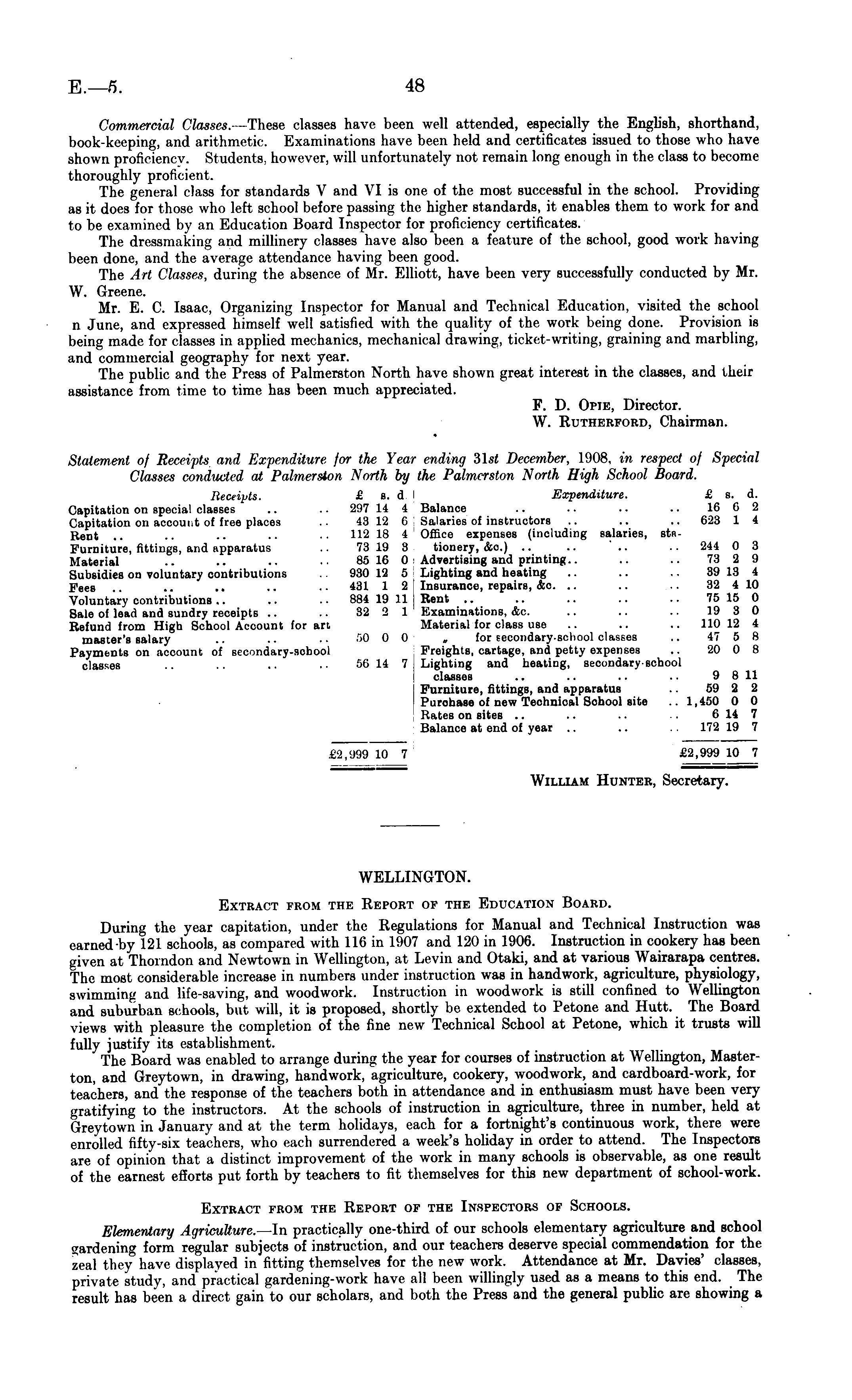 Commercial Classes. —These classes have been well attended, especially the English, shorthand, book-keeping, and arithmetic. Examinations have been held and certificates issued to those who have shown proficiency. Students, however, will unfortunately not remain long enough in the class to become thoroughly proficient. The general class for standards V and VI is one of the most successful in the school. Providing as it does for those who left school before passing t he higher standards, it enables them to work for and to be examined by an Education Board Inspector for proficiency certificates. The dressmaking and millinery classes have also been a feature of the school, good work having been done, and the average attendance having been good. The Art Classes, during the absence of Mr. Elliott, have been very successfully conducted by Mr. W. Greene. Mr. E. C. Isaac, Organizing Inspector for Manual and Technical Education, visited the school n June, and expressed himself well satisfied with the quality of the work being done. Provision is being made for classes in applied mechanics, mechanical (Irawing, ticket-writing, graining and marbling, and commercial geography for next year. The public and the Press of Palmerston North have shown great interest in the classes, and their assistance from time to time has been much appreciated. F. D. Opie, Director. W. Rutherford, Chairman. Statement of Receipts and Expenditure for the Year ending 3\st December, 1908, in respect of Special Classes conducted at Palmerston North by the Palmerston North High School Board. Receipts. £ s. d. ' Expenditure. £ s. d. Capitation on special classes .. .. 297 14 4 Balance .. .. .. 16 6 2 Capitation on account of free places .. 43 12 6 Salaries of instructors .. .. .. 623 1 4 Rent .. .. .. .. 112 18 4 Office expenses (including salaries, stnFurniture, fittings, and apparatus 73 19 3 tionery, &c.) .. .. .. .. 244 0 3 Material .. .. .. 85 16 0 Advertising and printing.. .. 73 2 9 Subsidies on voluntary contributions . 930 12 5 Lighting and heating .. .. 39 13 4 Fees .. .. .. .. 431 1 2 Insurance, repairs, &c. .. .. .. 32 410 Voluntary contributions.. .. 884 19 11 Rent .. .. .. .. 75 15 0 Bale of lead and sundry receipts .. .. 32 2 1 Examinations, etc. .. .. 19 3 0 Refund from High School Account for art Material for class use .. .. .. 110 12 4 master's salary .. .. .. 50 0 0 „ for secondary-school classes .. 47 5 8 Payments on account of secondary-school Freights, cartage, and petty expenses .. 20 0 8 classes .. .. .. •• 56 14 7 Lighting and heating, secondary-school classes .. .. .. .. 9 811 Furniture, fittings, and apparatus .. 59 2 2 Purchase of new Technical School site .. 1,450 0 0 Rates on sites .. .. .. .. 6 14 7 Balance at end of year .. .. 172 19 7 £3,999 10 7 £2,999 10 7 William Hunter, Secretary. WELLINGTON. Extract from the Report of the Education Board. During the year capitation, under the Regulations for Manual and Technical Inst nut ion was earned-by 121 schools, as compared with 116 in 1907 and 120 in 1906. Instruction in cookery has been given at Thorndon and Newtown in Wellington, at Levin and Otaki, and at various Wairarapa centres. The most considerable increase in numbers under instruction was in handwork, agriculture, physiology, swimming and life-saving, and woodwork. Instruction in woodwork is still confined to Wellington and suburban schools, but will, it is proposed, shortly be extended to Petone and Hutt. The Board views with pleasure the completion of the fine new Technical School at Petone, which it trusts will fully justify its establishment. The Board was enabled to arrange during the year for courses of instruction at Wellington, Masterton, and Greytown, in drawing, handwork, agriculture, cookery, woodwork, and cardboard-work, for teachers, and the response of the teachers both in attendance and in enthusiasm must have been very gratifying to the instructors. At the schools of instruction in agriculture, three in number, held at Greytown in January and at the term holidays, each for a fortnight's continuous work, there were enrolled fifty-six teachers, who each surrendered a week's holiday in order to attend. The Inspectors are of opinion that a distinct improvement of the work in many schools is observable, as one result of the earnest efforts put forth by teachers to fit themselves for this new department of school-work. Extract from the Report of the Inspectors of Schools. Elementary Agriculture—ln practically one-third of our schools elementary agriculture and school gardening form regular subjects of instruction, and our teachers deserve special commendation for the zeal they have displayed in fitting themselves for the new work. Attendance at Mr. Davies' classes, private study, and practical gardening-work have all been willingly used as a means to this end. The result has been a direct gain to our scholars, and both the Press and the general public arc showing a