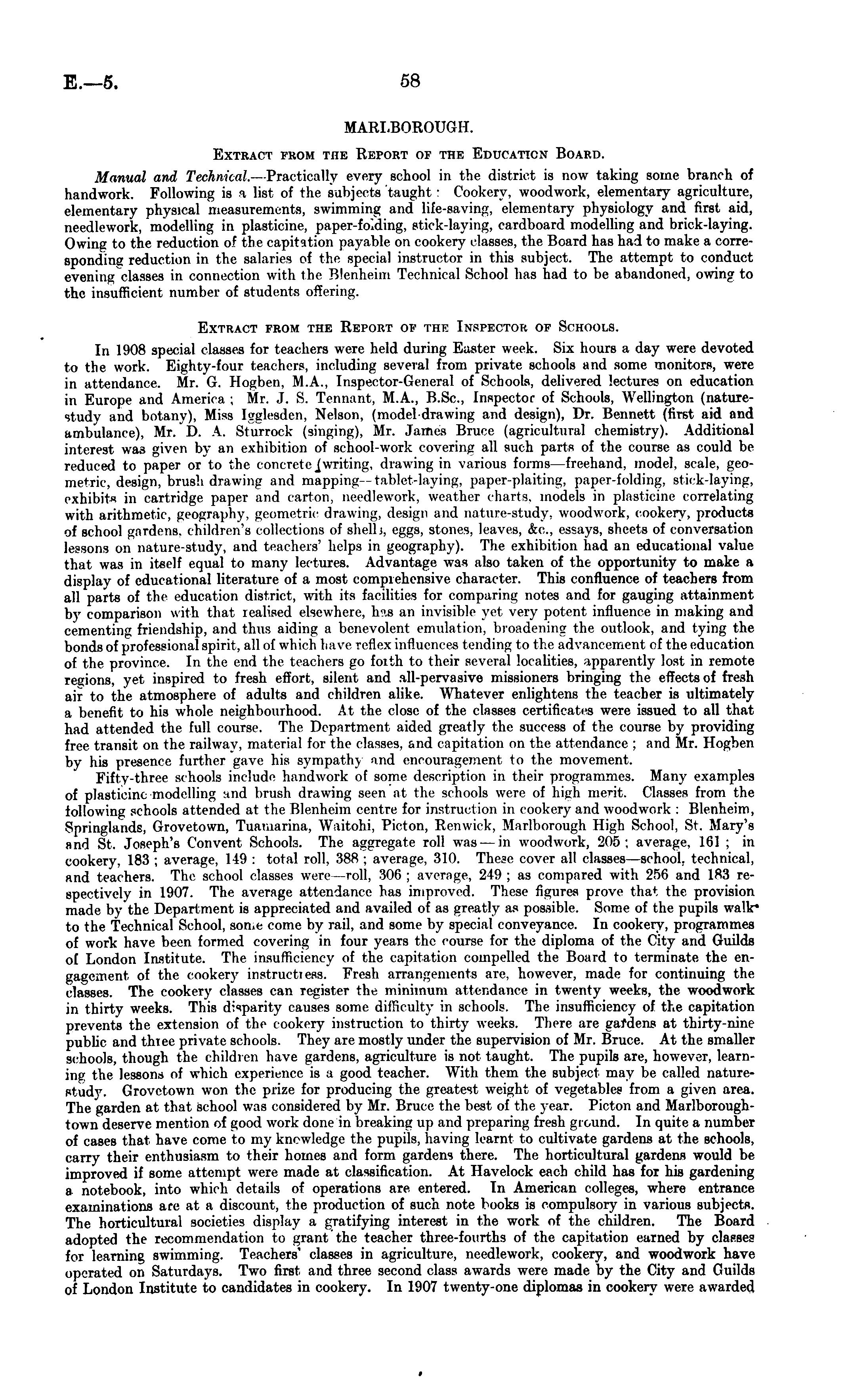 MARLBOROUGH. Extract from the Report of the Education Board. Manual and Technical. —Practically every school in the district is now taking some branch of handwork. Following is a list of the subjects taught: Cookery, woodwork, elementary agriculture, elementary physical measurements, swimming and life-saving, elementary physiology and first aid, needlework, modelling in plasticine, paper-folding, stick-laying, cardboard modelling and brick-laying. Owing to the reduction of the capitation payable on cookery classes, the Board has had to make a corresponding reduction in the salaries of the special instructor in this subject. The attempt to conduct evening classes in connection with the Blenheim Technical School has had to be abandoned, owing to the insufficient number of students offering. Extract from the Report of the Inspector of Schools. In 1908 special classes for teachers were held during Easter week. Six hours a day were devoted to the work. Eighty-four teachers, including several from private schools and some monitors, were in attendance. Mr. G. Hogben, M.A., Inspector-General of Schools, delivered lectures on education in Europe and America; Mr. J. S. Tennant, M.A., B.Sc, Inspector of Schools, Wellington (naturestudy and botany), Miss Egglesden, Nelson, (model drawing and design), Dr. Bennett (first aid and ambulance), Mr. D. A. Sturrock (singing), Mr. James Bruce (agricultural chemistry). Additional interest was given by an exhibition of school-work covering all such parts of the course as could be reduced to paper or to the concrete drawing in various forms—freehand, model, scale, geometric, desieii. brush drawing and mapping tablet-laying, paper-plaiting, paper-folding, stick-laying, exhibits in cartridge paper and carton, needlework, weather charts, models in plasticine correlating with arithmetic-, geography, geometric drawing, design and nature study, woodwork, cookery, products of school gardens, children's collections of shelli, eggs, stones, leaves, etc. essays, sheets of conversation lessons on nature-study, and teachers' helps in geography). The exhibition had an educational value that was in itself equal to many lectures. Advantage was also taken of the opportunity to make a display of educational literature of a most comprehensive character. This confluence of teachers from all parts of the education district, with ils facilities for comparing notes and for gauging attainment by comparison with that realised elsewhere, h?.s an invisible yet very potent influence in making and cementing friendship, and thus aiding a benevolent emulation, broadening the outlook, and tying the bonds of professional spirit, all of which have reflex influences tending to the advancement of the education of the province. In the end the teachers go forth to their several localities, apparently lost in remote regions, yet inspired to fresh effort, silent and all-pervasive missioners bringing the effects of fresh air to the atmosphere of adults and children alike. Whatever enlightens the teacher is ultimately a benefit to his whole neighbourhood. At the close of the classes certificates were issued to all that had attended the full course. The Department aided greatly the success of the course by providing free transit on the railway, material for the classes, and capitation on the attendance ; and Mr. Hogben by his presence further gave his sympathy and encouragement to the movement. Fifty-three schools include handwork of some description in their programmes. Many examples of plasticine modelling and brush drawing seen at the schools were of high merit. Classes from the following schools attended at the Blenheim centre for instruction in cookery and woodwork : Blenheim, Springlands, Grovetown, Tuamarina, Waitohi. Pic-ton, Renwick, Marlborough High School, St. Mary's and St. Joseph's Convent Schools. The aggregate roll was —in woodwork, 205; average, 161 ; in cookery. 183 ; average, 149 : total roll, 388 ; average, 310. These cover all classes —school, technical, and teachers. The school classes were —roll, 306 ; average, 249 ; as compared with 256 and 183 respectively in 1907. The average attendance has improved. These figures prove that the provision made by the Department is appreciated and availed of as greatly as possible. Some of the pupils walk* to the Technical School, some come by rail, and some by special conveyance. In cookery, programmes of work have been formed covering in four years the course for the diploma of the City and Guilds of London Institute. The insufficiency of the capitation compelled the Board to terminate the engagement of the cookery instructtess. Fresh arrangements are, however, made for continuing the classes. The cookery classes can register the minimum attendance in twenty weeks, the woodwork in thirty weeks. This disparity causes some difficulty in schools. The insufficiency of the capitation prevents the extension of the cookery instruction to thirty weeks. There are gardens at thirty-nine public and thtee private schools. They are mostly under the supervision of Mr. Bruce. At the smaller schools, though the children have gardens, agriculture is not taught. The pupils are, however, learning the lessons of which experience is a good teacher. With them the subject may be called naturestudv. Grovetown won the prize for producing the greatest weight of vegetables from a given area. The garden at that school was considered by Mr. Bruce the best of the year. Picton and Marlboroughtown deserve mention of good work done in breaking up and preparing fresh ground. In quite a number of cases that have come to my knowledge the pupils, having learnt to cultivate gardens at the schools, carry their enthusiasm to their homes and form gardens there. The horticultural gardens would be improved if some attempt were made at classification. At Havelock each child has for his gardening a notebook, into which details of operations are entered. In American colleges, wh