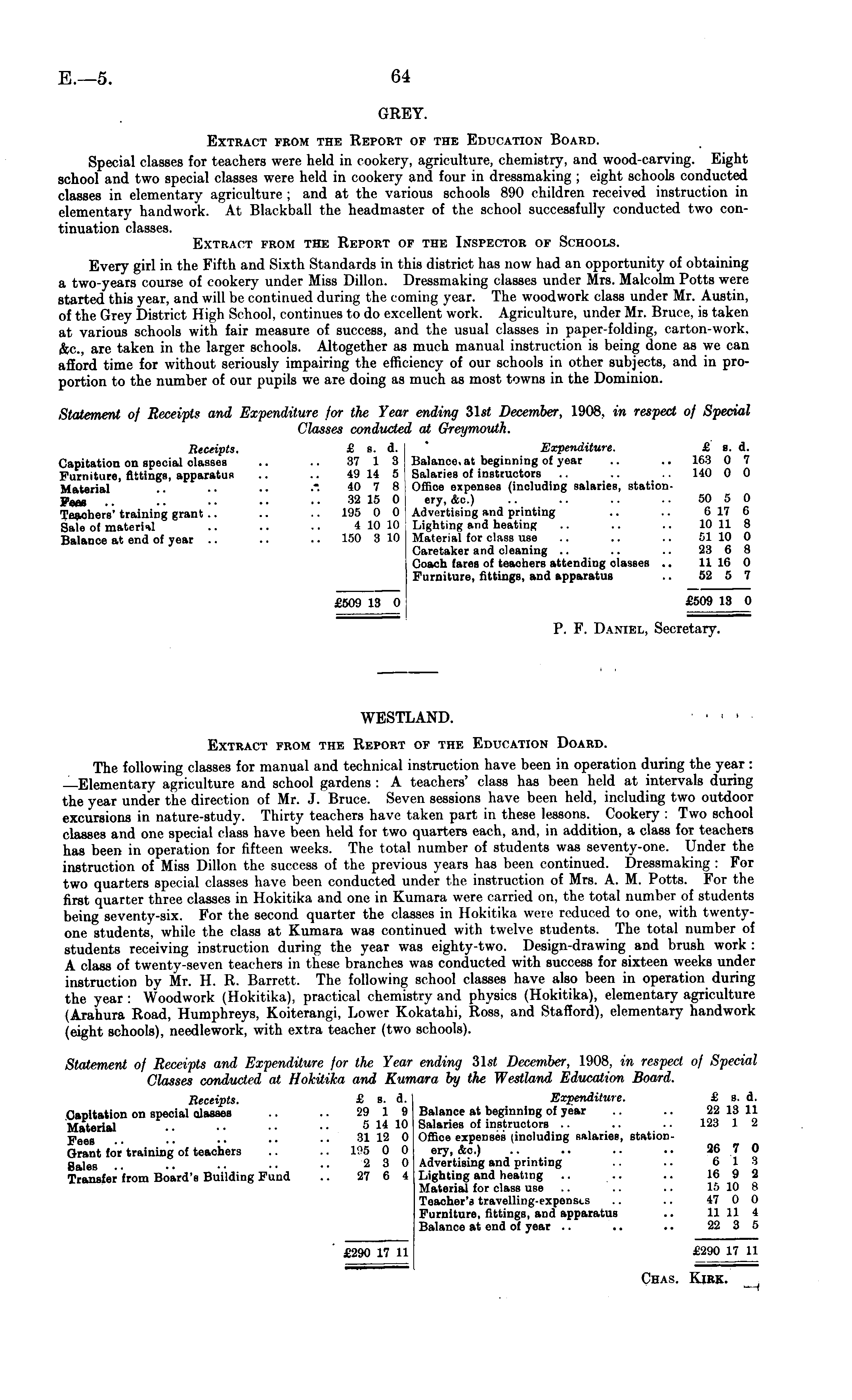 GREY. Extract from the Report of the Education Board. Special classes for teachers were held in cookery, agriculture, chemistry, and wood-carving. Eight school and two special classes were held in cookery and four in dressmaking ; eight schools conducted classes in elementary agriculture ; and at the various schools 890 children received instruction in elementary handwork. At Blackball the headmaster of the school successfully conducted two continuation classes. Extract from the Report of the Inspector of Schools. Every girl in the Fifth and Sixth Standards in this district has now had an opportunity of obtaining a two-years course of cookery under Miss Dillon. Dressmaking classes under Mrs. Malcolm Potts were started this year, and will be continued during the coming year. The woodwork class under Mr. Austin, of the Grey District High School, continues to do excellent work. Agriculture, under Mr. Bruce, is taken at various schools with fair measure of success, and the usual classes in paper-folding, carton-work. &c, are taken in the larger schools. Altogether as much manual instruction is being done as we can afford time for without seriously impairing the efficiency of our schools in other subjects, and in proportion to the number of our pupils we are doing as much as most towns in the Dominion. Statement of Receipts and Expenditure for the Year ending 31st December, 1908. in respect of Special Classes conducted at Grey mouth. Receipts. £ s. d. Expenditure. £ s. d. Capitation on special classes .. .. 37 1 3 \ Balance, at beginning of year .. .. 163 0 7 Furniture, fittings, apparatus .. .. 49 14 5 Salaries of instructors .. .. .. 140 0 0 Material •• •• •"• 40 7 8 Office expenses (including salaries, stationPees .. .. •• •• ■• 32 15 0 ery, &c.) .. .. .. .. 50 5 0 Teachers' training grant .. .. .. 195 0 0 Advertising and printing .. .. 6 17 6 Sale of material .. .. .. 4 10 10 ! Lighting and heating .. .. .. 10 11 8 Balance at end of year .. .. .. 150 3 10 Material for class use .. .. .. 51 10 0 Caretaker and cleaning .. .. .. 23 6 8 Coach fares of teachers attending classes .. 11 16 0 Furniture, fittings, and apparatus .. 52 5 7 £509 13 0 £509 13 0 P. F. Daniel, Secretary. WESTLAND. ' ' ' Extract from the Report of the Education Doard. The following classes for manual and technical instruction have been in operation during the year : —Elementary agriculture and school gardens : A teachers' class has been held at intervals during the year under the direction of Mr. J. Bruce. Seven sessions have been held, including two outdoor excursions in nature-study. Thirty teachers have taken part in these lessons. Cookery : Two school classes and one special class have been held for two quarters each, and, in addition, a class for teachers has been in operation for fifteen weeks. The total number of students was seventy-one. Under the instruction of Miss Dillon the success of the previous years has been continued. Dressmaking : For two quarters special classes have been conducted under the instruction of Mrs. A. M. Potts. For the first quarter three classes in Hokitika and one in Kumara were carried on, the total number of students being seventy-six. For the second quarter the classes in Hokitika were reduced to one, with twentyone students, while the class at Kumara was continued with twelve Ktudents. The total number of students receiving instruction during the year was eighty-two. Design-drawing and brush work : A class of twenty-seven teachers in tiiese branches was conducted with success for sixteen weeks under instruction by Mr. H. R. Barrett. The following school classes have also been in operation during the year : Woodwork (Hokitika), practical chemistry and physics (Hokitika), elementary agriculture (Arahura Road, Humphreys, Koiterangi, Lower Kokatahi, Ross, and Stafford), elementary handwork (eight schools), needlework, with extra teacher (two schools). Statement of Receipts and Expenditure for the Year ending Slsl December, 1908, in respect of Special Classes conducted at Hokitika and Kumara by the Westland Education Board. Receipts. £ s. d. Expenditure. £ s. d. Capitation on special classes .. .. 29 1 9 Balance at beginning of year .. .. 22 13 11 Material .. ■ • • • • ■ 5 14 10 Salaries of instructors .. .. .. 123 1 2 p eeB .. .. .. .. 31 12 0 Office expenses (including salaries, stationGrant for training of teachers .. .. 198 0 0 ery, &c.) .. .. .. .. 26 7 0 g a ] es .. .. .. .. .. 230 Advertising and printing .. .. I. 1 3 Transfer from Board's Building Fund .. 27 6 4 Lighting and heating .. .. .. 10 9 2 Material for class use .. .. .. 15 10 8 Teacher's travelling-expenses .. .. 47 0 0 Furniture, fittings, and apparatus .. 11 11 4 Balance at end of year .. .. .. 22 3 5 £290 17 11 £290 17 11 Chas. Kirk. _