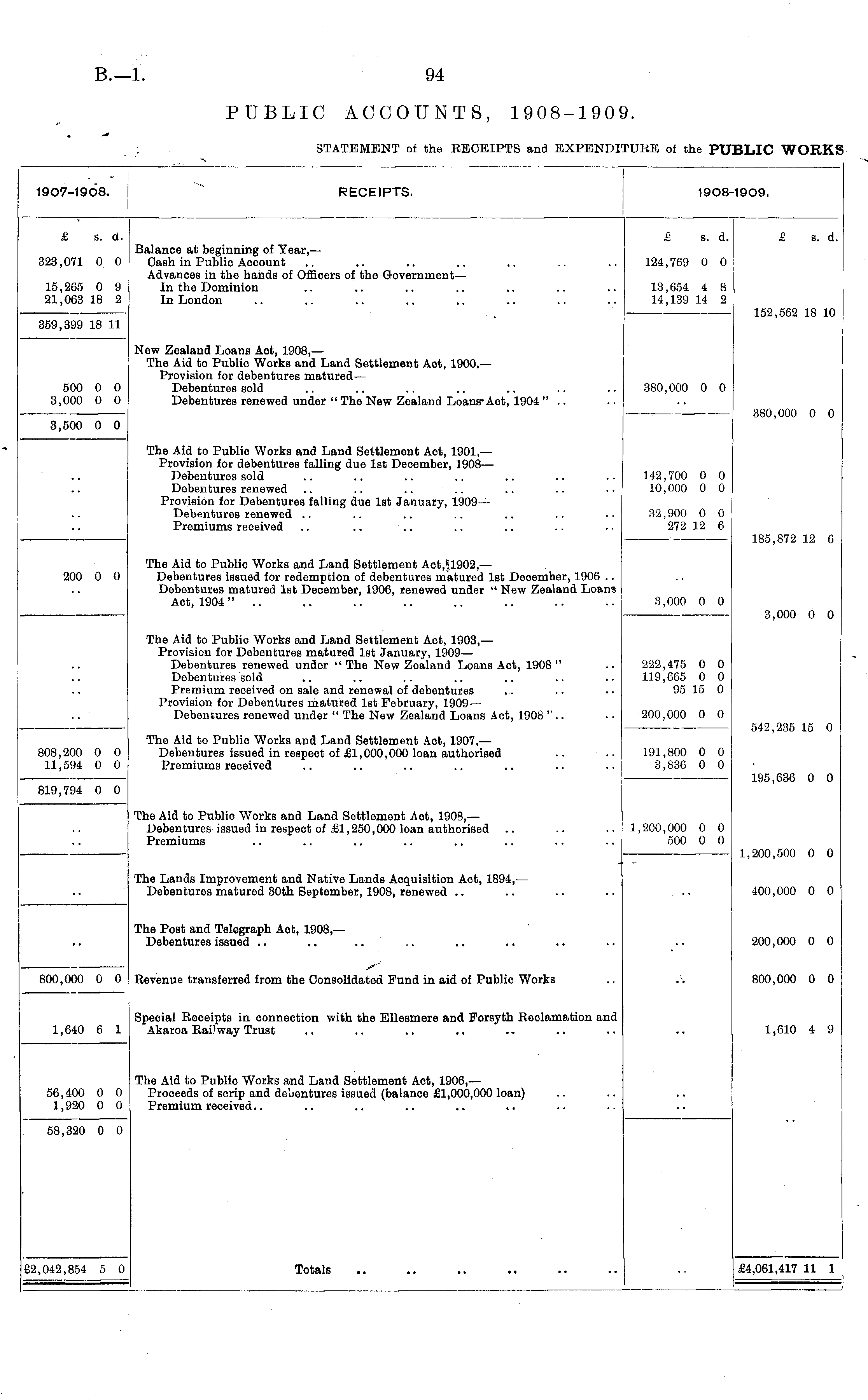 1907-1908. ! RECEIPTS. 1908-1909. £ s. d. £ s. d. £ s. d. 323,071 0 0 15,265 0 9 21,063 18 2 Balance at beginning of Year, — Cash in Public Aocount Advances in the hands of Officers of the Government— In the Dominion In London 124,769 0 0 13,654 4 8 14,139 14 2 152,562 18 10 359,399 18 11 New Zealand Loans Aot, 1908, — The Aid to Public Works and Land Settlement Aot, 1900,— Provision for debentures matured — Debentures sold Debentures renewed under " The New Zealand Loans - Act, 1904 " .. 380,000 0 0 380,000 0 0 500 0 0 3,000 0 0 3,500 0 0 The Aid to Publio Works and Land Settlement Act, 1901,— Provision for debentures falling due 1st December, 1908 — Debentures sold Debentures renewed Provision for Debentures falling due 1st January, 1909— Debentures renewed Premiums reoeived 142,700 0 0 10,000 0 0 185,872 12 6 32,900 0 0 272 12 6 200 0 0 The Aid to Publio Works and Land Settlement Act,«1902,— Debentures issued for redemption of debentures matured 1st Deoember, 1906 .. Debentures matured 1st December, 1906, renewed under " New Zealand Loans Act, 1904" .. 3,000 0 0 3,000 0 0 The Aid to Publio Works and Land Settlement Act, 1903,— Provision for Debentures matured 1st January, 1909— Debentures renewed under " The New Zealand Loans Act, 1908 " Debentures sold Premium received on sale and renewal of debentures Provision for Debentures matured 1st February, 1909 — Debentures renewed under " The New Zealand Loans Act, 1908 ".. 222,475 0 0 119,665 0 0 95 15 0 542,235 15 0 200,000 0 0 808,200 0 0 11,594 0 0 The Aid to Publio Works and Land Settlement Act, 1907, — Debentures issued in respect of £1,000,000 loan authorised Premiums received 191,800 0 0 3,836 0 0 819,794 0 0 The Aid to Publio Works and Land Settlement Aot, 1908,— Debentures issued in respect of £1,250,000 loan authorised Premiums 195,636 0 0 1,200,000 0 0 500 0 0 1,200,500 0 0 The Lands Improvement and Native Lands Acquisition Aot, 1894, — Debentures matured 30th September, 1908, renewed 400,000 0 0 The Post and Telegraph Aot, 1908,— Debentures issued .. 200,000 0 0 800,000 0 0 y' Revenue transferred from the Consolidated Fund in aid of Public Works 800,000 0 0 Special Receipts in connection with the Ellesmere and Forsyth Reclamation and Akaroa Railway Trust 1,610 4 9 1,640 6 1 56,400 0 0 1,920 0 0 The Aid to Public Works and Land Settlement Act, 1906,— Prooeeds of scrip and debentures issued (balance £1,000,000 loan) Premium received.. 58,320 0 0 Totals ,2,042,854 5 0 £4,061,417 11 1