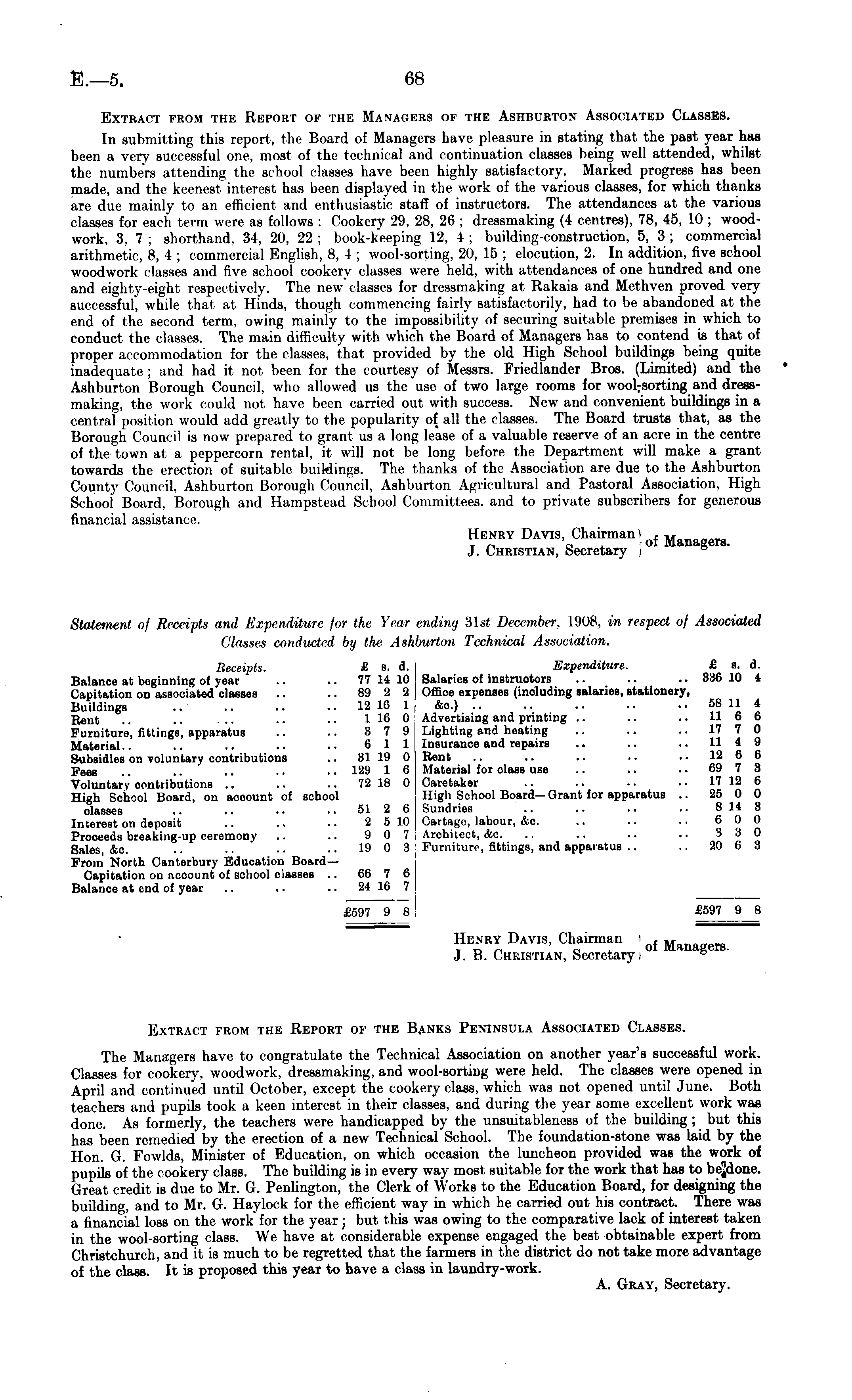 Extract from the Report of the Managers of the Ashburton Associated Classes. In submitting this report, the Board of Managers have- pleasure in stating that the past year has been a very successful one, most of the technical and continuation classes being well attended, whilst the numbers attending the school classes have- been highly satisfactory. Marked progress has been made, and the keenest interest has been displayed in the work of the various classes, for which thanks are due mainly to an efficient and enthusiastic staff of instructors. The attendances at the various classes for each term were as follows : Cookery 29, 28, 26 ; dressmaking (4 centres), 78, 45, 10 ; woodwork, 3, 7 ; shorthand. 34, 20, 22 ; book-keeping 12, 4 ; building-construction, 5, 3 ; commercial arithmetic, 8, 4 ; commercial English, 8, 4 ; wool-sorting, 20, 15 ; elocution, 2. In addition, five school woodwork classes and five school cookery classes were held, with attendances of one hundred and one and eighty-eight respectively. The new classes for dressmaking at Rakaia and Methven proved very successful, while that at Hinds, though commencing fairly satisfactorily, had to be abandoned at the end of the second term, owing mainly to the impossibility of securing suitable premises in which to conduct the classes. The main difficulty with which the Board of Managers has to contend is that of proper accommodation for the classes, that provided by the old High School buildings being quite inadequate ; and had it not been for the courtesy of Messrs. Friedlander Bros. (Limited) and the Ashburton Borough Council, who allowed us the use of two large rooms for wool-sorting and dressmaking, the work could not have been carried out with success. New and convenient buildings in a central position would add greatly to the popularity of all the classes. The Board trusts that, as the Borough Council is now prepared to grant us a long lease of a valuable reserve of an acre in the centre of tic town at a peppercorn rental, it will not be long before the Department will make a grant towards the- erection of suitable buildings. The thanks of the Association are due to the Ashburton County Council, Ashburton Borough Council, Ashburton Agricultural and Pastoral Association, High School Board, Borough and Hampstead School Committees, and to private subscribers for generous financial assistance-. llknry Davis, Chairman iof M erB J. Christian, Secretary i 8 Statement of Receipts and Expenditure for the Year ending 31st December, 1908, in respect ol Associated Classes conducted by the Ashburton Technical Association. Receipts. £ s. d. ! Expenditure. £ s. d. Balance at beginning of year .. .. 77 14 10 Salaries of instructors .. .. .. 336 10 4 Capitation on associated classes .. .. 89 2 2 Office expenses (including salaries, stationery, Buildings 12 16 1 etc.) 58 11 4 Rent .. .. ... .. •■1 16 0 Advertising and printing .. .. .. 11 6 6 Furniture, fittings, apparatus .. .. 37 9 Lighting and heating .. .. .. 17 7 0 Material.. .. .. .. .. 611 Insurance and repairs .. .. .. 114 9 Subsidies on voluntary contributions .. 81 19 0 Rent .. .. .. .. 12 6 6 Pees .. .. .. . • • • 129 1 6 Material for class use .. .. 69 7 3 Voluntary contributions ~ .. .. 72 18 0 Caretaker .. .. .. .. 17 12 6 High School Board, on account of school High School Board—Grant for apparatus .. 25 0 0 classes .. .. .. ..5126 Sundries .. .. .. .. 8148 Interest on deposit .. .. .. 2 510 Cartage, labour, &o. .. .. .. 6 0 0 Proceeds breaking-up ceremony .. .. 90 7 Architect, &c. .. .. .. .. 33 0 Sales, &c. .. .. .. 19 0 3 Furniture, fittings, and apparatus .. .. 20 6 3 From North Canterbury Education BoardCapitation on account of school classes .. 66 7 0 Balance at end of year .. .. .. 24 16 7 £597 9 8 £597 9 8 I 11 i:\ry Davis, Chairman i , w J. B. Christian, Secretary i g Extract from the Report of the Banks Peninsula Associated Classes. The Managers have to congratulate the Technical Association on another year's successful work. Classes for cookery, woodwork, dressmaking, and wool-sorting were held. The classes were opened in April and continued until October, except the cookery class, which was not opened until June. Both teachers and pupils took a keen interest in their classes, and during the year some excellent work was done. As formerly, the teachers were handicapped by the unsuitableness of the building ; but this has been remedied by the erection of a new Technical School. The foundation-stone was laid by the Hon. G. Fowlds, Minister of Education, on which occasion the luncheon provided was the work of pupils of the cookery class. The building is in every way most suitable for the work that has to bejdone. Great credit is due to Mr. G. Penlington, the Clerk of Works to the Education Board, for designing the building, and to Mr. G. Haylock for the efficient way in which he carried out his contract. There was a financial loss on the work for the year ; but this was owing to the comparative lack of interest taken in the wool-sorting class. We have at considerable expense engaged the best obtainable expert from Christchurch, and it is much to be regretted that the farmers in the district do not take more advantage of the class. It is proposed this year to have a class in laundry-work. A. Gray, Secretary.