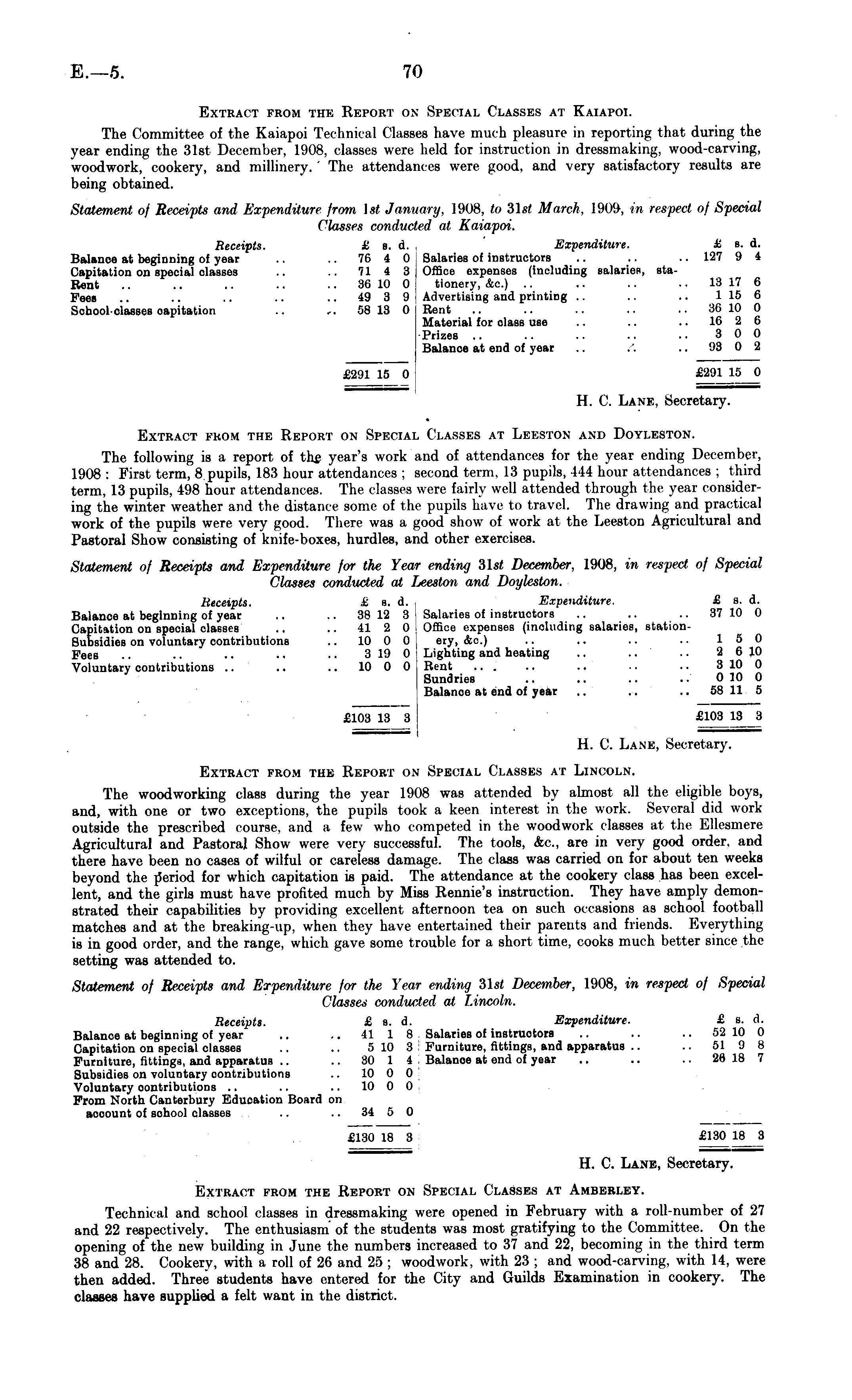Extract from the Report on Special Classes at Kaiapoi. The Committee of the Kaiapoi Technical Classes have much pleasure in reporting that during the year ending the 31st December. 1908, classes were held for instruction in dressmaking, wood-carving, woodwork, cookery, and millinery. The attendances were good, and very satisfactory results are being obtained. Statement of Receipts and Expenditure from \st January, 1908, to 31st March. 1909, in respect of Special Classes conducted at Kaiapoi. Receipts. £ s. d. Expenditure. £ s. d. Balance at beginning of year .. .. 76 4 0 Salaries of instructors .. .. .. 127 9 4 Capitation on special classes .. .. 71 4 3 j Office expenses (including salaries, staRent .. .. .. .. 36 10 0 tionery, &c.) .. .. .. 13 17 6 Fees .. .. .. .. 49 3 9 Advertising and printing .. .. :. 115 6 School-classes oapitation .. ~ 58 13 0 : Rent .. .. .. .. 36 10 0 Material for olass use .. .. .. 16 2 6 Prizes .. .. .. .. .. 300 Balance at end of year .. .. .. 93 0 2 £291 15 0 £291 15 0 H. C. Lane, Secretary. Extract from the Report on Special Classes at Leeston and Doyleston. The following is a report of th£ year's work and of attendances for the year ending December, 1908: First term, 8 pupils, 183 hour attendances ; second term. 13 pupils, 444 hour attendances ; third term, 13 pupils, 498 hour attendances. The classes were fairly well attended through the year considering the winter weather and the distance some of the pupils have to travel. The drawing and practical work of the pupils were very good. There was a good show of work at the Leeston Agricultural and Pastoral Show consisting of knife-boxes, hurdles, and other exercises. Statement of Receipts and Expenditure for the Year ending 31st December, 1908, in respect of Special Classes conducted at Leeston and Doyleston. Receipts. £ s. d. Expenditure. £ s. d. Balance at beginning of year .. .. 38 12 3 Salaries of instructors .. .. .. 37 10 0 Capitation on special classes .. .. 41 2 0 Office expenses (including salaries, stationSubsidies on voluntary contributions .. 10 00 ; cry, &c.) .. .. .. .. 15 0 Fees .. .. .. .. •. 319 0 Lighting and heating .. .. .. 2 610 Voluntary contributions .. .. .. 10 0 0 Rent .. .. .. 310 0 Sundries .. .. .. .. 0 10 0 Balance at end of year .. .. .. 58 11 5 £103 13 3 £103 13 3 H. C. Lane, Secretary. Extract from the Report on Special Classes at Lincoln. The woodworking class during the year 1908 was attended by almost all the eligible boys, and, with one or two exceptions, the pupils took a keen interest in the work. Several did work outside the prescribed course, and a few who competed in the woodwork classes at the Ellesmere Agricultural and Pastoral Show were very successful. The tools, &c, are in very good order, and there have been no cases of wilful or careless damage. The class was carried on for about ten weeks beyond the p"eriod for which capitation is paid. The attendance at the cookery class has been excellent, and the girls must have profited much by Miss Rennie's instruction. They have amply demonstrated their capabilities by providing excellent afternoon tea on such occasions as school football matches and at the breakiiig-up. when they have entertained their parents and friends. Everything is in good order, and the range, which gave some trouble for a short time, cooks much better since the setting was attended to. Statement of Receipts and Expenditure for the Year ending 31sl December, 1908, in respect of Special Classes conducted at Lincoln. Receipts. £ s. d. Expenditure. £ s. d. Balance at beginning of year .. .. 41 1 8 Salaries of instructors .. .. .. 52 10 0 Capitation on special classes .. .. 510 3 Furniture, fittings, and apparatus .. .. 519 8 Furniture, fittings, and apparatus .. .. 30 1 4 Balance at end of year .. .. .. 26 18 7 Subsidies on voluntary contributions .. 10 0 0 Voluntary contributions .. .. .. 10 0 0 From North Canterbury Education Board on account of school classes .. 34 5 0 £130 18 3 £130 18 3 H. C. Lane, Secretary. Extract from the Report on Special Classes at Amberley. Technical and school classes in dressmaking were opened in February with a roll-number of 27 and 22 respectively. The enthusiasm of the students was most gratifying to the Committee. On the opening of the new building in June the numbers increased to 37 and 22, becoming in the third term 38 and 28. Cookery, with a roll of 26 and 25 ; woodwork, with 23 ; and wood-carving, with 14, were then added. Three students have entered for the City and Guilds Examination in cookery. The classes have supplied a felt want in the district.