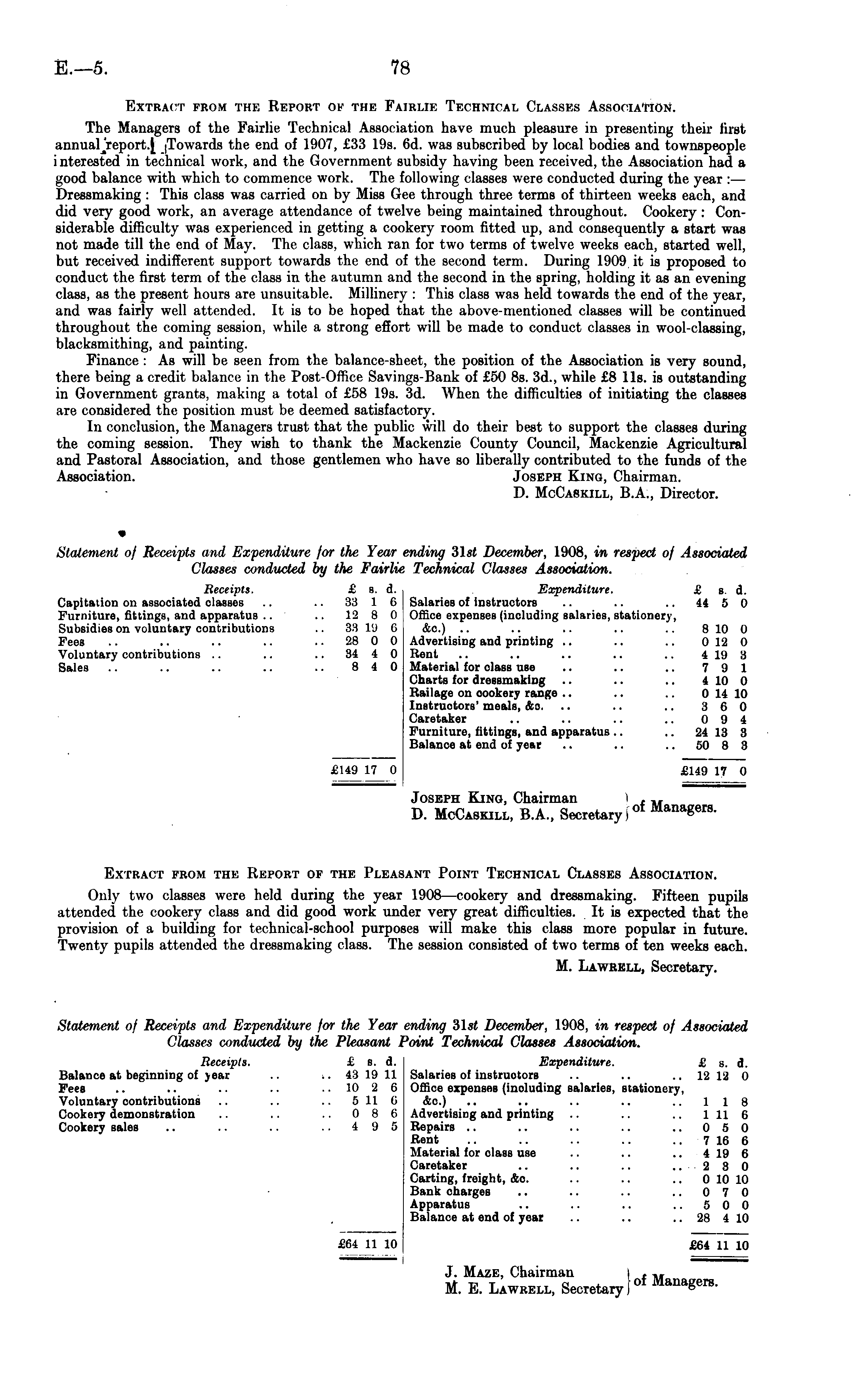 Extract from the Report of thf. Fairlie Technical Classes Association. The Managers of the Fairlie Technical Association have much pleasure in presenting their first annuarreport.[ (Towards the end of 1907, £33 19s. 6d. was subscribed by local bodies and townspeople i nterested in technical work, and the Government subsidy having been received, the Association had a good balance with which to commence work. The following classes were conducted during the year : — Dressmaking : This class was carried on by Miss Gee through three terms of thirteen weeks each, and did very good work, an average attendance of twelve being maintained throughout. Cookery : Considerable difficulty was experienced in getting a cookery room fitted up, and consequently a start was not made till the end of May. The class, which ran for two terms of twelve weeks each, started well, but received indifferent support towards the end of the second term. During 1909 it is proposed to conduct the first term of the class in the autumn and the second in the spring, holding it as an evening class, as the present hours are unsuitable. Millinery : This class was held towards the end of the year, and was fairly well attended. It is to be hoped that the above-mentioned classes will be continued throughout the coming session, while a strong effort will be made to conduct classes in wool-classing, blacksmithing, and painting. Finance : As will be seen from the balance-sheet, the position of the Association is very sound, there being a credit balance in the Post-Office Savings-Bank of £50 Bs. 3d., while £8 lis. is outstanding in Government grants, making a total of £58 19s. 3d. When the difficulties of initiating the classes are considered the position must be deemed satisfactory. In conclusion, the Managers trust that the public will do their best to support the classes during the coming session. They wish to thank the Mackenzie County Council, Mackenzie Agricultural and Pastoral Association, and those gentlemen who have so liberally contributed to the funds of the Association. Joseph King, Chairman. D. McCaskill, 8.A., Director. m Statement of Receipts and Expenditure for the Year ending 31st December, 1908, in respect of Associated Classes conducted by the Fairlie Technical Classes Association. Receipts. £ s. d. Expenditure. £ a. d. Capitation on associated classes .. .. 33 1 6 Salaries of instructors .. .. .. 44 5 0 Furniture, fittings, and apparatus .. .. 12 8 0 Office expenses (including salaries, stationery, Subsidies on voluntary contributions .. 33 19 6 &c.) .. .. .. .. .. 810 0 Fees .. .. .. .. 28 0 0 Advertising and printing .. .. .. 012 0 Voluntary contributions .. .. .. 34 4 0 Rent .. .. .. .. .. 419 3 Sales .. .. .. .. .. 840 Material for class use .. .. .. 7 9 1 Charts for dressmaking .. .. .. 410 0 Railage on cookery range .. .. .. 0 14 10 Instructors' meals, &c. .. .. .. 3 6 0 Caretaker .. .. .. .. 0 9 4 Furniture, fittings, and apparatus .. .. 24 13 3 Balance at end of year .. .. .. 50 8 3 £149 17 0 £149 17 0 Joseph King, Chairman I f M D. McCaskill, 8.A., Secretary) 01 Mana g erB - Extract from the Report of the Pleasant Point Technical Classes Association. Only two classes were held during the year 1908—cookery and dressmaking. Fifteen pupils attended the cookery class and did good work under very great difficulties. It is expected that the provision of a building for technical-school purposes will make this class more popular in future. Twenty pupils attended the dressmaking class. The session consisted of two terms of ten weeks each. M. Lawrell, Secretary. Statement of Receipts and Expenditure for the Year ending 31st December, 1908, in respect of Associated Classes conducted by the Pleasant Point Technical Classes Association. Receipts. £ s. d. Expenditure. £ s. d. Balance at beginning of year .. .. 43 19 11 Salaries of instructors .. .. .. 12 12 0 Fees .. .. .. .. 10 2 6 Office expenses (including salaries, stationery, Voluntary contributions .. .. .. 511 6 &c.) .. .. .. .. ..118 Cookery demonstration .. .. .. 0 8 6 Advertising and printing .. .. .. 111 6 Cookery sales .. .. .. ..495 Repairs .. .. .. .. ..050 Rent .. .. .. .. 7 16 6 Material for class use .. .. .. 419 6 Caretaker .. .. .. ..230 Carting, freight, &o. .. .. 0 10 10 Bank charges .. .. .. ..070 Apparatus .. .. .. ..500 Balance at end of year .. .. .. 28 410 £64 11 10 £64 11 10 J. Maze, Chairman i ~, M. E. Lawrell, Secretary) of M *™&™-