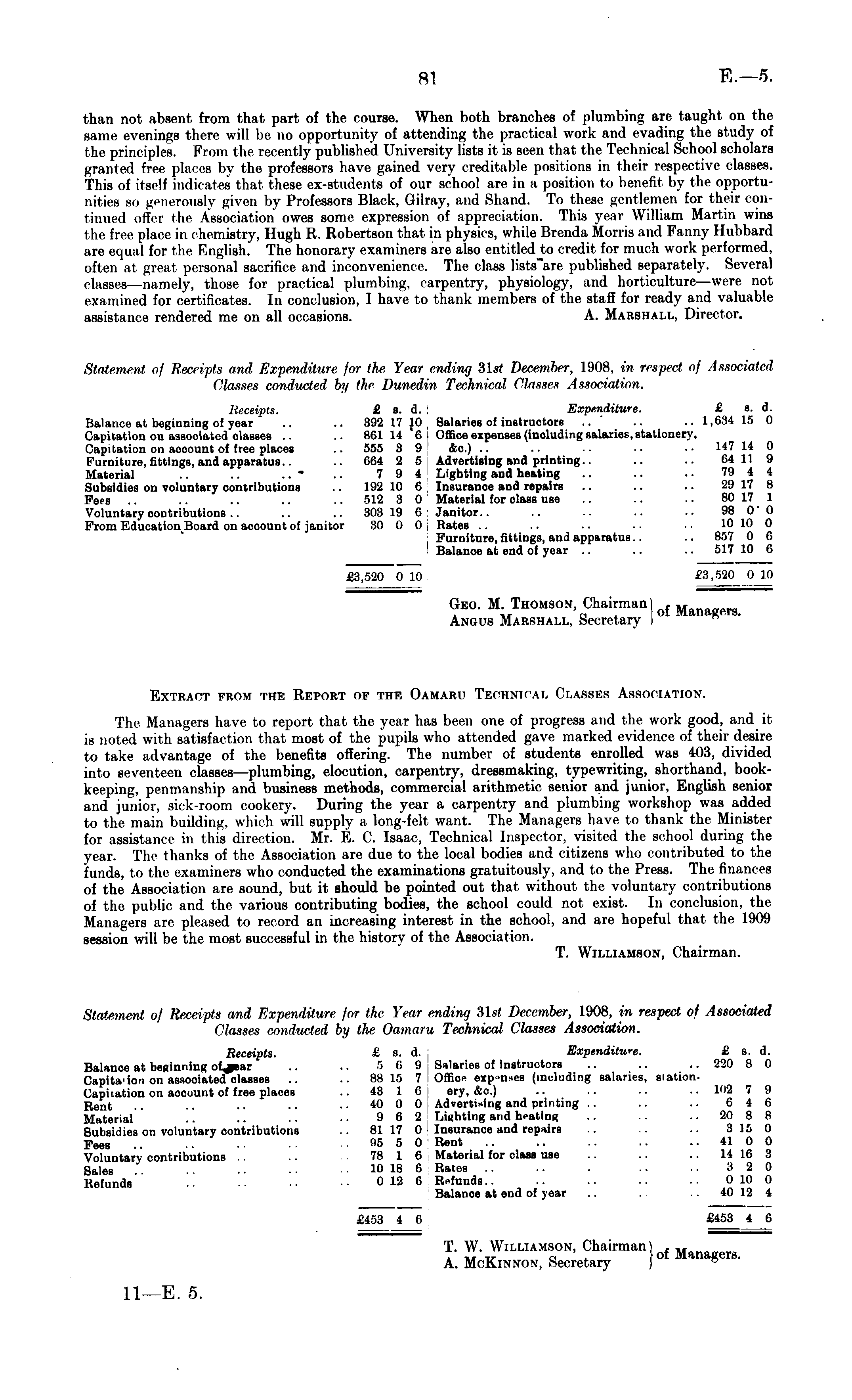 than not absent from that part of the course. When both branches of plumbing are taught on the same evenings there will be no opportunity of attending the practical work and evading the study of the prim iples. From the recently published University lists it is seen that the Technical School scholars granted free places by the professors have gained very creditable positions in their respective classes. This of itself indicates that these ex-students of our school are in a position to benefit by the opportunities so generously given by Professors Black, Gilray, and Shand. To these gentlemen for their continued offer the Association owes some expression of appreciation. This year William Martin wins t In- free place In chemistry, Hugh R. Robertson that in physics, while Brenda Morris and Fanny Hubbard are equal for the English. The honorary examiners are also cut it led to credit for much work performed, often at great personal sacrifice and inconvenience. The class lists'are published separately. Several classes—namely, those for practical plumbing, carpentry, physiology, and horticulture—were not examined for certificates. In conclusion, I have to thank members of the staff for ready and valuable assistance rendered me on all occasions. A. Marshall, Director. Statement of Receipts and Expenditure for the, Year ending 31st December, 1908, in respect of Issociated Classes conducted by the Dunedin Technical Classes Association. Receipts. £ s. d. Expenditure. £ 8. d. Balance at beginning of year .. .. 392 17 10 Salaries of instructors .. .. .. 1,634 15 0 Capitation on associated olasses .. .. 86114*6 Office expenses (inoluding salaries, stationery, Capitation on account of free places .. 555 3 9 &o.) .. .. •• I*7 14 0 Furniture, fittings, and apparatus.. .. 664 2 5 Advertising and printing.. .. 64 11 9 Material .. .. ..* .. 794 Lighting and heating .. .. .. 79 4 4 Subsidies on voluntary contributions .. 192 10 6 Insurance and repairs .. .. .. 29 17 8 Fees .. .. 512 3 0 Material for class use .. .. 80 17 1 Voluntary contributions .. .. .. 303 19 6 Janitor.. .. 98 00 From Education Board on account of janitor 30 0 0 Rates .. .. .. 10 10 0 Furniture, fittings, and apparatus.. .. 857 0 6 Balance at end of year .. .. 517 10 6 £3,520 0 10 £3,520 0 10 Geo. M. Thomson, Chairman[ . Managers Angus Marshall, Secretary I Extract from the Report of the Oamaru Technical Classes Association. The Managers have to report that the year has been one of progress and the work good, and it is noted with satisfaction that most of the pupils who attended gave marked evidence of their desire to take advantage of the benefits offering. The number of students enrolled was 403, divided into seventeen classes—plumbing, elocution, carpentry, dressmaking, typewriting, shorthand, bookkeeping, penmanship and business methods, commercial arithmetic senior and junior, English senior and junior, sick-room cookery. During the year a carpentry and plumbing workshop was added to the main building, which will supply a long-felt want. The Managers have to thank the Minister for assistance in this direction. Mr. E. C. Isaac, Technical Inspector, visited the school during the year. The thanks of the Association are due to the local bodies and citizens who contributed to the funds, to the examiners who conducted the examinations gratuitously, and to the Press. The finance's of the Association are sound, but it should be pointed out that without the voluntary contributions of the public and the various contributing bodies, the school could not exist. In conclusion, the Managers are pleased to record an increasing interest in the school, and are hopeful that the 1909 session will be the most successful in the history of the Association. T. Williamson, Chairman. Statement of Receipts and Expenditure for the Year ending 31st December, 1908, in respect of Associated Classes conducted by the Oamaru Technical Classes Association. Receipts. £ s. d. j Expenditure. £ s. d. Balance at beginning otjjear .. .. 5 6 9! Salaries of instructors .. .. .. 220 8 0 Capita'ion on associated olasses .. .. 88 15 7 : Offioe exp-nses (including salaries, siationCapication on aocount of free places .. 43 1 6 cry, &c.) .. .. .. 102 7 9 Rent .. .. .. •• .. 40 0 0 Advertising and printing .. .. .. 6 4 6 Material .. .. .. •• 962 Liahting and heating .. .. 20 8 8 Subsidies on voluntary contributions 81 17 0 Insurance and repairs .. 315 0 Fees .. .. • • . . 95 5 0 Rent .. .. .. .. 41 0 0 Voluntary contributions .. 78 1 6 Material for class use 14 16 3 Sales .. ■ • .. 10 18 6 Rates .. .. . 320 Refunds 0 12 6 Refunds.. .. .. .. 0 10 0 Balance at end of year .. 40 12 4 £453 4 6 £453 4 6 T. W. Williamson, , „ A. MoKINNON, Secretary