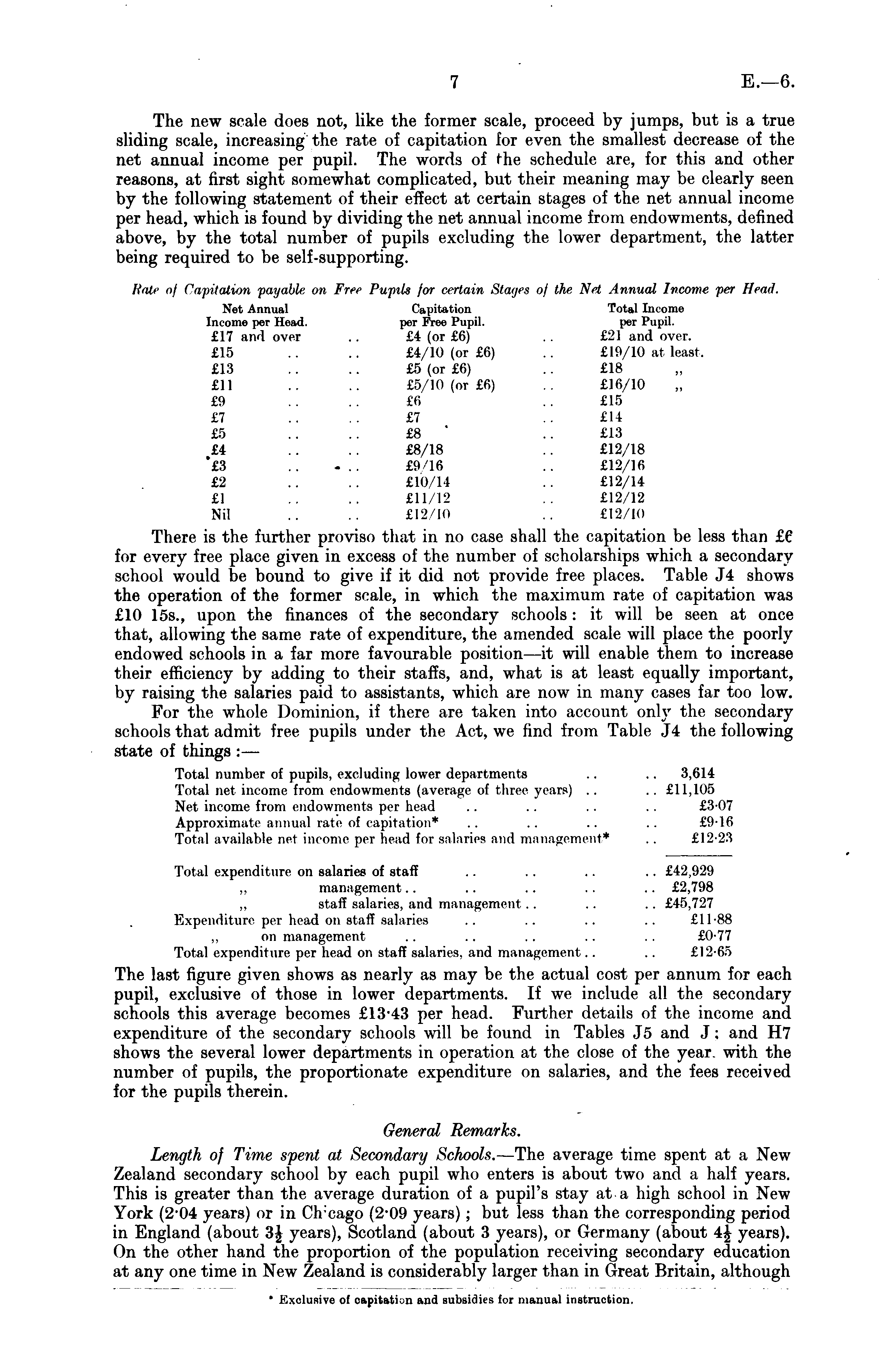 The new scale does not, like the former scale, proceed by jumps, but is a true sliding scale, increasing the rate of capitation for even the smallest decrease of the net annual income per pupil. The words of the schedule are, for this and other reasons, at first sight somewhat complicated, but their meaning may be clearly seen by the following statement of their effect at certain stages of the net annual income per head, which is found by dividing the net annual income from endowments, defined above, by the total number of pupils excluding the lower department, the latter being required to be self-supporting. Rate of Capitation payable on Free Pupils for certain Stages of the Net Annual Income per Iliad. Net Annual Capitation Total Income Income per Head. per Free Pupil. per Pupil. £17 and over .. £4 (or £6) £21 and over. £15 .. .. £4/10 (or £6) £19/10 at hast . £13 .. £5 (or £6) .. £18 £11 .. .. £5/10 (or £6) f 16/10 £9 £6 £15 £7 .. .. £7 £14 £5 .. .. £8 .. £13 £4 .. £8/18 £12/18 *£3 ... E9/16 £12/16 £2 .. £10/14 .. £12/14 £1 .. .. £11/12 .. £12 12 Nil .. .. £12/10 .. £12 in There is the further proviso that in no case shall the capitation be less than £6 for every free place given in excess of the number of scholarships which a secondary school would be bound to give if it did not provide free places. Table J4 shows the operation of the former scale, in which the maximum rate of capitation was £10 155., upon the finances of the secondary schools: it will be seen at once that, allowing the same rate of expenditure, the amended scale will place the poorly endowed schools in a far more favourable position—it will enable them to increase their efficiency by adding to their staffs, and, what is at least equally important, by raising the salaries paid to assistants, which are now in many cases far too low. For the whole Dominion, if there are taken into account only the secondary schools that admit free pupils under the Act, we find from Table J4 the following state of things :— Total number of pupils, excluding lower departments .. 3,614 Total net income from endowments (average of three years) .. .. £11,105 Net income from endowments per head .. .. .. .. £3-07 Approximate annual rate of capitation* .. .. .. .. £9-Hi Total available net income per head for salaries and management* .. £12-23 Total expenditure on salaries of staff .. .. .. .. £42,929 management.. .. .. .. .. £2,798 „ staff salaries, and management .. .. .. £45,727 Expenditure per head on stall salaries .. .. .. .. £11-88 „ on management .. .. . . .. . . £0-77 Total expenditure per head on staff salaries, and management.. £12-66 The last figure given shows as nearly as may be the actual cost per annum for each pupil, exclusive of those in lower departments. If we include all the secondary schools this average becomes £13-43 per head. Further details of the income and expenditure of the secondary schools will be found in Tables J5 and J; and H7 shows the several lower departments in operation at the close of the year, with the number of pupils, the proportionate expenditure on salaries, and the fees received for the pupils therein. General Remarks. Length of Time spent at Secondary Schools. —The average time spent at a New Zealand secondary school by each pupil who enters is about two and a half years. This is greater than the average duration of a pupil's stay at a high school in New York (2*04 years) or in Clrcago (2*09 years); but less than the corresponding period in England (about 3£ years), Scotland (about 3 years), or Germany (about 4£ years). On the other hand the proportion of the population receiving secondary education at any one time in New Zealand is considerably larger than in Great Britain, although * Exclusive of capitation and subsidies for manual instruction.