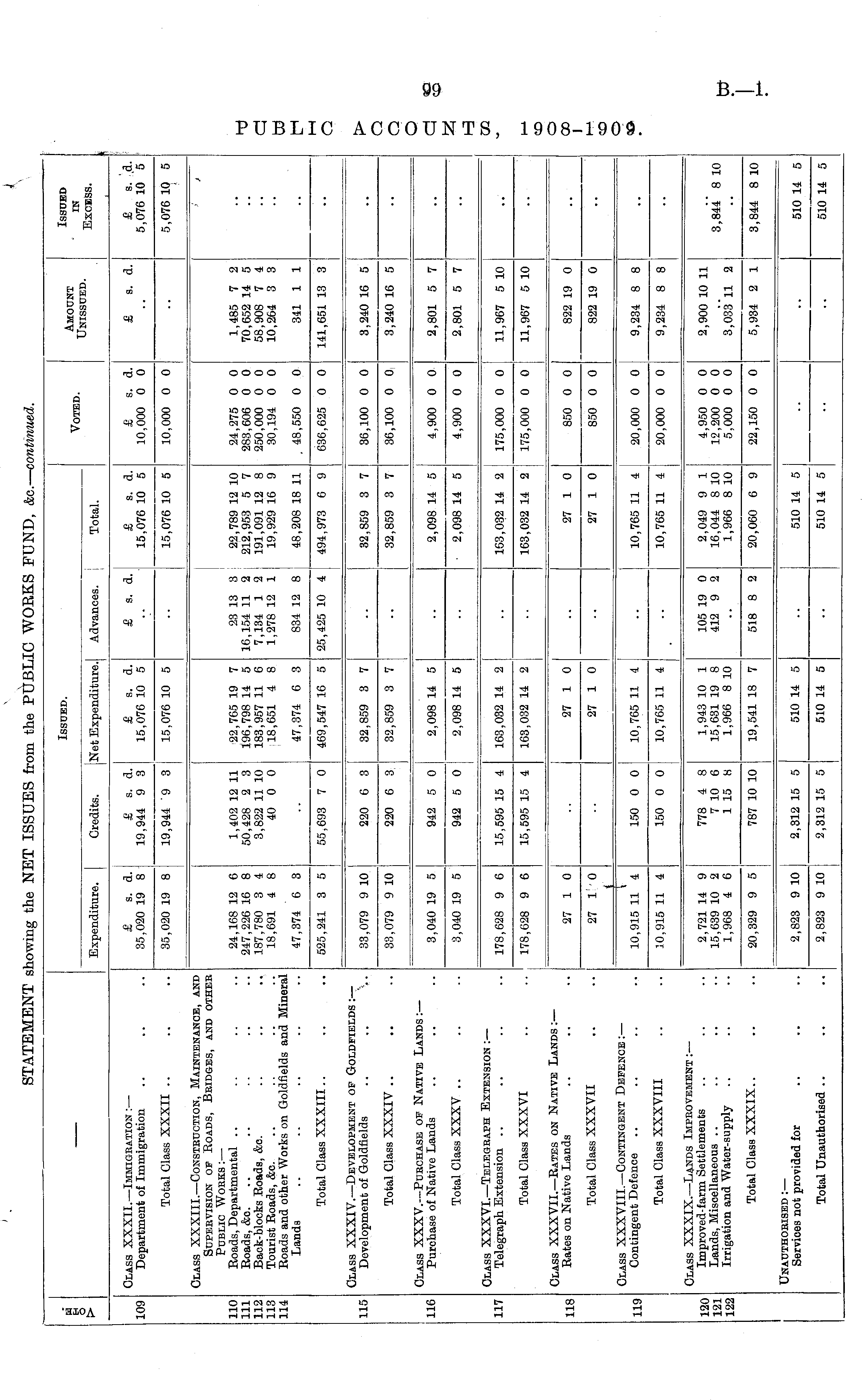 IH O Expenditure. Issued. Voted. Amount Unissued. Issued in Excess. Credits. Net Expenditure. Advances. Total. Class XXXII. —Immigration :— Department of Immigration £ s. d. 35,020 19 8 £ s. d. 19,944 9 3 £ s. d. 15,076 10 5 £ s. d. £ s. d. 15,076 10 5 15,076 10 5 £ s. d. 10,000 0 0 £ s. d. £ s. d. 5,076 10 5 109 Total Class XXXII 35,020 19 8 19,944 9 3 15,076 10 5 •• 10,000 0 0 5,076 10 5 110 111 112 113 114 Class XXXIII. —Construction, Maintenance, and Supervision op Roads, Bridges, and other Public Works :— Roads, Departmental Roads, &o. Back-blocks Roads, &c. Tourist Roads, &c. Roads and other Works on Goldfields and Mineral Lands 24,168 12 6 247,226 16 8 187,780 3 4 18,691 4 8 1,402 12 11 50,428 2 3 3,822 11 10 40 0 0 22,765 19 7 196,798 14 5 183,957 11 6 18,651 4 8 23 13 3 16,154 11 2 7,134 1 2 1,278 12 1 22,789 12 10 212,953 5 7 191,091 12 8 19,929 16 9 24,275 0 0 283,606 0 0 250,000 0 0 30,194 0 0 1,485 7 2 70,652 14 5 58,908 7 4 10,264 3 3 / 47,374 6 3 525,241 3 5 47,374 6 3 834 12 8 48,208 18 11 , 48,550 0 0 341 1 1 Total Class XXXIII.. 55,693 7 0 469,547 16 5 636,625 0 0 25,425 10 4 494,973 6 9 141,651 13 3 Class XXXIV. —Development oe Goldfields :— Development of Goldfields 115 33,079 9 10 220 6 3 32,859 3 7 32,859 3 7 36,100 0 0 3,240 16 5 Total Class XXXIV .. 33,079 9 10 220 6 3 32,859 3 7 32,859 3 7 36,100 0 0 3,240 16 5 Class XXXV. —Purchase of Native Lands :— Purchase of Native Lands 116 3,040 19 5 3,040 19 5 942 5 0 2,098 14 3 2,098 14 5 4,900 0 0 2,801 5 7 Total Class XXXV .. 942 5 0 2,098 14 5 2,098 14 5 4,900 0 0 2,801 5 7 Class XXXVI. —Telegraph Extension :— Telegraph Extension 117 178,628 9 6 15,595 15 4 163,032 14 2 163,032 14 2 175,000 0 0 11,967 5 10 Total Class XXXVI 178,628 9 6 15,595 15 4 163,032 14 2 163,032 14 2 175,000 0 0 11,967 5 10 Class XXXVII. —Rates on Native Lands :— Rates on Native Lands 118 27 1 0 27 1 0 27 1 0 850 0 0 822 19 0 Total Class XXXVII 27 1 0 27 1 0 27 1 0 850 0 0 822 19 0 Class XXXVIII. —Contingent Defence: — Contingent Defence 119 10,915 11 4 150 0 0 10,765 11 4 10,765 11 4 20,000 0 0 9,234 8 8 Total Glass XXXVIII 10,915 11 4 150 0 0 10,765 11 4 10,765 11 4 20,000 0 0 9,234 8 8 120 121 122 Class XXXIX. —Lands Improvement :— Improved-farm Settlements Lands, Miscellaneous Irrigation and Water-supply 2,721 14 9 15,639 10 2 1,968 4 6 778 4 8 7 10 6 1 15 8 1,943 10 1 15,631 19 8 1,966 8 10 105 19 0 412 9 2 2,049 9 1 16,044 8 10 1,966 8 10 4,950 0 0 12,200 0 0 5,000 0 0 2,900 10 11 3,844* 8 10 3,033*11 2 Total Class XXXIX.. 20,329 9 5 787 10 10 19,541 18 7 518 8 2 20,060 6 9 22,150 0 0 5,934 2 1 3,844 8 10 Unauthorised :— Services not provided for 2,823 9 10 2,312 15 5 510 14 5 510 14 5 510 14 5 Total Unauthorised 2,823 9 10 2,312 15 5 510 14 5 510 14 5 510 14 5
