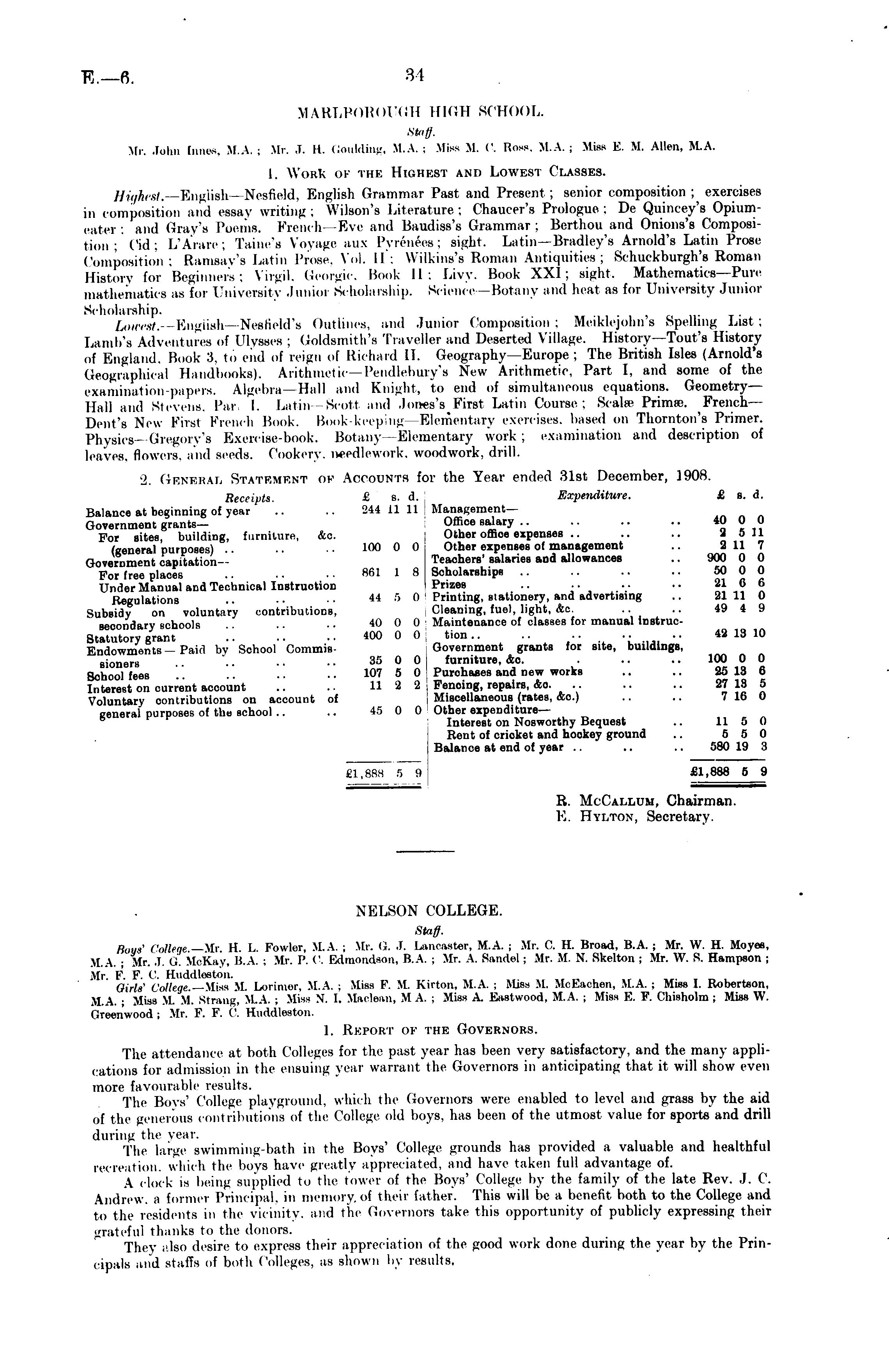 MARLBOROUGH HIGH SCHOOL. Staff. Mr. John Inncs. M.A. ; Mr. .1. 11. Gouklmg, M.A : Mis- M. ('. tVose, M.A. ; MJM Iv M. Alien. ,M.A. 1. Work of thb Hiohest and Lowest Classes. Highest. -English -Nesfield, English Grammar Past and Present ; senior composition ; exercises in composition and essay writing; Wilson's Literature: Chaucer's Prologue.; De Quincey's Opiumeater; and Gray's Poems. French Eve and Bandiss's Grammar; Berthou and Onions's Composition ; Ciil: L'Arare; Taine'a Voyage aux Pyrenees; sight. Latin Bradley's Arnold's Latin Prose Composition; Ramsay's l.atiu Prose, Vol. [I; Wilkins's Hnin2.ll Antiquities; Schuckburgh's Roman Hiatory for Begi irs; Virgil, Georgic, Hook II; lavy, Hook XXI: sight. Mathematics Pure mathematics as for University Junioi Scholarship. Science Botany and heat as for University Junior Scholarship. ? . Lowest. English Nesfield's Outlines, and Junior Composition; Meiklejohns Spelling Hist; Lamb's Adventures of Ulysses; Goldsmith's Traveller and Deserted Village. Hiatory Tout's History nf England, Hunk 3, to end of reign of Richard 11. Geography Europe; The British Isles (Arnold's Geographical Handbooks). Arithmetic New Arithmetic, Hart I. and some of the examination-papers. Algebra Hall and Knight, to end of simultaneous equations. GeometryHall and Stevens. Par I. Latin Scott and Latin Course; Seals Prima?. French Dent's New First French Hook. Book-keeping Elementary exercises, based on Thornton's Primer. Physics Gregory's Exercise-book. Botany Elementary work : examination and description of leaves, (lowers, and seeds. Cookery, needlework, woodwork, drill. 2. General Statement OF Accounts for the Year ended 31st December, 1908. Receipts. £ ' s. d. I Expenditure. £ s. d. Balance at beginning of year .. .. 244 1111 Management— Government grants- Office salary 40 0 0 For sites, building, furniture, &o. Other office expenses .. .. .. i 011 (general purposes) .. .. 100 0 0 Other expenses of management .. 2 117 Government capitation- Teachers'salaries and allowances .. 900 0 0 For free places .. .. • • 861 1 S Scholarships .. .. .. .. 50 0 0 Under Manual and Technical Instruction ! Prizes .. .. ■ • • ■ 21 6 6 Regulations .. ■ • • • 44 5 0 Printing, stationery, and advertising .. 21 11 0 Subsidy on voluntary contributions, Cleaning, fuel, light, Ac. .. .. 49 4 9 secondary schools .. .. 40 0 0 Maintenance of classes for manual instrucStatutory grant 400 0 0 tion.. .. . .. .. 42 13 10 Endowments—Paid by School Commis- Government grants for site, buildings, sioners .. .. • • • • 35 0 0 ; furniture, &o. .. 100 0 0 School fees .. .. •• ■• 107 5 0 Purchases and new works .. .. 25 13 6 Interest on current account .. .. 11 2 2 , Fenoing, repairs, &o. .. .. .. 27 13 5 Voluntary contributions on account of Miscellaneous (rates, &o.) .. .. 716 0 general purposes of the school .. .. 45 0 0 Other expenditureInterest on Nosworthy Bequest .. 11 5 0 Rent of cricket and hockey ground .. 5 5 0 Balance at end of year .. ' .. .. 580 19 3 £1,888 5 9 £1,888 5 9 R. McCallum, Chairman. E. Hylton, Secretary.