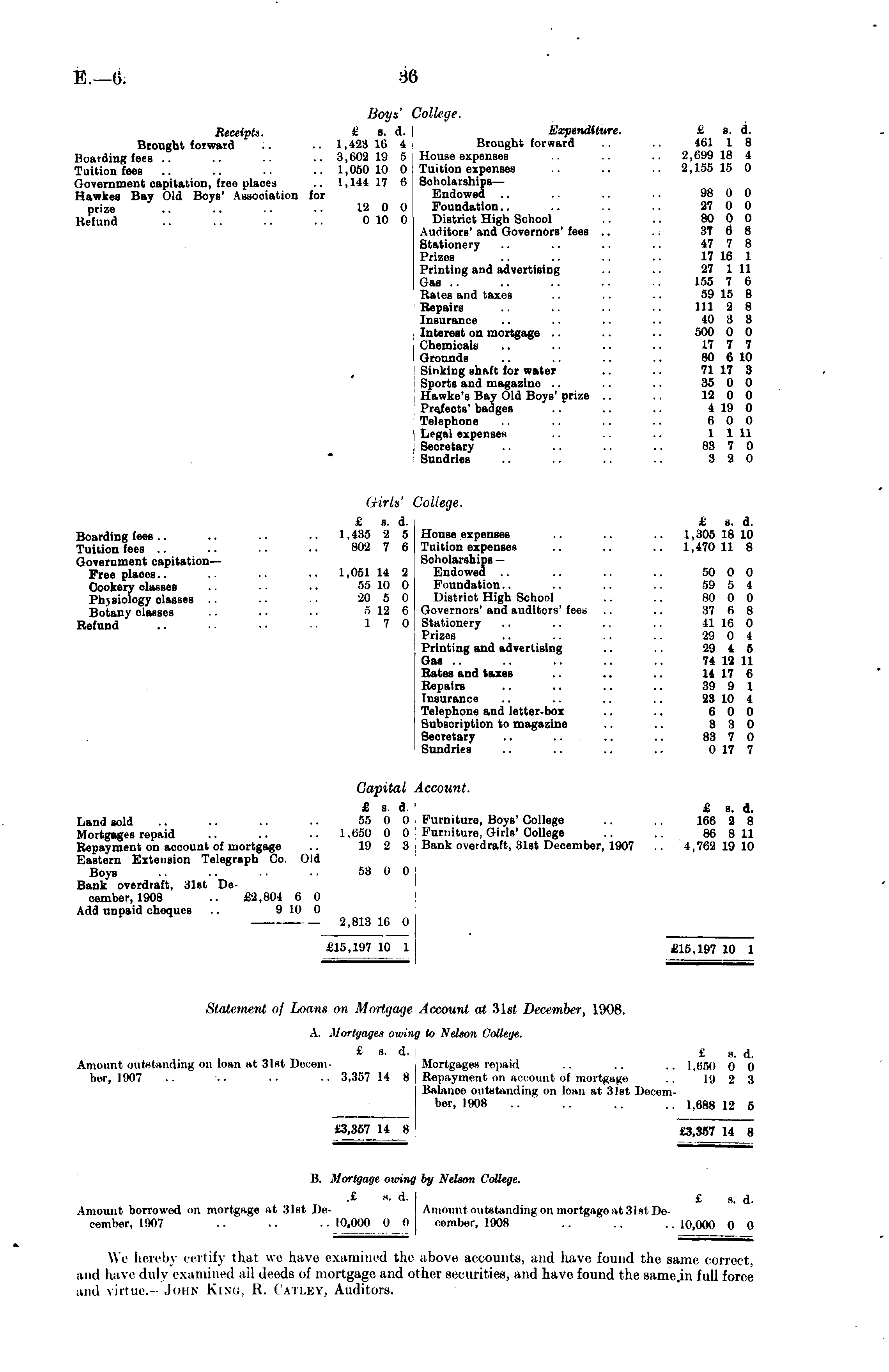 Boys' College. Receipts. t s. d. | Expenditure. t s. d. Brought forward .. 1,423 16 4 Brought forward .. 461 1 8 Boarding fees .. .. 3,602 19 5 House expenses .. .. .. 2,699 18 4 Tuition fees .. .. .. .. 1,050 10 0 , Tuition expenses .. .. .. 2,155 15 0 Government capitation, free places .. 1,144 17 (i Scholarships— Hawkes Bay Old Boys' Association for Endowed .. .. 98 0 0 prize .. .. .. 12 0 0 Foundation.. .. 27 0 0 Kefund .. 010 0 District High School .. 80 0 0 Auditors' and Governors' fees .. 37 6 8 Stationery .. .. .. .. 47 7 8 Prizes .. .. 17 16 1 Printing and advertising .. .. 27 111 Gas .. .. .. .. .. 155 7 6 Rates and taxes .. .. .. 59 15 8 Repairs .. 11l 2 8 Insurance .. .. .. .. 40 3 3 Interest on mortgage .. .. .. 500 0 0 Chemicals .. .. .. .. 17 7 7 Grounds .. .. .. 80 6 10 Sinking shaft for water .. 71 17 3 Sports and magazine .. .. .. 35 0 0 Hawke's Bay Old Boys' prize .. .. 12 0 0 Pre.feots' badges .. .. 4 19 0 Telephone .. .. .. 6 0 0 Legal expenses .. .. 1 1 11 Secretary .. .. .. 83 7 0 Sundries .. .. .. 3 2 0 (i-irls' College. t s. d. £ s. d. Boarding fees .. .. .. •• 1,435 2 5 j House expenses .. .. 1,305 18 10 Tuition fees .. .. .. 802 7 6 Tuition expenses .. .. .. 1,470 11 8 Government capitation— Scholarships - Preeplaoes.. .. .. •• 1,051 14 2| Endowed .. .. .. .. 50 0 0 Cookery classes .. .. 55 10 0 Foundation.. .. 59 5 4 Physiology olasses 20 5 0 j District High School .. .. 80 0 0 Botany classes .. .. •. 512 6 | Governors' and auditors' fees .. .. 37 6 8 Refund .. .. •• •• 170 Stationery .. .. .. 11 16 0 Prizes .. .. 29 0 4 Printing and advertising .. .. 29 4 5 Gas .. .. .. .. .. 74 12 11 Rates and taxes .. .. .. 14 17 6 Repairs .. .. .. .. 39 9 1 Insurance .. .. 28 10 4 Telephone and letter-box .. .. 6 0 0 Subscription to magazine .. .. 3 3 0 Secretary .. .. .. 83 7 0 Sundries .. .. .. .. 0 17 7 Capital Account. £ s. d £ s. d. Land sold .. .. .. .. 55 0 0 Furniture, Boys' College .. .. 166 2 8 Mortgages repaid .. .. .. 1,650 0 0 Furniture, Girls' College .. .. 86 811 Repayment on account of mortgage 19 2 3 Bank overdraft, 31st December, 1907 4,762 19 10 Eastern Extension Telegraph Co. Old Boys .. .. .. 53 0 0 Bank overdraft, 31st December, 1908 .. £2,804 6 0 Add unpaid cheques .. 910 0 2,813 16 0 £15,197 10 1 £15,197 10 1 Statement of Loan* an Mortgage Account at Ms/ December, 1908. A. Mortgages owing to Nelson College. f »■ d. £ 8 . d. Amount outstanding mi loan at :tlst Deoem- Mortgagee repaid .. .. .. 1,650 0 0 her, 1907 .. •• ■• 3,:5">7 II B Repayment mi acoount of mortgage .. 19 2 3 Balance outstanding on loan at 31st December, 1908 .. .. 1,688 12 5 £3,357 14 8 £3,357 14 8 B. Mortgage miring by Nelson College. .£ »• d. I £ s. d. Amount borrowed mi mortgage at 31st De- Amount outstanding on mortgage at 31st, December, I (HV7 .. .. .. 10.000 o ii cember, 1908 .. .. ..10,000 0 0 We hereby certify thai we have examined the above accounts, anil have found the same correct, ami have duly examined ail deeds of mortgage anil other securities, anil have found the same.in full force ami virtue. John Kino, R. Catley, Auditors.