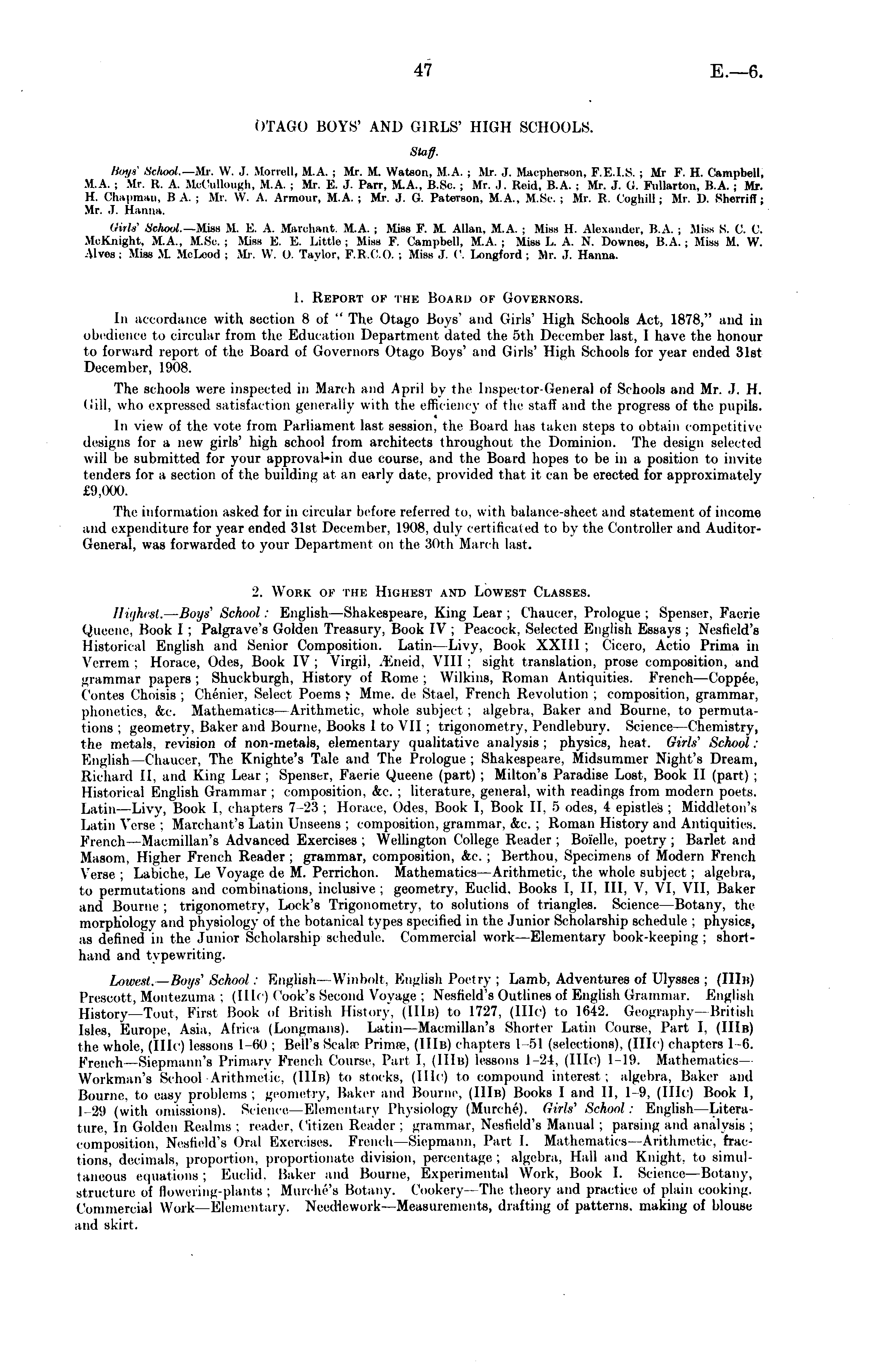 OTAGO BOYS' AND GIRLS' HIGH SCHOOLS. Staff. Boys' School.—Mr. YV. .1. Uorrell, M.A. : Mi. M. Watson, M.A. : Mr. .1. Maophereon, F.E.I.S. ;MrF. H. Campbell, MA. i Mr. 11. A. SioCuUough, M.A. ; Mr. K. .1. Pan, M.A.. H.Sc ; Mr. .1. Reid, B.A. ; Mr. .1. G. KulliH-tiiii. li.A. ; Mr. 11. Chapman, Ii A. : Mr. \V. A. Armour, M.A. : Mr. .1. (I. Paterson, M.A., M.Sc. ; Mr. R, Coghill; Mr. 1). SlienitT ; Mr. .1. H.iiiici. Girls' Bchool.—Wsß M. K. A. Marohant. .v.A. ; Miss F. It Allan, M.A. ; Miss H. Alexander, B.A ; Miss S. ('. ( . M.Knifilit. M.A.. M.Sc; Miss K. K. Little; Miss F. Campbell, M.A. ; Miss l„ A. N. Downee, 8.A.; Miss M. W. Alves: Miss M. MoLeod ; Mr. W. 0. Taylor, P.R.C.O. : Miss .1. ('. Longford; Mr. .1. Hanna. I. Report ok the Board ok Governors. In accordance with section 8 of " The Otago Boys' and (iiris' High Schools Act, 1878," and in obedience to circular from the Education Department dated the sth December last, I have the honour to forward report of the Board of Governors Otago Boys' and (litis' High Schools for year ended 31st December, 1908. The schools were inspected in March and April by the Inspector -General of Schools and Mr. .!. 11. Gill, who expressed satisfaction generally with the efficiency of the staff and the progress of the pupils. In view of the vote from Parliament last session, the Board has taken steps to obtain competitive designs for a new girls' high school from architects throughout the Dominion. The design .selected will lie submitted for your approvaMn due course, and tin- Board hopes to he in a position to invite tenders lor a section of the buildinu at an early date, provided that it can be erected for approximately £9,000. The information asked for in circular before referred to, \\ it h balance-sheet and statement of income and expenditure for year ended 31st December, l.»<>B. duly certificated to by the Controller and AuditorGeneral, was forwarded to your Department on the 30th March last. ■1. Work of the Highest and Lowest Classes. Highest. — Boys' School: Fnglish—Shakespeare, hong Lear: Chaucer. Prologue; Spenser. Faerie Queene, Book I : Palgrave's Golden Treasury. Book IV: Peacock, Selected English Essays; Nesfield's Historical English and Senior Composition. Latin Liw. Booh XXIII: Cicero, Actio Prima in Verrem ; Horace. Oiles. Book IV : Virgil, .Lucid. \"III : sight translation, prose composition, and grammar papers; Shin-khurgh, History of Rome; Wilkins. Roman Antiiputies. French —Coppee, Contcs Choisis; Chehier, Select Poems j Mine, de Stack French Revolution ; composition, grammar, phonetics, &c. Mathematics - Arithmetic whole subject; algebra, Baker and Bourne, to permutations: geometry, Baker and Bourne, Books Ito Vl] : trigonometry, Pendlebury. Science Chemistry, the metals, revision of non -metals, elementary qualitative analysis: physics, heat. Girls' School: English Chaucer, The Knighte's Tale and The Prologue; Shakespeare, Midsummer Night's Dream, Richard 11. and King Lear : Spenser, Faerie Queens (part) ; Milton's Paradise Lost, Book II (part) : Historical English Grammar : composition, &c. ; literature, general, with readings from modern poels. Latin Livy, Book I, chapters 7 2:5 ; Horace. Odes, Book I, Book 11, 5 odes, 4 epistles ; Middleton's Latin Terse; Man-hunt's Latin Unseens; composition, grammar, £c.; Roman History and Antiquities. Flench Macmillan's Advanced Exercises; Wellington College Reader ; Boielle, poetry; Barlet and Masom. Higher French Reader: grammar, composition, &c : Berthou, Specimens of Modern French Verse ; Labiche, Le Voyage de M. Perrichon. Mathematics —Arithmetic, the whole subject : algebra, to permutations and combinations, inclusive ; geometry, Euclid, Books I, 11, 111, V, VI, VII. Baker and Bourne; trigonometry, Lock's Trigonometry, to solutions of triangles. Science Botany, the morphology and physiology of the botanical types specified in the Junior Scholarship schedule ; physics, as defined i" the Junior Scholarship schedule. Commercial work —Elemental v book-keeping : shorthand and typewriting. Lowest. Boys' School: English Winbolt, English Poetry; Lamb, Adventures of Ulysses ; (IIIh) Prescott, Montezuma : (lib ) < 'ook's Second Voyage ; Nesfield's Outlines of English Grammar. English History Tout. First Book of British History, (lilt!) to 1727, (Ille) to 1642. Geography British Isles. Europe, Asia, Africa (Longmans). Latin—Macmillan's Shorter Latin Course. Part I. (IIIh) the whole, (IIIc) lessons I (it): Bell's Sea la- Primee, (I lin) chapters 151 (select vms). (IIIc) chapters 1 <i. French —Siepmann's Primary French Course Pari I. (IIIh) lessons I 24, ( 111 <) 1 19. .Mathematics Workman's School Arithmetic, (IIIh) to stocks. (11 1« )to compound interest : algebra, Baker and Bourne, to easy problems; geometry, Baker and Bourne, (IIIh) Books I and 11. I 9, (IIIc) Book I. I 2.i (with omissions). Science Elementary Physiology (Mni-che). Girls' School: English Literature, In Golden Realms : reader. Citizen Reader : grammar, Ncslield's Manual ; parsing and analysis ; composition, Nesfield's Oral Exercises. French Siepmann, Part I. Mathematics Arithmetic Irac tions. decimals, proportion, proportionate division, percentage; algebra, Hall and Knight, to simultaneous equations; Euclid, Baker and Bourne, Experimental Work. Book I. Science—Botany. structure of (lowering-plants : Murche's Botany. Cookery- The theory and practice of plain cooking. Commercial Work—Elementary. Needlework —Measurements, drafting of patterns, making of blouse and skirt.