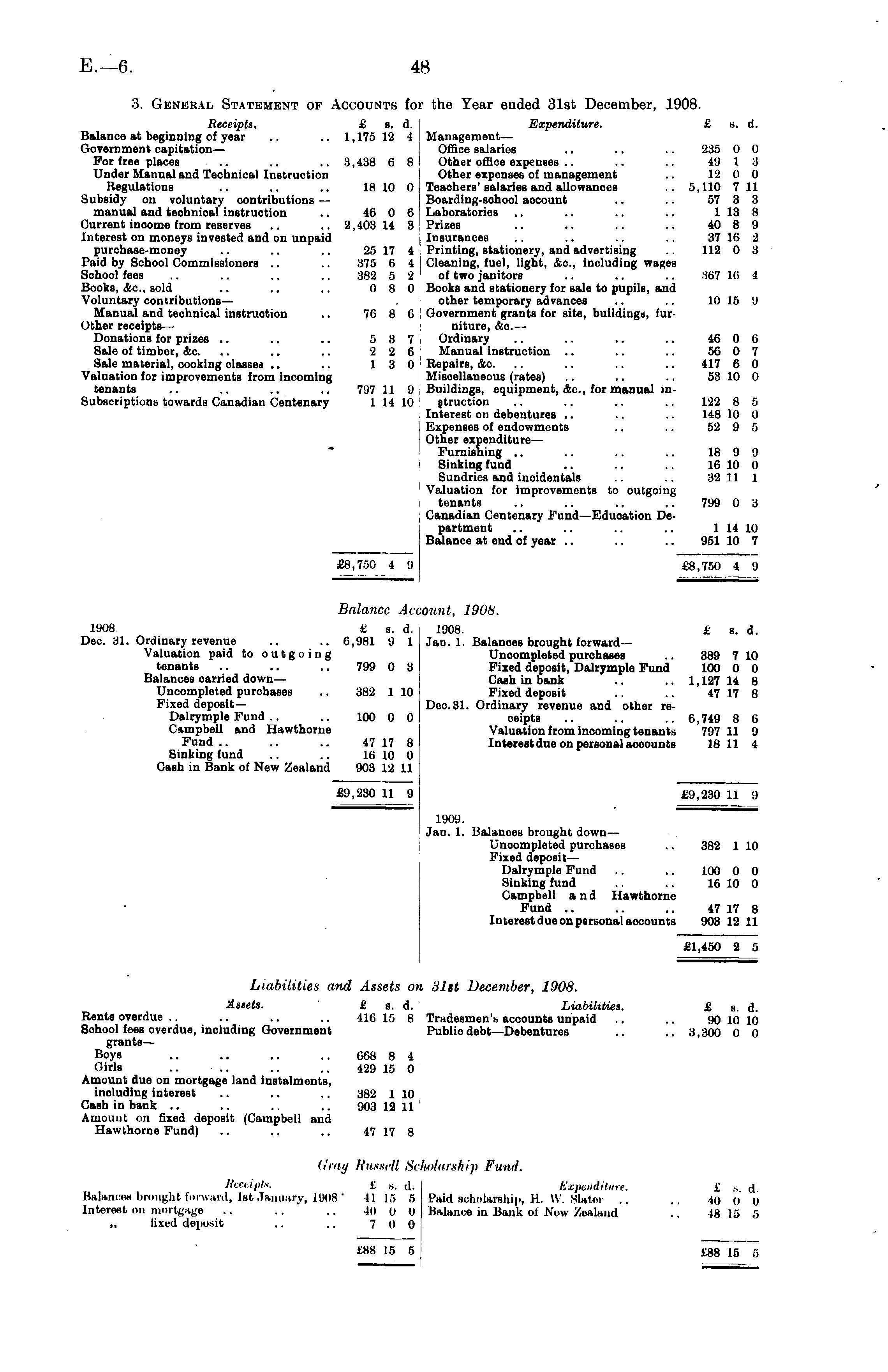 3. General Statement op Accounts for the Year ended 31st December, 1908. Receipts. £ a. A. Expenditure. £ s. d. Balance at beginning of year .. .. 1,175 12 4 Management— Government capitation— Office salaries .. .. 235 0 0 For free places .. .. .. 3,438 6 8 Other office expenses .. .. 4'J 1 3 Under Manual and Technical Instruction Other expenses of management .. 12 0 0 Regulations .. .. .. 18 10 0 Teachers'salaries and allowances 5,110 7 11 Subsidy on voluntary contributions — Boarding-sohool aocount .. .. 57 3 3 manual and teohnioal instruction .. 46 0 6 Laboratories .. .. .. 1 13 8 Current inoome from reserves .. .. 2,403 14 3 Prizes .. .. .. .. 40 8 9 Interest on moneys invested and on unpaid j Insurances .. .. .. .. 37 16 2 purchase-money .. .. .. 25 17 4 Printing, stationery, and advertising .. 112 0 3 Paid by School Commissioners .. .. 375 6 4 Cleaning, fuel, light, &c, including wages School fees .. .. .. .. 382 5 2 of two janitors .. .. .. 367 16 4 Books, ifcc, sold .. .. .. 0 8 0 Books and stationery for sale to pupils, and Voluntary contributions— . other temporary advances .. .. 10 15 'J Manual and technical instruction .. 76 8 6 ; Government grants for site, buildings, furOther receipts— niture, &o. — Donations for prizes .. .. .. 5 3 7 Ordinary .. .. .. .. 46 0 6 Sale of timber, &c. .. .. .. 2 2 6 Manual instruction .. .. .. 56 0 7 Sale material, cooking classes .. .. 13 0 Repairs, &c. .. .. .. .. 417 6 0 Valuation for improvements from incoming Miscellaneous (rates) .. .. 53 10 0 tenants .. .. .. .. 797 11 9 Buildings, equipment, &c, for manual mSubscriptions towards Canadian Centenary 1 14 10 struction .. .. .. .. 122 8 5 Interest on debentures .. .. 148 10 v Expenses of endowments .. .. 52 9 5 Other expenditure— Furnishing .. .. .. .. 18 9 'J Sinking fund .. 16 10 0 Sundries and incidentals .. .. 32 11 1 Valuation for improvements to outgoing tenants .. .. .. .. 799 0 3 Canadian Centenary Fund—Eduoation Department .. .. .. .. 114 10 Balance at end of year .. .. 951 10 7 £8,750 I 9 £8,750 4 9 Balance Account, 1908. 1908 £ s. d. ; 1908. £ s. d. Dec. 31. Ordinary revenue .. .. 6,981 9 1 Jan. 1. Balances brought forwardValuation paid to outgoing Uncompleted purohases .. 389 7 10 tenants .. .. .. 799 0 3 Fixed deposit, Dalrymple Fund 100 0 0 Balances carried down— Cash in bank .. .. 1,127 14 8 Uncompleted purchases .. 382 1 10 Fixed deposit 47 17 8 Fixed deposit— I Deo. 31. Ordinary revenue and other reDalrymple Fund .. .. 100 0 0 ! ceipts .. .. 6,749 8 6 Campbell and Hawthorne Valuation from incoming tenants 797 11 9 Fund .. .. .. 47 17 8 Interest due on personal accounts 18 11 4 Sinking fund .. .. 16 10 0 Cash in Bank of New Zealand 903 12 11 £9,230 11 9 £9,230 11 9 1909. Jan. 1. Balances brought down— Uncompleted purchases .. 382 110 Fixed deposit— Dalrymple Fund .. 100 0 0 Sinking fund .. .. 16 10 0 Campbell and Hawthorne Fund .. .. .. 47 17 8 Interest due on personal accounts 903 12 11 £1,450 2 5 Liabilities and Assets on 31st December, 1908. Assets. £ s. d. Liabilities. £ s. d. Rents overdue .. .. .. .. 416 15 8 Tradesmen's accounts unpaid .. .. 90 10 10 School fees overdue, including Government Public debt—Debentures .. .. 3,300 0 0 grants— Boys .. .. .. .. 668 8 4 Girls .. .. .. .. 429 15 0 Amount due on mortgage land Instalments, inoluding interest .. .. .. 382 1 10 Cash in bank .. .. .. .. 903 12 11 Amount on fixed deposit (Campbell and Hawthorne Fund) .. .. .. 47 17 8 Gray Hassell Scholarship Final. Receipts. I s. d. Expenditure. f. „. d, Balain-iis brought forward, Ist January, 1908' 41 l, r > S Paid scholarship, H. W. slater .. .. 40 on Interest on mortgage .. .. .. In o o Balance in Bank of New Zealand .. 48 15 E „ lixcil deposit .. .. 7 0 0 SBB 15 5 £88 15 C