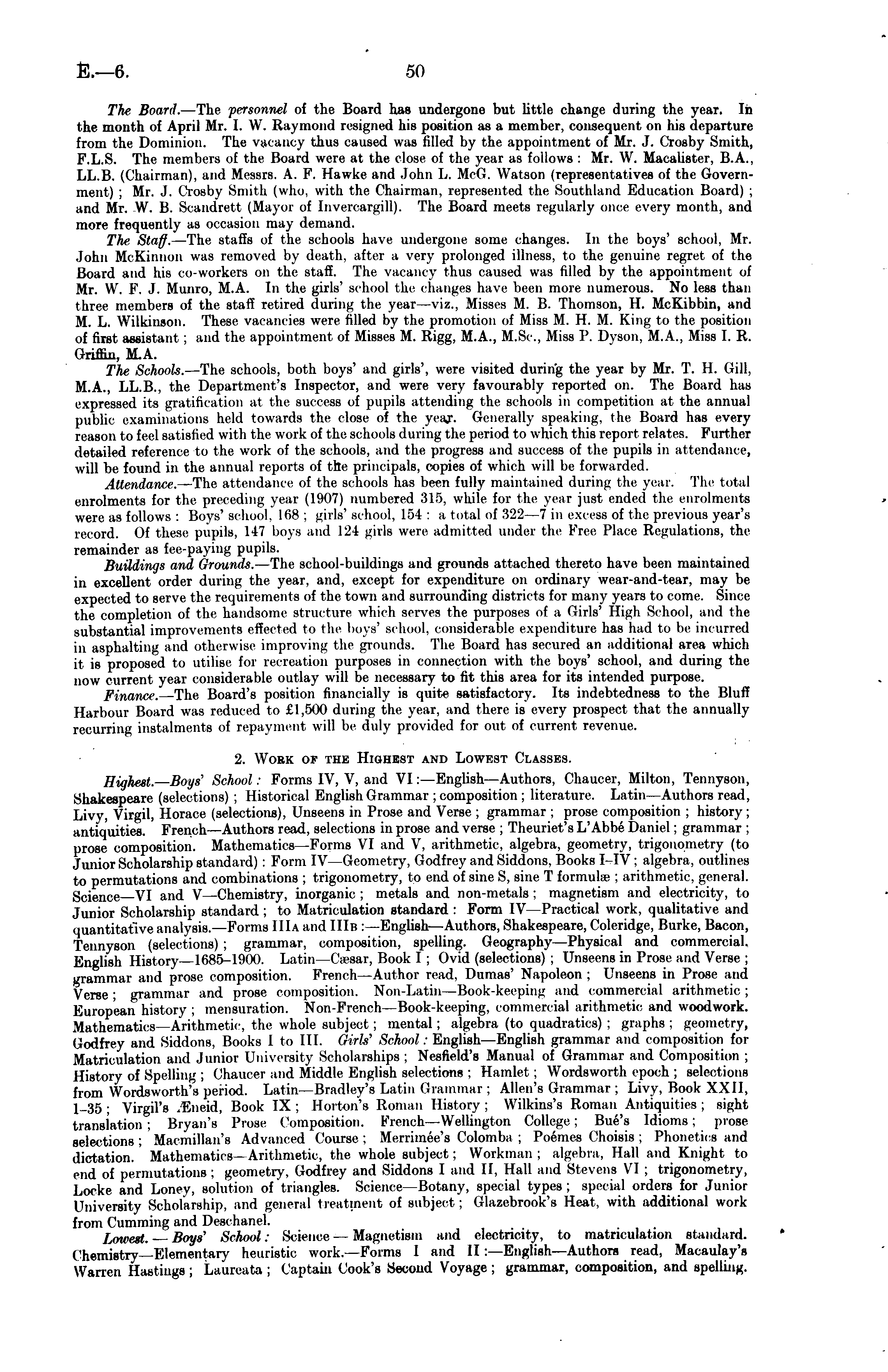 The Board. —The personnel of the Board has undergone but little change during the year. In the month of April Mr. 1. W. Raymond resigned his position as a member, consequent on his departure from the Dominion. The vacancy thus caused was filled by the appointment of Mr. J. Crosby Smith, F.L.S. The members oi the Board were at the close of the year as follows : Mr. \V. Maoalister, 8.A., LL.B. (Chairman), and Messrs. A. F. Hawke and John L. McG. Watson (representatives of the Government) ; Mr. J. Crosby Smith (who. with the Chairman, represented the Southland Education Board) ; and Mr. W. B. Scandrett (Mayor of Invercargill). The Board meets regularly once every month, and more frequently as occasion may demand. The Staff. —The staffs of the schools have undergone some changes. In the boys' school, Mr. .John McKinnon was removed by death, after a very prolonged illness, to the genuine regret of the Board and his co-workers on the staff. The vacancy thus caused was filled by the appointment of Mr. \\\ F. J. Munro, M.A. In the girls' school the changes have been more numerous. No less than three members of the staff retired during the year—viz., Misses M. B. Thomson, H. McKibhin, and M. L. Wilkinson. These vacancies were filled hy the promotion of Miss M. H. M. King to the position of first assistant : and the appointment of Misses M. Rigg, M.A., M.Sc, Miss P. Dyson, M.A., Miss I. R. Griffin, M.A. The Schools. —The schools, both boys' and girls', were visited during the year by Mr. T. H. Gill, M.A., LL.B., the Department's Inspector, and were very favourably reported on. The Board has expressed its gratification at the success of pupils attending the schools in competition at the annual public examinations held towards the close of the year. Generally speaking, the Hoard lias evenreason to feel satisfied with the work of the schools during the period to which this report relates. Further detailed reference to the work of the schools, and the progress and success of the pupils in attendance, will he found in the annual reports of the principals, copies of which will lie forwarded. Attendance. —The attendance of the schools has been fully maintained durine the year. The total enrolments for the preceding year (1907) numbered 315, while for the year just ended the enrolments were as follows : Boys' school, lliB ; uirls' school, 151 : a total of 322—7 in excess of the previous year's record. Of these pupils. 117 boys and 121 girls were admitted under the Free Place Regulations, the remainder as fee-paying pupils. Buildings and annuals. The school-buildings and grounds attached thereto have lieen maintained in excellent order during the year, and, except for expenditure on ordinary wear-and-tear, may he expected to serve the requirements of the town and surrounding districts for many years to come. Since the completion of the handsome structure which serves the purposes of a Girls' High School, and the substantial improvements effected to the boys' school, considerable expenditure has had to he incurred in asphalting and otherwise improving the grounds. The Board has secured an additional area which it is proposed to utilise lor recreation purposes in connection with the boys' school, and during the now current year considerable outlay will be necessary to fit this area for its intended purpose. Finance. The Board's position financially is quite satisfactory. Its indebtedness to the Bluff Harbour Board was reduced to £1,500 during the year, and there is every prospect that the annually recurring instalments of repayment will be duly provided for out of current revenue. 2. Work of the Highest and Lowest Classes. Highest. — Boys' School: Forms IV, V, and Vl: —English—Authors, Chaucer, Milton, Tennyson, Shakespeare (selections) ; Historical English Grammar ; composition ; literature. Latin —Authors read, Livy, Virgil, Horace (selections), Unseens in Prose and Verse ; grammar : prose composition ; history; antiquities. French —Authors read, selections in prose and verse ; Theuriet'sL'Abbe Daniel ; grammar ; prose composition. Mathematics —Forms VI and V, arithmetic, algebra, geometry, trigonometry (to Junior Scholarship standard) : Form IV—Geometry, Godfrey and Siddons, Books I-IV ; algebra, outlines to permutations and combinations ; trigonometry, to end of sine S, sine T formulae ; arithmetic, general. Science VI and V —Chemistry, inorganic ; metals and non-metals ; magnetism and electricity, to Junior Scholarship standard; to Matriculation standard : Form IV Practical work, qualitative and quantitative analysis. —Forms 111 a and lIIb : —English—Authors, Shakespeare, ('oleridge. Burke, Bacon, Tennyson (selections); grammar, composition, spelling. Geography Physical and commercial. English History —1685-1900. Latin—Caesar, Book I ; Ovid (selections) ; Unseens in Prose and Verse : grammar and prose composition. French -Author read, Dumas' Napoleon : I'liseens in Prose and Verse; grammar and prose composition. Non-Latin—Book-keeping and commercial arithmetic: European history; mensuration. Non-French —Book-keeping, commercial arithmetic and woodwork. Mathematics—Arithmetic the whole subject : mental; algebra (to quadratics): graphs: geometry, Godfrey and Siddons. Books I to 111. Girls' School: English—English grammar and composition for Matriculation and Junior [Jniversity Scholarships; Nesfield's Manual of Grammar and Composition; History of Spelling ; Chaucer and Middle English selections ; Hamlet; Wordsworth epoch : .selections from Wordsworth's period. Latin—Bradley's Latin Grammar; Allen's Grammar; Livy, Booh XXII, 1-35; Virgil's .Kneid. Book IX; Horton's Roman History ; Wilkins's Roman Antiquities; sight translation; Bryan's Prose Composition. French Wellington College; Hue's Idioms: prose selections; Macmillan's Advanced Course: Merriiiiee's Colomha ; Poemes Ohnisis : Phonetics and dictation.' Mathematics Arithmetic the whole subject; Workman: al
