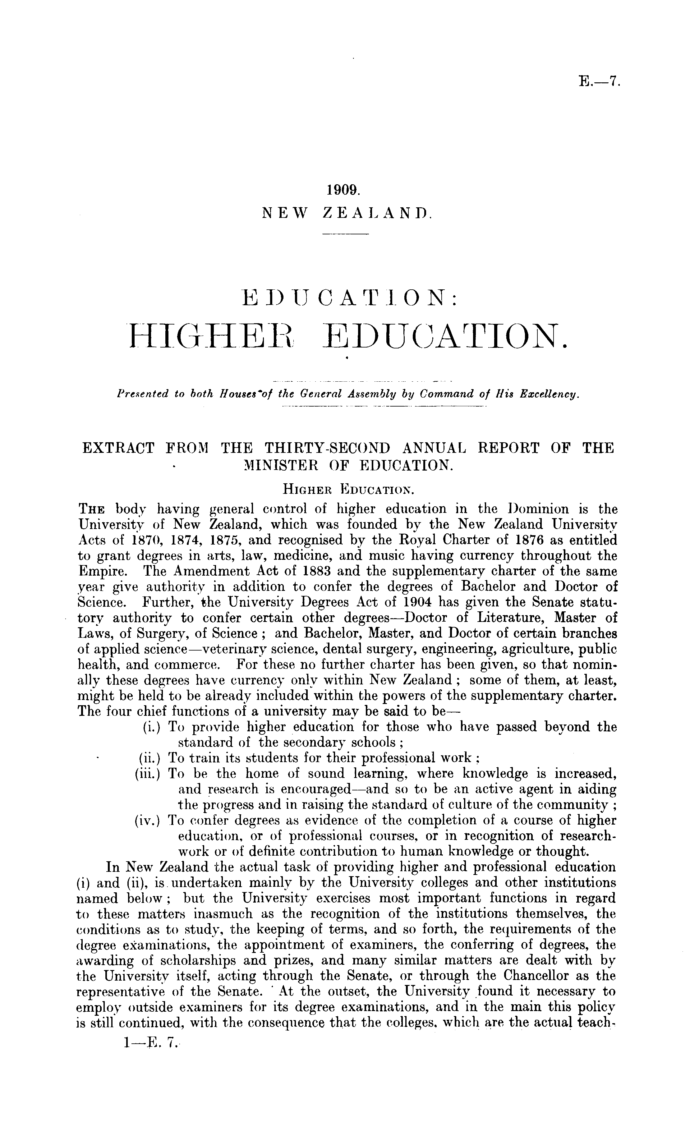 EXTRACT FROM THE THIRTY-SECOND ANNUAL REPORT OF THE MINISTER OF EDUCATION. Higher Education. The body having general control of higher education in the Dominion is the University of New Zealand, which was founded by the New Zealand University Acts of 1870, 1874, 1875, and recognised by the Royal Charter of 1876 as entitled to grant degrees in arts, law, medicine, and music having currency throughout the ICmpire. The Amendment Act of 1883 and the supplementary charter of the same year give authority in addition to confer the degrees of Bachelor and Doctor of Science. Further, the University Degrees Act of 1904 has given the Senate statutory authority to confer certain other degrees —Doctor of Literature, Master of Laws, of Surgery, of Science ; and Bachelor, Master, and Doctor of certain branches of applied science—veterinary science, dental surgery, engineering, agriculture, public health, and commerce. For these no further charter has been given, so that nominally these degrees have currency only within New Zealand ; some of them, at least, might be held to be already included within the powers of the supplementary charter. The four chief functions of a university may be said to be— (i.) To provide higher education for those who have passed beyond the standard of the secondary schools ; (ii.) To train its students for their professional work ; (iii.) To be the home of sound learning, where knowledge is increased, and research is encouraged—and so to be an active agent in aiding the progress and in raising the standard of culture of the community ; (iv.) To confer degrees as evidence of the completion of a course of higher education, or of professional courses, or in recognition of researchwork or of definite contribution to human knowledge or thought. In New Zealand the actual task of providing higher and professional education (i) and (ii), is. undertaken mainly by the University colleges and other institutions named below ; but the University exercises most important functions in regard to these matters inasmuch as the recognition of the institutions themselves, the conditions as to study, the keeping of terms. and so forth, the requirements of the degree examinations, the appointment of examiners, the conferring of degrees, the awarding of scholarships and prizes, and many similar matters are dealt with by the University itself, acting through the Senate, or through the Chancellor as the representative of the Senate. ' At the outset, the University found it necessary to employ outside examiners for its degree examinations, and in the main this policy is still continued, with the consequence that the colleges, which arc the actual teach--I—E. 7.