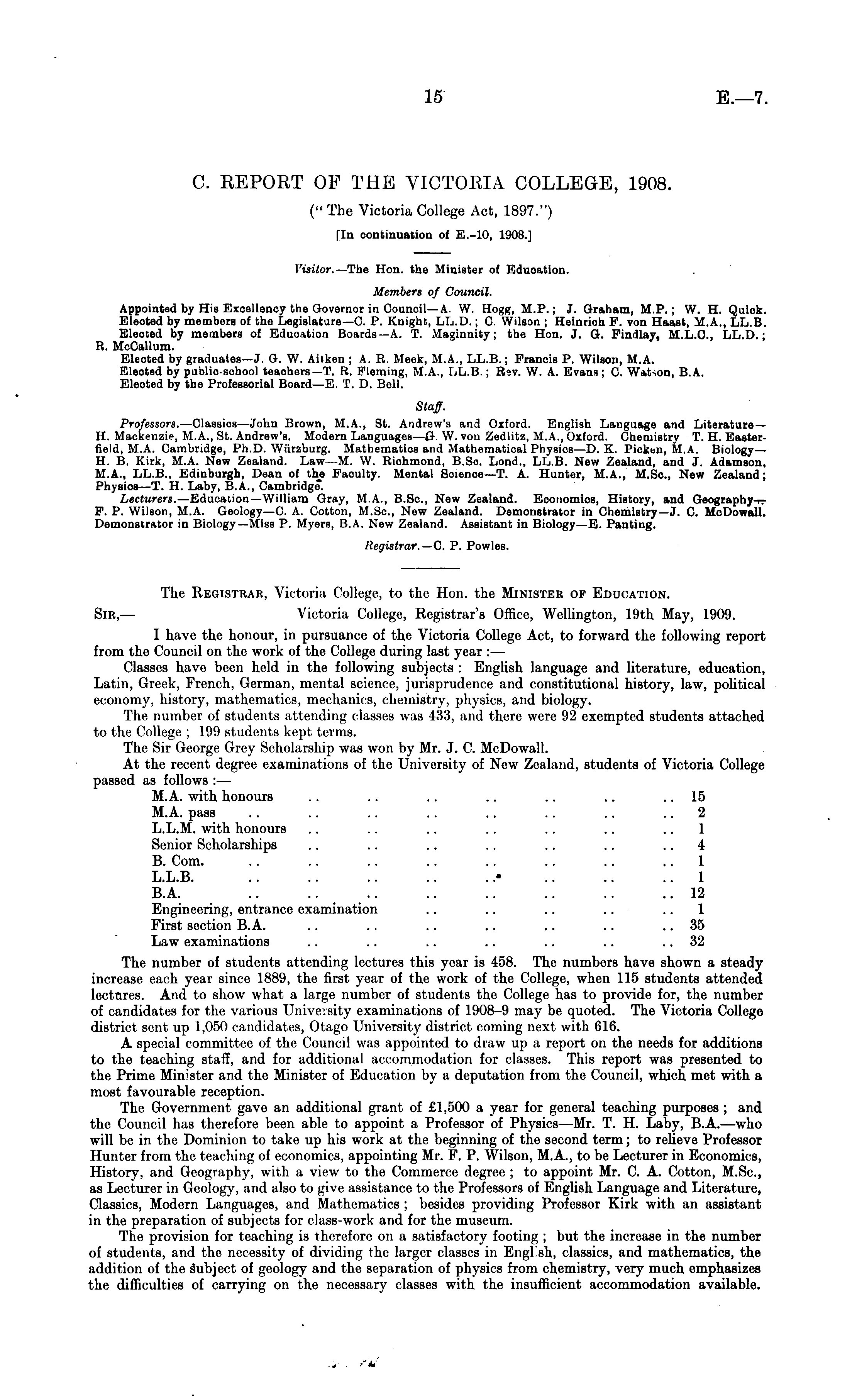C. KEPORT OF THE VICTORIA COLLEGE, 1908. (" The Victoria College Act, 1897.") [In continuation of E.-10, 1908.] Visitor. —The Hon. the Minister of Eduoation. Members of Council. Appointed by His Excellency the Governor in Council—A. W. Hogg, M.P.; J. Graham, M.P. ;W. H. Quick. Elected by members of the Legislature—C. P. KDight, LL.D.; C. Wilson ; Heinrich P. yon Haast, M.A., LL.B. Elected by members of Education Boards—A. T. Maginnity; the Hon. J. Q. Findlay, M.L.C., LL.D.; R. McCallum. Elected by graduates— J. G. W. Aitken ;A. R. Meek, M.A., LL.B.; Francis P. Wilson, M.A. Eleoted by public-school teaohers—T. R. Fleming, M.A., LL.B.; R«v. W. A. Evans; G. Watson, B.A. Eleoted by the Professorial Board—E. T. D. Bell. Staff. Professors. —Classios — Brown, M.A., St. Andrew's and Oxford. English Language and Literature — H. Mackenzie, M.A., St. Andrew's. Modern Languages— O W. yon Zedlitz, M.A..Oxford. Chemistry T. H. Easterfield, M.A. Cambridge, Ph.D. Wiirzburg. Mathematics and Mathematical Physics—D. K. Picken, M.A. Biology— H. B. Kirk, M.A. New Zealand. Law —M. W. Richmond, B.Sc. Lond., LL.B. New Zealand, and J. Adamson, M.A., LL.B., Edinburgh, Dean of the Faculty. Mental Soience—T. A. Hunter, M.A., M.Sc, New Zealand; Physics—T. H. Laby, 8.A., Cambridge. Lecturers. —Education—William Gray, M.A., B.Sc, New Zealand. Economics, History, and Geography— F. P. Wilson, M.A. Geology—C. A. Cotton, M.Sc, New Zealand. Demonstrator in Chemistry— J. C. McDowall. Demonstrator in Biology—Miss P. Myers, B.A. New Zealand. Assistant in Biology—E. Panting. Registrar.— C. P. Powles. The Registrar, Victoria College, to the Hon. the Minister op Education. Sir,— Victoria College, Registrar's Office, Wellington, 19th May, 1909. I have the honour, in pursuance of the Victoria College Act, to forward the following report from the Council on the work of the College during last year : — Classes have been held in the following subjects : English language and literature, education, Latin, Greek, French, German, mental science, jurisprudence and constitutional history, law, political economy, history, mathematics, mechanics, chemistry, physics, and biology. The number of students attending classes was 433, and there were 92 exempted students attached to the College ; 199 students kept terms. The Sir George Grey Scholarship was won by Mr. J. C. McDowall. At the recent degree examinations of the University of New Zealand, students of Victoria College passed as follows : — M.A. with honours .. .. .. .. .. .. 15 M.A. pass .. .. .. .. .. .. .. .. 2 L.L.M. with honours .. .. .. .. .. .. .. 1 Senior Scholarships .. .. .. .. .. .. 4 B. Com. .. .. .. .. .. .. .. .. 1 L.L.B. • 1 B.A. 12 Engineering, entrance examination .. .. .. .. .. 1 First section B.A. .. .. .. .. .. .. .. 35 Law examinations .. .. .. .. .. .. .. 32 The number of students attending lectures this year is 458. The numbers have shown a steady increase each year since 1889, the first year of the work of the College, when 115 students attended lectnres. And to show what a large number of students the College has to provide for, the number of candidates for the various University examinations of 1908-9 may be quoted. The Victoria College district sent up 1,050 candidates, Otago University district coming next with 616. A special committee of the Council was appointed to draw up a report on the needs for additions to the teaching staff, and for additional accommodation for classes. This report was presented to the Prime Minister and the Minister of Education by a deputation from the Council, which met with a most favourable reception. The Government gave an additional grant of £1,500 a year for general teaching purposes ; and the Council has therefore been able to appoint a Professor of Physics—Mr. T. H. Laby, B.A.—who will be in the Dominion to take up his work at the beginning of the second term; to relieve Professor Hunter from the teaching of economics, appointing Mr. F. P. Wilson, M.A., to be Lecturer in Economics, History, and Geography, with a view to the Commerce degree ; to appoint Mr. C. A. Cotton, M.Sc, as Lecturer in Geology, and also to give assistance to the Professors of English Language and Literature, Classics, Modern Languages, and Mathematics ; besides providing Professor Kirk with an assistant in the preparation of subjects for class-work and for the museum. The provision for teaching is therefore on a satisfactory footing ; but the increase in the number of students, and the necessity of dividing the larger classes in English, classics, and mathematics, the addition of the subject of geology and the separation of physics from chemistry, very much emphasizes the difficulties of carrying on the necessary classes with the insufficient accommodation available.
