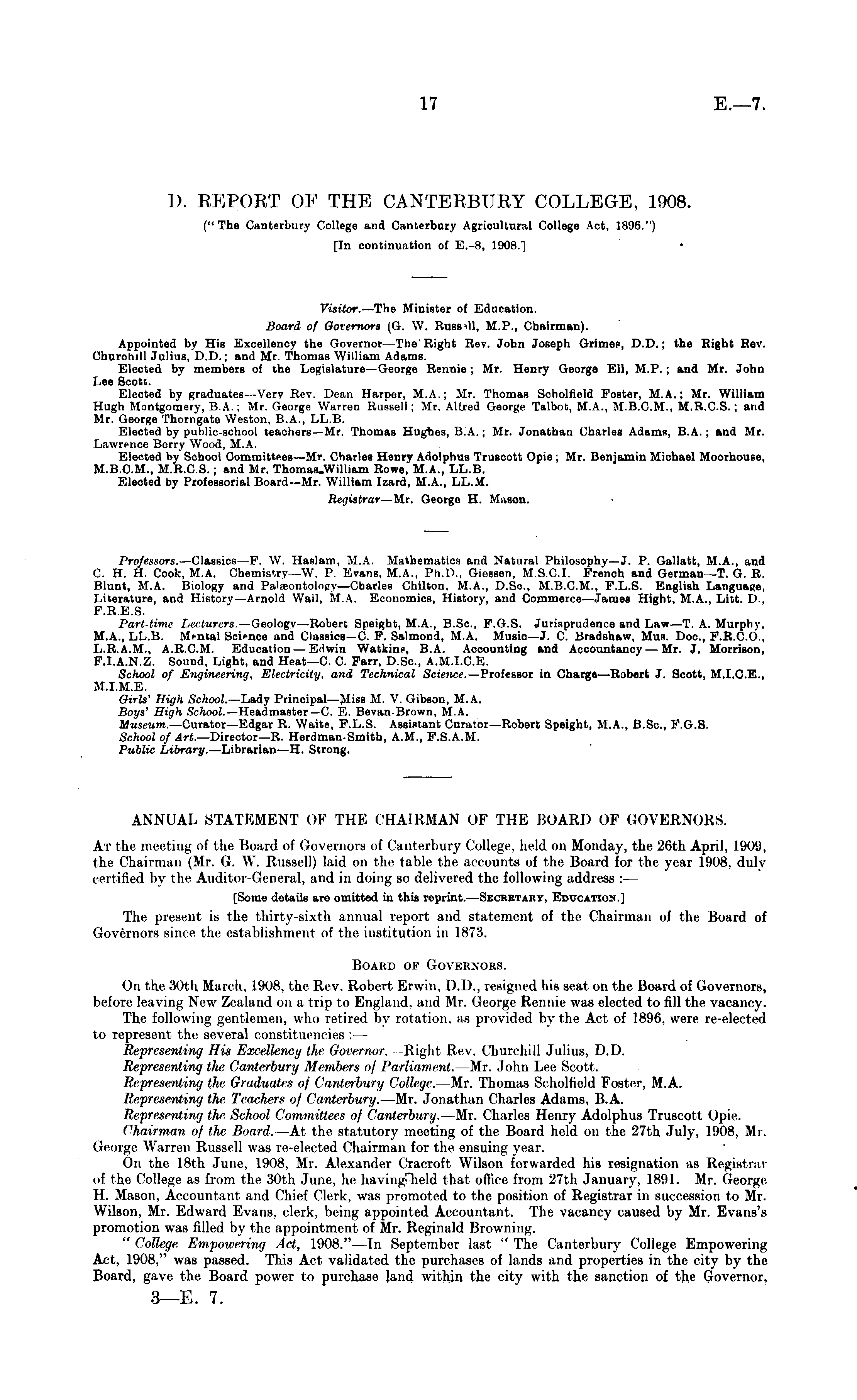 l>. REPORT OF THE CANTERBURY COLLEGE, 1908. ("The Canterbury College and Canterbury Agricultural College Act, 1896.") [In continuation of E.-8, 1908.] Visitor. —The Minister of Education. Board of Governors (G. W. Russ<U, M.P., Chairman). Appointed by His Excellency the Governor—The Right Rev. John Joseph Grimes, D.D.; the Right Rev. Churchill Julius, D.D.; and Mr. Thomas William Adams. Elected by members of the Legislature—George Rennie ; Mr. Henry George Ell, M.P. ; and Mr. John Lee Scott. Elected by graduates—Very Rev. Dean Harper, M.A.; Mr. Thomas Scholfield Poster, M.A.; Mr. William Hugh Montgomery, 8.A.; Mr. George Warren Russell; Mr. Alfred George Talbot, M.A., M.8.C.M., M.R.C.S.; and Mr. George Thorngate Weston, 8.A., LL.B. Elected by public-school teachers—Mr. Thomas Hughes, 8.A.; Mr. Jonathan Charles Adamß, B.A. ; and Mr. Lawrence Berry Wood, M.A. Elected by School Committees —Mr. Charles Henry Adolphus Truscott Opie ; Mr. Benjamin Michael Moorhouse, M.8.C.M., M.R.C.S. ; and Mr. Thomas.William Rowe, M.A., LL.B. Elected by Professorial Board—Mr. William Izard, M.A., LL.M. Registrar —Mr. George H. Miison. Professors. —Classics—F. W. Haslam, M.A. Mathematics and Natural Philosophy— J. P. Gallatt, M.A., and C. H. H. Cook, M.A. Chemis'.rv—W. P. Evans, M.A., Ph.D., Giessen, M.S.C.I. French and German—T. G. R. Blunt, M.A. Biology and Palseontoloey—Charles Chilton, M.A., D.Sc, MB.CM., F.L.S. English Language, Literature, and History—Arnold Wall, M.A. Economics, History, and Commerce—James Hight, M.A., Litt. l>., P.8.E.8. Part-time Lecturers. —Geology—Robert Speight, M.A., B.Sc, F.G.S. Jurisprudence and Law—T. A. Murphy, M.A., LL.B. Mental Science and Classics—C. F. Salmond, M.A. Music— J. C. Bradshaw, Mus. Doc, F.R.C.0., L.R.A.M., A.R.C.M. Education — Edwin Watkins, B.A. Accounting and Accountancy — Mr. J. Morrison, F.I.A.N.Z. Sound, Light, and Heat—C. C. Farr, D.Sc, A.M.I.C.E. School of Engineering, Electricity, and Technical Science. —Professor in Charge—Robert J. Scott, M.1.C.E., M.I.M.E. Girls' High School. —Lady Principal—Miss M. V. Gibson, M.A. Boys' High School. —Headmaster—C. E. Bevan Brown, M.A. Museum.— Curator—Edgar R. Waite, F.L.S. Assistant Curator—Robert Speight, M.A., B.Sc, F.G.S. School of Art.— Director—R. Herdman-Smitb, A.M., F.S.A.M. Public Library. —Librarian—H. Strong. ANNUAL STATEMENT OF THE CHAIRMAN OF THE BOARD OF GOVBBNORB. At the meeting of the Board of Governors of Canterbury College, held on Monday, the 2(ith April. 1909, the Chairman (Mr. G. W. Russell) laid on the table the accounts of the Board for tin , year 1908, duly ccitificd by the Auditor-General, and in doing bo delivered the following address : — [Some details are omitted in this reprint.-—Secretary, Education.] The present is the thirty-sixth annual report and statement of the Chairman of the Hoard of Governors since the establishment of the institution in 1873. Board of Governors. On the 30th March. 1908, the He\-. Robert Erwin, D.1)., resigned his seat on the Board of Governors, before leaving New Zealand on a trip to England, and Mi. George Rennie was elected to fill the vacancy. The following gentlemen, who retired by rotation, as provided by the Act of 1896. were re-elected to represent the several constituencies : — Represent mi/ 11 is Excellency I In , Governor. Righi Rev. Churchill Julius, D.D. Represent in 11 the Canterbury Members of Parliament. —Mr. John Lee Scott. Representing the Graduates of Canterbury College. Mr. Thomas Scholfield Foster, .M.A. Representing the Teachers of Canterbury. Mr. Jonathan Charles Adams, B.A. Representing the School Committees of Canterbury. —Mr. Charles Henry Adolphus Truscoti Opie. chairman of the Board. At the statutory meeting of the Board held on the 27th July, 1908, Mr. George Warren Russell was re-elected Chairman for the ensuing year. (•n the 18th June, 1908, Mr. Alexander Cracrofi Wilson forwarded his resignation as Registrar of the College as from the 30th June, he havingfjheld that office from 27th January, 1801. Mr. George 11. Mason. Accountant and Chief Clerk, was promoted to the position of Registrar in succession to Mr. Wilson, Mr. Edward Evans, clerk, being appointed Accountant. The vacancy caused by Mr. Evans's promotion was filled by the appointment of Mr. Reginald Browning. "College Empowering Act, 1908."—In September last "The Canterbury College Empowering Act, 1908," was passed. This Act validated the purchases of lands and properties in the city by the Board, gave the Board power to purchase land within the city with the sanction of the Governor, 3—E. 7.