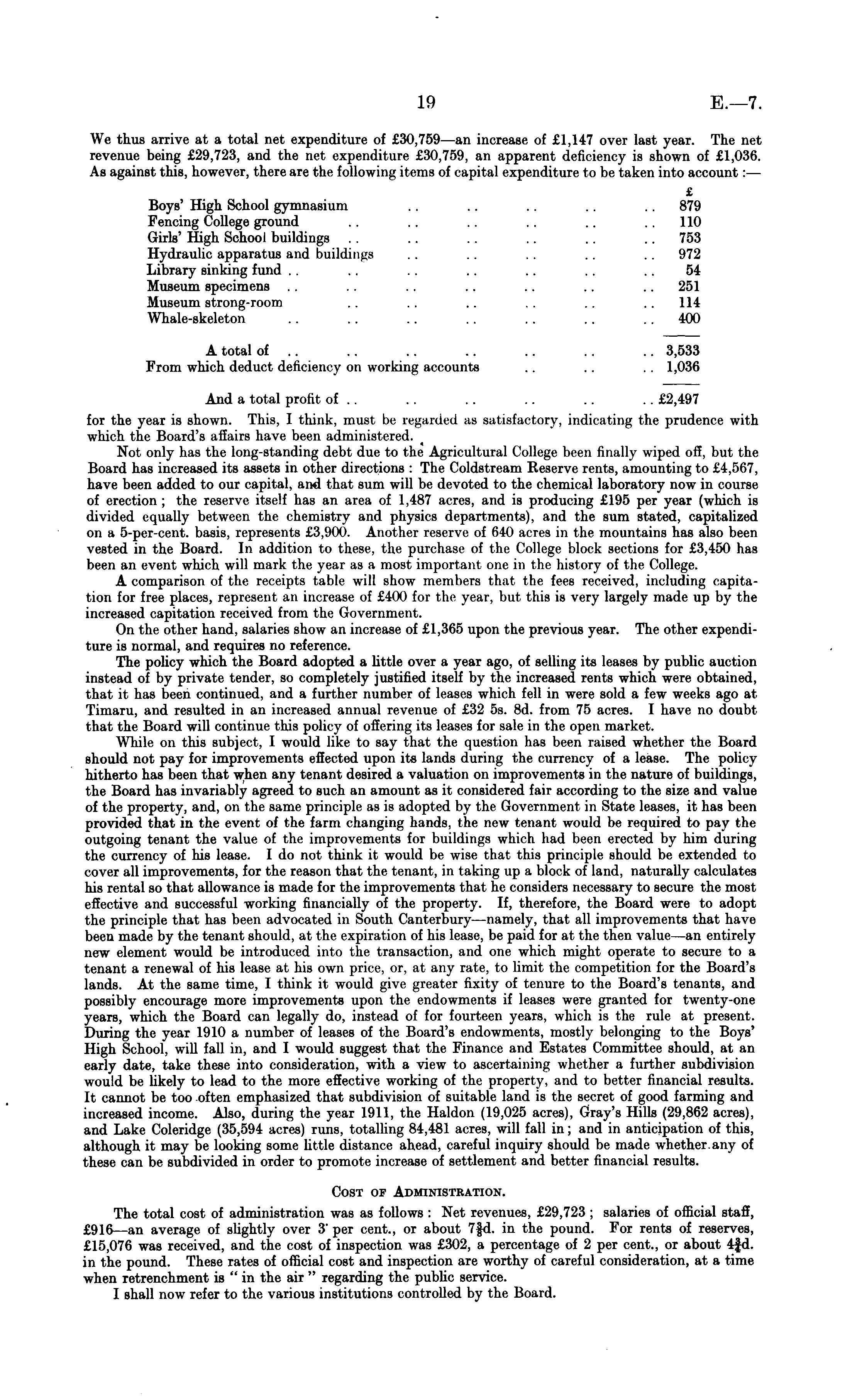 We thus arrive at a total net expenditure of £30,759 —an increase of £1,147 over last year. The net revenue being £29,723, and the net expenditure £30,759, an apparent deficiency is shown of £1,036. As against this, however, there are the following items of capital expenditure to be taken into account: — £ Boys' High School gymnasium . . .. .. . . . . 879 Fencing College ground .. .. .. .. .. 110 Girls' High School buildings . . .. .. .. .. 753 Hydraulic apparatus and buildings .. .. .. .. .. 972 Library sinking fund . . . . .. . . .. . . .. 54 Museum specimens .. .. .. .. .. .. .. 251 Museum strong-room .. .. .. .. . . 114 Whale-skeleton .. . . .. .. . . .. 400 A total of .. .. .. .. .. .. .. 3,533 From which deduct deficiency on working accounts .. . . . . 1,036 And a total profit of .. .. .. .. .. .. £2,497 for the year is shown. This, I think, must be regarded as satisfactory, indicating the prudence with which the Board's affairs have been administered. Not only has the long-standing debt due to the Agricultural College been finally wiped off, but the Board has increased its assets in other directions : The Coldstream Reserve rents, amounting to £4,567, have been added to our capital, and that sum will be devoted to the chemical laboratory now in course of erection ; the reserve itself has an area of 1,487 acres, and is producing £195 per year (which is divided equally between the chemistry and physics departments), and the sum stated, capitalized on a 5-per-cent. basis, represents £3,900. Another reserve of 640 acres in the mountains has also been vested in the Board. In addition to these, the purchase of the College block sections for £3,450 has been an event which will mark the year as a most important one in the history of the College. A comparison of the receipts table will show members that the fees received, including capitation for free places, represent an increase of £400 for the year, but this is very largely made up by the increased capitation received from the Government. On the other hand, salaries show an increase of £1,365 upon the previous year. The other expenditure is normal, and requires no reference. The policy which the Board adopted a little over a year ago, of soiling its leases by public auction instead of by private tender, so completely justified itself by the increased rents which were obtained, that it has been continued, and a further number of leases which fell in were sold a few weeks ago at Tiniaru, and resulted in an increased annual revenue of £32 ss. Bd. from 75 acres. I have no doubt that the Board will continue this policy of offering its leases for sale in the open market. While on this subject, I would like to say that the question lias been raised whether the Board should not pay for improvements effected upon its lands durinji fee currency of a lease. The policy hitherto has been that when any tenant desired a valuation on improvements in the nature of buildings, the Board has invariably agreed to such an amount as it considered fair according to the size and value of the property, and, on the same principle as is adopted by the Government in State leases, it has been provided that in the event of the farm changing hands, the new tenant would be required to pay the outgoing tenant the value of the improvements for buildings which had been erected by him during the currency of his lease. Ido not think it would be wise that this principle should be extended to cover all improvements, for the reason that the tenant, in taking up a block of land, naturally calculates his rental so that allowance is made for the improvements that he considers necessary to secure the most effective and successful working financially of the property. If, therefore, the Board were to adopt the principle that has been advocated in South Canterbury—namely, that all improvements that have been made by the tenant should, at the expiration of his lease, be paid for at the then value—an entirely new element would be introduced into the transaction, and one which might operate to secure to a tenant a renewal of his lease at his own price, or, at any rate, to limit the competition for the Board's lands. At the same time, I think it would give greater fixity of tenure to the Board's tenants, and possibly encourage more improvements upon the endowments if leases were granted for twenty-one years, which the Board can legally do, instead of for fourteen years, which is the rule at present. During the year 1910 a number of leases of the Board's endowments, mostly belonging to the Boys' High School, will fall in, and I would suggest that the Finance and Estates Committee should, at an early date, take these into consideration, with a view to ascertaining whether a further subdivision would be likely to lead to the more effective working of the property, and to better financial results. It cannot be too often emphasized that subdivision of suitable land is the secret of good farming and increased income. Also, during the year 1911, the Haldon (19,025 acres), Gray's Hills (29,862 acres), and Lake Coleridge (35,594 acres) runs, totalling 84,481 acres, will fall in; and in anticipation of this, although it may be looking some little distance ahead, careful inquiry should be made whether.any of these can be subdivided in order to promote increase of settlement and better financial results. Cost of Administration. The total cost of administration was as follows : Net revenues, £29,723 ; salaries of official staff, £916 —an average of slightly over 3' per cent., or about 7fd. in the pound. For rents of reserves, £15,076 was received, and the cost of inspection was £302, a percentage of 2 per cent., or about 4|d. in the pound. These rates of official cost and inspection are worthy of careful consideration, at a time when retrenchment is " in the air " regarding the public service. I shall now refer to the various institutions controlled by the Board.