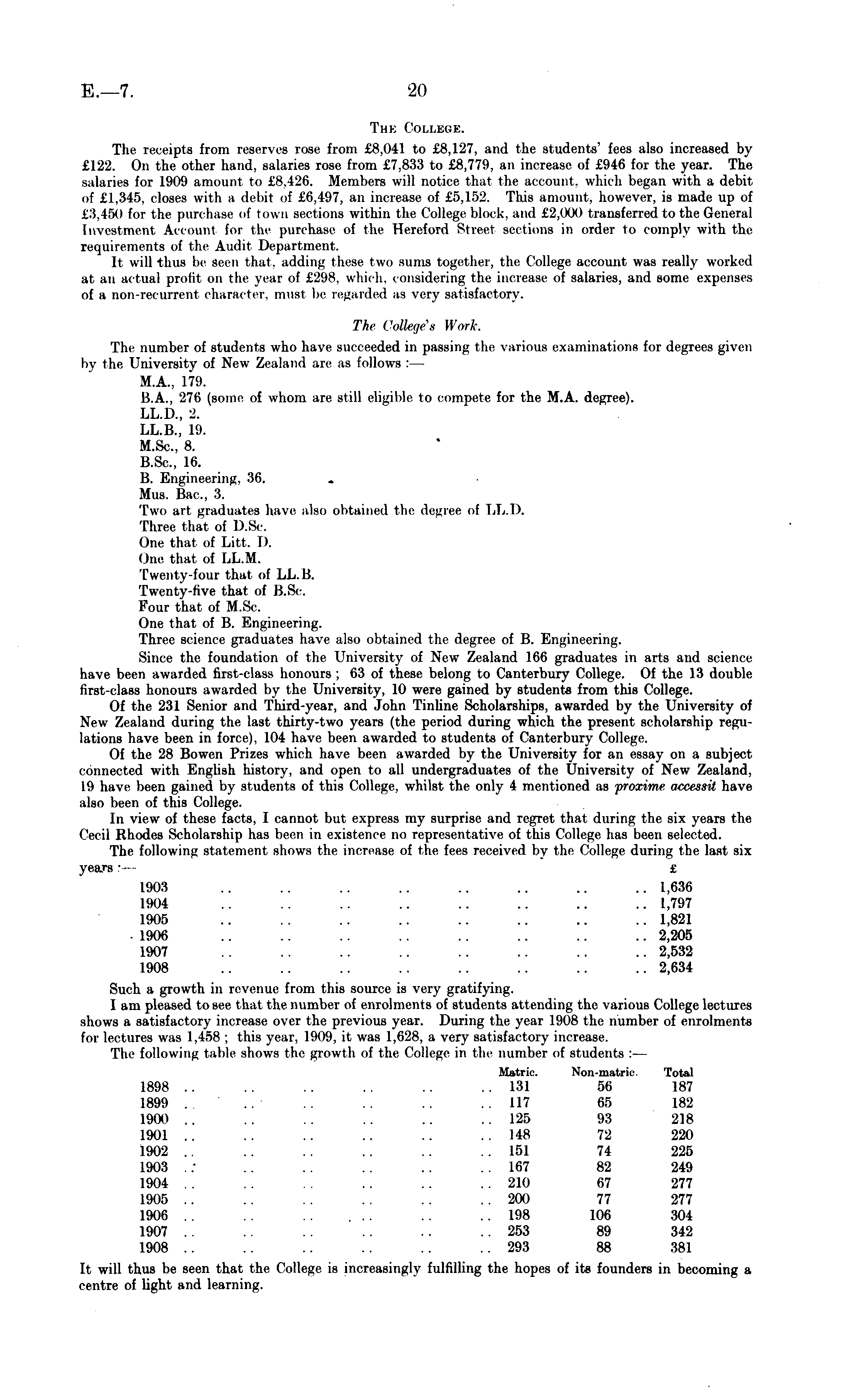 The College. The receipts from reserves ruse from £8,041 to £8,127, and the students" fees also increased by £122. On tlic other hand, salaries rose from £7,833 to £8,779, an increase of £946 for the year. The salaries for 1909 amount to £8,426. Members will notice thai the account, which began with a debit of £I,S4S, closes with a debit of £6,497. an increase of £5,152. This amount, however, is made up of £3,460 for the purchase of town sections within the College block, and tii.ixx) transferred totheGeneral Investment Account for the purchase of the Hereford Street sections in order to comply with the requirements of the Audit Department. It will thus he seen that, adding these two sums together, the College account was really worked at an actual profit on the year of £298. which, considering the increase of salaries, and some expenses of a non-recurrent character, must lie regarded as very satisfactory. The College's Work. The number of students who have succeeded in passing the various examinations for degrees given by the. University of New Zealand are as follows : — M.A., 179. 8.A., 276 (some of whom are still eligible to compete for the M.A. derive*. LL.D., 2. LL.B., 19. M.Sc., 8. B.Sc., 16. B. Engineering. 36. .Miis. Bac, •'}. Two art graduates have also obtained the degree <>f LL.D. Three that of D.Sc. One that of Litt, I>. One that of LL.M. Twenty-four that of LL.B. Twenty-five that of B.Sc. Poor that of M.Sc. One that of B. Engineering. Three science graduates have also obtained the degree of B. Engineering. Since the foundation of the University of New Zealand 166 graduates in arts and science have been awarded first-class honours ;63 of these belong to Canterbury College. Of the 13 double first-class honours awarded by the University, 10 were gained by students from this College. Of the 231 Senior and Third-year, and John Tinline Scholarships, awarded by the University of New Zealand during the last thirty-two years (the period during which the present scholarship regulations have been in force), 104 have been awarded to students of Canterbury College. Of the 28 Bowen Prizes which have, been awarded by the University for an essay on a subject connected with English history, and open to all undergraduates of the University of New Zealand, I'J have been gained by students of this College, whilst the only 4 mentioned as froxime accessit have also been of this College. In view of these facts, I cannot but express my surprise and regret that during the six years the Cecil Khodes Scholarship has been in existence no representative of this College has been selected. The following statement shows the increase of the fees received by the College during the last six years • — v L 903 .. .. .. .. .. .. .. .. 1,636 1904 .. .. .. .. .. .. .. .. 1,797 1905 .. .. .. .. .. .. .. .. 1,821 • 1906 .. .. .. .. .. .. .. .. 2,205 1907 .. .. .. .. .. .. .. .. 2,532 1908 .. .. .. .. .. .. .. .. 2,634 Such a growth in revenue from this source is very gratifying. I am pleased to see that the number of enrolments of students attending the various College lectures shows a satisfactory increase over the previous year. During the year 1908 the number of enrolments lor lectures was 1,458 ; this year. L 909, it was 1,628, a very satisfactory increase. The following table shows the growth of the College in the number of students :— Matrii. Non-matrie. Total 18118 .. .. .. .. .. ..131 56 187 1899 . .. .. . . . . .. 117 65 182 1900 .. .. .. .. .. ..125 93 218 1901 .. .. .. .. .. ..148 72 220 1902 . .. .. .. .. ..151 74 225 1903 .: .. .. .. .. ..167 82 249 1904 . . .. .. .. .. .. 210 67 277 1905 .. .. .. .. .. .. 200 77 277 1906 .. .. .. .. .. .. 198 106 304 1907 .. .. ..253 89 342 1908 .. .. .. .. .. ..293 88 381 It will thus be seen that the College is increasingly fulfilling the hopes of its founders in becoming a centre of light and learning.