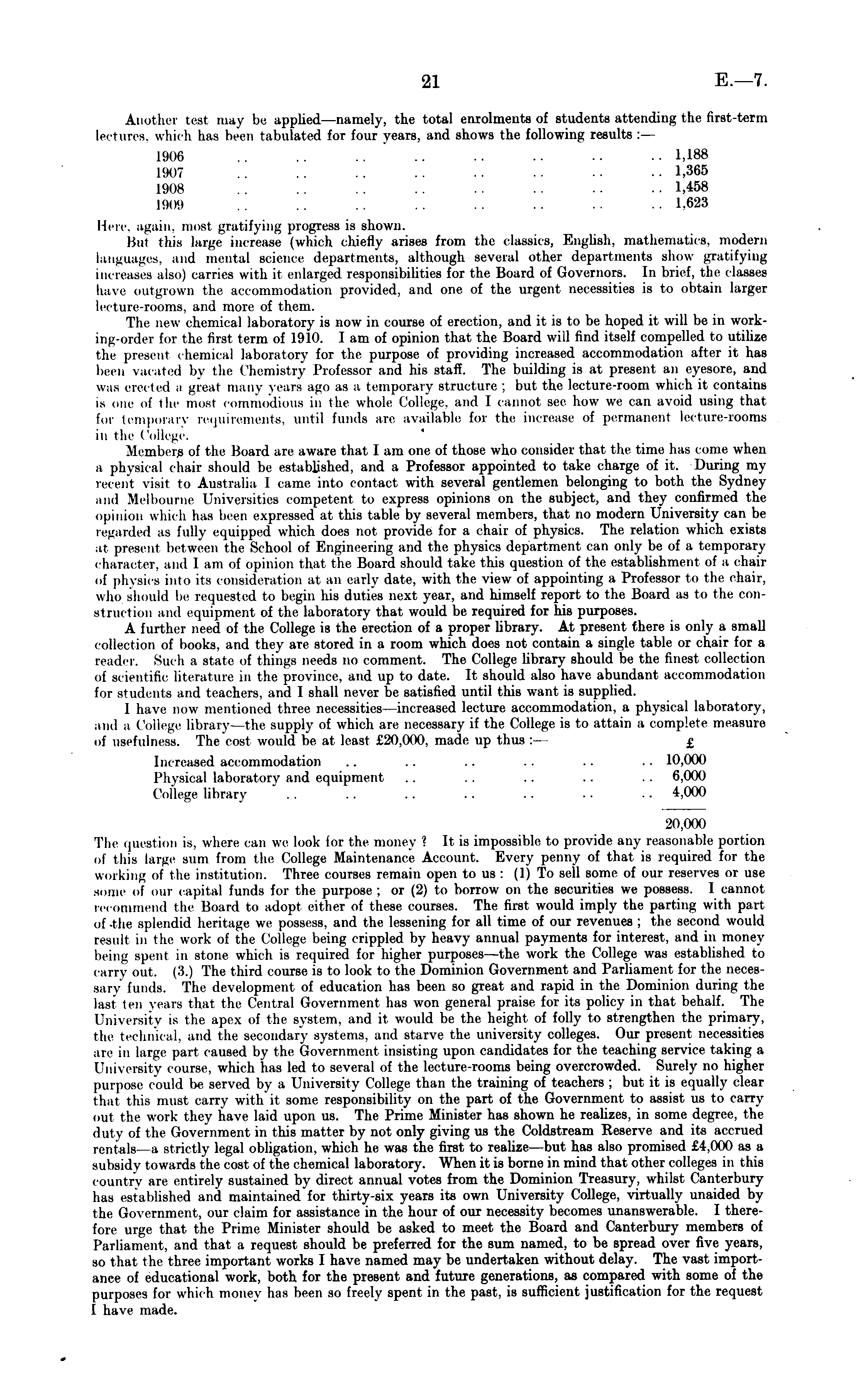 Another test may be applied—namely, the total enrolments of students attending the first-term lectures, which lias been tabulated for four years, and shows the following results : — L 906 1,188 11)07 1,365 1908 .. .. .. .. .. .. •• •• 1,458 L 909 .. .. .. .. ■■ l- (i - ;! Here, again, most gratifying progress is shown. Bui this large increase (which chiefly arises from the classics, English, mathematics, modern languages, and mental science departments, although several other departments show gratifying increases also) carries with it enlarged responsibilities for the Board of Governors. In brief, the classes have outgrown the accommodation provided, and one of the urgent necessities is to obtain larger lecture-rooms, and more of them. The new chemical laboratory is how in course of erection, and it is to be hoped it will be in work-ing-order for the first term of 1910. lam of opinion that the Board will find itself compelled to utilize the present chemical laboratory for the purpose of providing increased accommodation after it has been vacated by the Chemistry Professor and his staff. The building is at present an eyesore, and was erected a greal many years ago as a temporary structure ; but the lecture-room which it contains is one of the moel commodious in the whole College, and I cannot sec how we can avoid using that for temporary requirements, until funds are available for the increase of permanent lecture-rooms in t he ( lollege. Members of the I'.oard are aware that I am one of those who consider that the time has come when a physical chair should be established, and a Professor appointed to take charge of it. During my recent visit to Australia I came into contact with several gentlemen belonging to both the Sydney and Melbourne Universities competent to express opinions on the subject, and they confirmed the opinion which has been expressed at this table by several members, that no modern University can be regarded as fully equipped which does not provide for a chair of physics. The relation which exists .ii present between the School of Engineering and the physics department can only be of a temporary character, and I am of opinion that the. hoard should take this question of the establishment of a chair of physics into its consideration at an early date, with the view of appointing a Professor to the chair, who should be requested to begin his duties next year, and himself report to the Board as to the con struct ion and equipment of the laboratory that would be required for his purposes. A further need of the College is the erection of a proper library. At present there is only a small collection of books, and they are stored in a room which does not contain a single table or chair for a reader. Such a state of things needs no comment. The College library should be the finest collection of scientific literature in the. province, and up to date. It should also have abundant accommodation for students and teachers, and 1 shall never be satisfied until this want is supplied. I have now mentioned three necessities —increased lecture accommodation, a physical laboratory, and a College library —the supply of which are necessary if the College is to attain a complete measure of usefulness. The cost would be at least £20,000, made up thus: — £ Increased accommodation .. .. .. .. .. .. 10,000 IMiysical laboratory and equipment .. .. .. .. .. 6,000 College library .. .. .. .. •• ■• •• 4,000 20,000 The question is, where can we look lor the money i It is impossible to provide auy reasonable portion of tins large sum from the College Maintenance Account. Every penny of that is required for the working of the institution. Three courses remain open to us : (1) To sell some of our reserves or use some of our capital funds for the purpose; or (2) to borrow on the securities we possess. I cannot recommend the Board to adopt either of these courses. The first would imply the parting with part ol -the splendid heritage we possess, and the lessening for all time of our revenues ; the second would result in the work of the College being crippled by heavy annual payments for interest, and in money being speni in stone which is required for higher purposes —the work the College was established to carry out. (3.) The third course is to look to the Dominion Government and Parliament for the necessary funds. The development of education has been so great and rapid in the Dominion during the last ten years that the Central Government has won general praise for its policy in that behalf. The University is the apex of the system, and it would be the height of folly to strengthen the primary, the technical, and the secondary systems, and starve the university colleges. Our present necessities are in large part caused by the Government insisting upon candidates for the teaching service taking a University course, which has led to several of the lecture-rooms being overcrowded. Surely no higher purpose could be served by a University College than the training of teachers ; but it is equally clear that this must carry with it some responsibility on the part of the Government to assist us to carry out the work they have laid upon us. The Prime Minister has shown he realizes, in some degree, the duty of the Government in this matter by not only giving us the Coldstream Reserve and its accrued rentals a strictly legal obligation, which he was the first to realize —but has also promised £4,000 as a subsidy towards the cost of the chemical laboratory. When it is borne in mind that other colleges in this country are entirely sustained by direct annual votes from the Dominion Treasury, whilst Canterbury has established and maintained for thirty-six years its own University College, virtually unaided by the Government, our claim for assistance in the hour of our necessity becomes unanswerable. I therefore urge that the Prime Minister should be asked to meet the Board and Ca