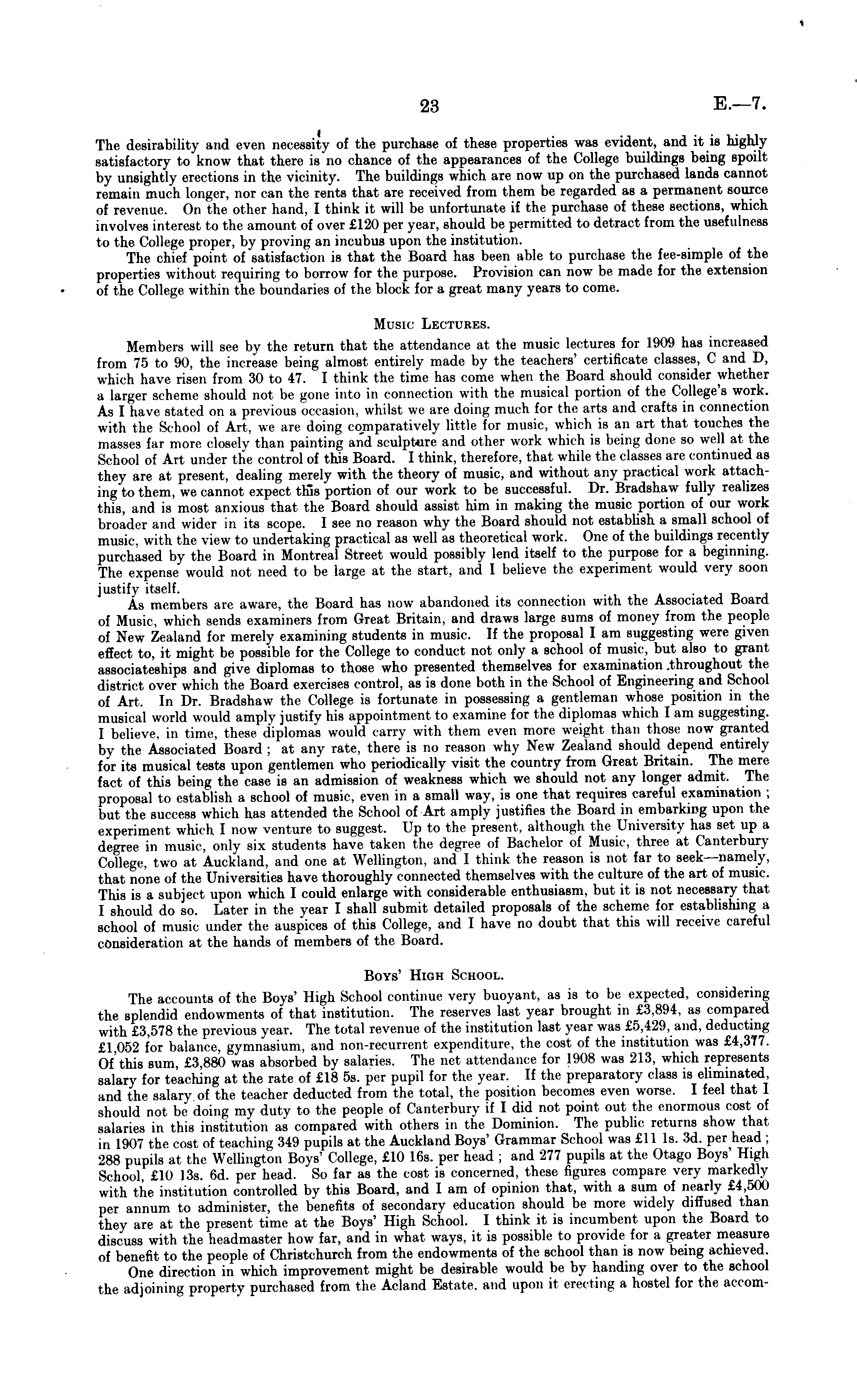 The desirability and even necessity of the purchase of these properties was evident, and it is highly satisfactory to know that there is no chance of the appearances of the College buildings being spoilt by unsightly erections in the vicinity. The buildings which are now up on the purchased lands cannot remain much longer, nor can the rents that are received from them be regarded as a permanent source. of revenue. On the other hand, I think it will be unfortunate if the purchase of these sections, which involves interest to the amount of over £120 per year, should be permitted to detract from the usefulness to the College proper, by proving an incubus upon the institution. The chief point of satisfaction is that the Board has been able to purchase the fee-simple of the properties without requiring to borrow for the purpose. Provision can now be made for the extension of the College within the boundaries of the block for a great many years to come. Music Lectures. Members will see by the return that the attendance at the music lectures for 1909 has increased from 75 to 90, the increase being almost entirely made by the teachers' certificate classes, C and D, which have risen from 30 to 47. I think the time has come when the Board should consider whether a larger scheme should not be gone into in connection with the musical portion of the College's work. As I have stated on a previous occasion, whilst we are doing much for the arts and crafts in connection with the School of Art, we are doing comparatively little for music, which is an art that touches the masses far more closely than painting and sculpture and other work which is being done so well at the School of Art under tlie control of this Board. I think, therefore, that while the classes are continued as they are at present, dealing merely with the theory of music, and without any practical work attachingto them, we cannot expect tKis portion of our work to be successful. Dr. Bradshaw fully realizes this, and is most anxious that the Board should assist him in making the music portion of our work broader and wider in its scope. I see no reason why the Board should not establish a small school of music, with the view to undertaking practical as well as theoretical work. One of the buildings recently purchased by the Board in Montreal Street would possibly lend itself to the purpose for a beginning. The expense would not need to be large at the start, and I believe the experiment would very soon justify itself. . As members are aware, the Board has now abandoned its connection with the Associated Board of Music which sends examiners from Great Britain, and draws large sums of money from the people of New Zealand for merely examining students in music. If the proposal lam suggesting were given effect to, it might be possible for the College to conduct not only a school of music, but also to grani associateships and give diplomas to those who presented themselves for examination throughout the district over which the Board exercises control, as is done both in the School of Engineering and School of Art. In Dr. Bradshaw the College is fortunate in possessing a gentleman whose position in the musical world would amply justify his appointment to examine for the diplomas which I am suggesting. I believe, in time, these diplomas would carry with them even more weighi than those now granted by the Associated Board; at any rate, there is no reason why New Zealand should depend entirely for its musical tests upon gentlemen who periodically visit the country from Great Britain. The mere, fact of this being the case is an admission of weakness which we should not any longer admit. The proposal to establish a school of music, even in a small way, is one that requires careful examination ; but the success which has attended the School of Art amply justifies the Board in embarking upon the experiment which I now venture to suggest. Up to the present, although the University has set up a degree in music, only six students have taken the degree of Bachelor of Music, three at Canterbury College, two at Auckland, and one at Wellington, and I think the reason is not far to seek—namely, that none of the Universities have thoroughly connected themselves with the culture of the art of music. This is a subject upon which 1 could enlarge with considerable enthusiasm, but it is not necessary that 1 should do so. Later in the year I shall submit detailed proposals of the scheme for establishing a school of music under the auspices of this College, and I have no doubt that this will receive careful consideration at the hands of members of the Board. Boys' High School. The accounts of the Boys' High School continue very buoyant, as is to be expected, considering the splendid endowments of that institution. The reserves last year brought in £3,894, as compared with £3,578 the previous year. The total revenue of the institution last year was £6,429, and, deducting £1 052 for balance, gymnasium, and non-recurrent expenditure, the cost of the institution was £4,377. Of'this sum, £3,880 was absorbed by salaries. The net attendance for 1908 was 213, which represents salary for teaching at the rate of £18 ss. per pupil for the year. If the preparatory class is eliminated, and the salary of the teacher deducted from the total, the position becomes even worse. I feel that 1 should not be doing my duty to the people of Canterbury if 1 did not point out the enormous cost of salaries in this institution as compared with others in the Dominion. The public returns show that in 1907 the cost of teaching 849 pupils at the Auckland Boys' Grammar School was £11 Is. 3d. per head ; 288 pupils at the Wellington Boys' College. £10 His. per head ; and 277 pupils at the Otago Boys' High School, £H> 13s. 6d. per head. So far as the cost is concerned, these figures compare very markedly with the institution controlled by this Board, and I am of opinion that, with a sum of n