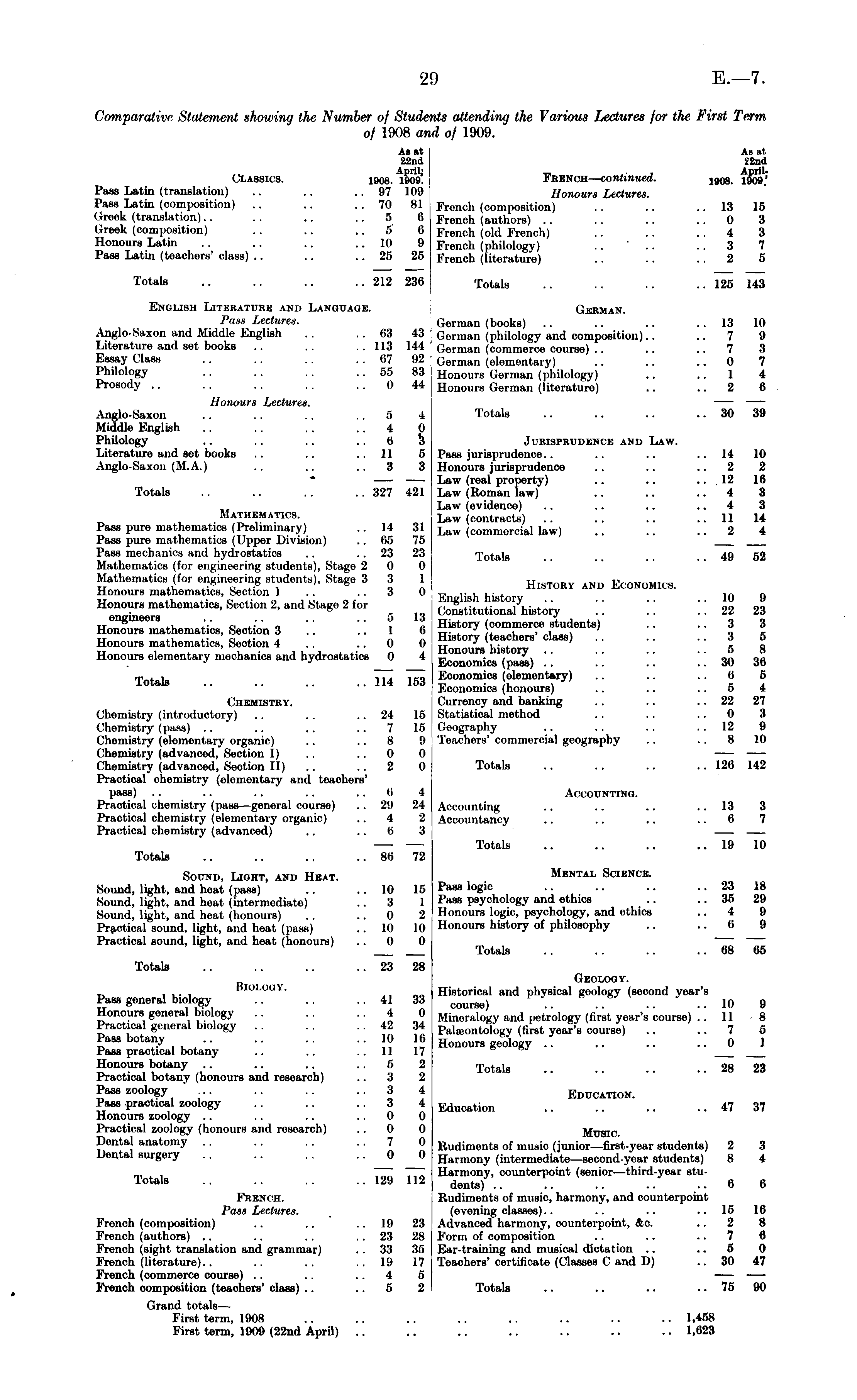A. at 22nd Classics. 1908. 190V. Pass Latin (translation) .. .. .. !)7 109 Pass Latin (comjiosition) .. .. 70 81 Greek (translation).. .. .. ..5 6 Greek (composition) .. .. . r > ti Honours Latin .. .. .. ..10 9 Pass Latin (teachers' class) .. .. .. 25 25 Totals .. .. .. .. 212 236 English Literature and Language. Pas* Lectures. Anglo-Saxon and Middle English .. 63 43 Literature and set books .. .113 144 Essay Class .. .. (i7 92 Philology .. . . 55 83 Prosody .. .. .. .. .. 0 44 Honours Lectures. Anglo-Saxon .. .. .. .. 5 4 Middle English .. .. ..40 Philology .. .. 6 S Literature and set books .. ..11 5 Anglo-Saxon (M.A.) .. ..3 3 Totals .. .. .. .. 327 421 Mathematics. Pass pure mathematics (Preliminary) 14 31 Pass puro mathematics (Upper Division) . . 66 75 Pass mechanics and hydrostatics .. 23 23 Mathematics (for engineering students), Stage 2 0 0 Mathematics (for engineering students), Stage 3 3 1 Honours mathematics, Section 1 .. .. 3 0 Honours mathematics, Section 2, and Stage 2 for engineers .. .. .. 5 13 Honours mathematics, Section 3 .. .. 1 6 Honours mathematics, Section 4 .. .. 0 0 Honours elementary mechanics and hydrostatics 0 4 Totals .. .. .. .. 114 153 (HKMISTRY. Chemistry (introductory) .. .. 24 15 Chemistry (pass) .. .. .. 7 15 Chemistry (elementary organic) .. .. 8 9 Chemistry (advanced, Section I) .. .. 0 0 Chemistry (advanced, Section II) .. .. 2 0 Practical chemistry (elementary and teachers' pass) .. .. .. .. .. 6 4 Practical chemistry (pass—general course) .. 29 24 Practical chemistry (elementary organic) .. 4 2 Practical chemistry (advanced) .. .. <i 3 Totals .. .. .. .. 8« 72 Sound, Light, and Heat. Sound, light, and heat (pass) .. 10 15 Sound, light, and heat (intermediate) .. 3 I Sound, light, and heat (honours) .. 0 2 Practical sound, light, and heat (pass) .. 10 lo Practical sound, light, and heat (honours) .. 0 0 Totals .. .. .. . . 23 28 BlOLOGl . Pass general biology .. .. ..41 33 Honours general biology .. .. .. 4 0 Practical general biology .. .. 42 34 Pass botany .. .. .. 10 16 Pass practical botany .. .. ..11 17 Honours botany .. .. .. .. 5 2 Practical botany (honours and research) .. 3 2 Pass zoology ... .. .. .. 3 4 Pass practical zoology .. .. .. 3 4 Honours zoology .. .. .. .. 0 0 Practical zoology (honours and research) .. 0 0 Dontal anatomy .. .. . . .. 7 0 Dental surgery .. .. .. .. 0 0 Totals .. .. 129 112 Pb (boh. Pass Lectures. French (composition) .. .. 19 23 French (authors) .. .. .. .. 23 28 French (sight translation and grammar) .. 33 35 French (literature).. .. .. .. 19 17 French (commerce course) .. .. .. 4 5 French composition (teachers' class) .. .. 5 2 Grand totals— First term, 1908 First term, 1909 (22nd April)