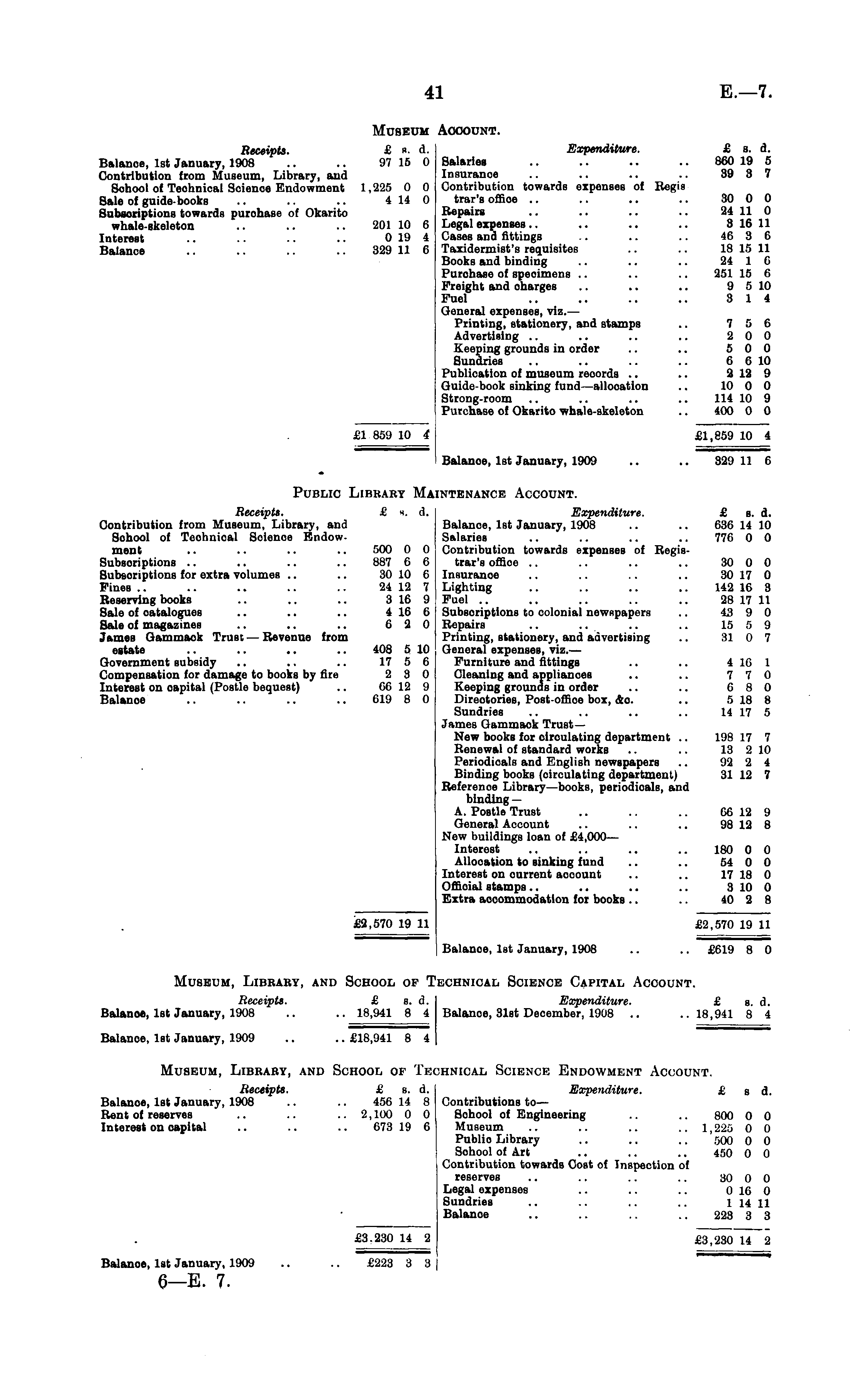 Museum Account. Receipts. £ ». d. Expenditure. £ s. d. Balanoe, Ist January, 1908 .. .. 97 15 0 Salaries .. .. .. .. 860 19 5 Contribution from Museum, Library, and Insuranoe .. .. .. .. 39 8 7 Sohool of Teohnical Science Endowment 1,225 0 0 Contribution towards expenses of Regis Sale of guidebooks .. .. .. 414 0 trar's offioe .. .. .. .. 30 0 0 Subscriptions towards purohase of Okarito Repairs .. .. .. .. 24 11 0 whale-skeleton .. .. .. 201 10 6 Legal expenses.. .. .. .. 3 16 11 Interest .. .. .. .. 0 19 4 Cases and fittings .. .. .. 46 3 6 Balance .. .. .. .. 329 11 6 Taxidermist's requisites .. .. 18 15 11 Books and binding .. .. .. 24 1 6 Purchase of speoimens .. .. .. 251 15 6 Freight and oharges .. .. .. 9 510 Fuel .. .. .. .. 3 14 General expenses, viz.— Printing, stationery, and stamps .. 7 5 6 Advertising .. .. .. .. 2 0 0 Keeping grounds in order .. .. 5 0 0 Sundries .. .. .. .. 6 6 10 Publication of museum records .. .. 2 12 9 Guide-book sinking fund—allocation .. 10 0 0 Strong-room .. .. .. .. 114 10 9 Purchase of Okarito whale-skeleton .. 400 0 0 £1 859 10 4 £1,859 10 4 Balance, Ist January, 1909 .. .. 829 11 6 Public Library Maintenance Account. Receipts. £ t. d. Expenditure. £ s. d. Contribution from Museum, Library, and Balance, Ist January, 1908 .. .. 636 14 10 Sohool of Technioal Science Endow- Salaries .. .. .. .. 776 0 0 ment .. .. .. .. 500 0 0 Contribution towards expenses of RegisSubscriptions .. .. .. .. 887 6 6 trar's offioe .. .. .. .. 30 0 0 Subscriptions for extra volumes .. .. 30 10 6 Insuranoe .. .. .. .. 30 17 0 Fines .. .. .. .. .. 24 12 7 Lighting .. .. .. .. 142 16 3 Reserving books .. .. .. 3 16 9 Fuel .. .. .. .. .. 28 17 11 Sale of catalogues .. .. .. 4 16 6 Subscriptions to colonial newspapers .. 43 9 0 Sale of magazineß .. .. .. 6 2 0 Repairs .. .. .. .. 15 5 9 James Gammack Trust — Revenue from Printing, stationery, and advertising .. 31 0 7 estate .. .. .. .. 408 5 10 General expenses, viz.— Government subsidy .. .. .. 17 5 6 Furniture and fittings .. .. 41C 1 Compensation for damage to books by fire 2 3 0 Cleaning and appliances .. .. 7 7 0 Interest on oapital (Postle bequest) .. 66 12 9 Keeping grounds in order .. .. 6 8 0 Balanoe .. .. .. .. 619 8 0 Directories, Post-offioe box, &o. .. 5 18 8 Sundries .. .. .. .. 14 17 5 James Gammack Trust— New books for circulating department .. 198 17 7 Renewal of standard works .. .. 13 2 10 Periodicals and English newspapers .. 92 2 4 Binding books (circulating department) 31 12 7 Referenoe Library—books, periodicals, and binding — A. Postle Trust .. .. .. 66 12 9 General Account .. .. .. 98 12 8 New buildings loan of £4,000— Interest .. .. .. .. 180 0 0 Allocation to sinking fund .. .. 54 0 0 Interest on current aocount .. .. 17 18 0 Offioial stamps .. .. .. .. 3 10 0 Extra accommodation for books .. .. 40 2 8 £2,570 19 11 £2,570 19 11 Balanoe, Ist January, 1908 .. .. £619 8 0 Museum, Library, and School op Technical Science Capital Account. Receipts. £ s. d. Expenditure. £ s. d. Balanoe, Ist January, 1908 .. .. 18,941 8 4 Balanoe, 31st December, 19U8 .. ..18,941 8 4 Balance, Ist January, 1909 .. .. £18,941 8 4 Museum, Library, and School of Technical Science Endowment Account. Iteceipts. £ s. d. Expenditure. £ s d. Balanoe, Ist January, 1908 .. .. 456 14 8 Contributions to— Rent of reserves .. .. .. 2,100 0 0 School of Engineering .. .. 800 0 0 Interest on capital .. .. .. 673 19 6 Museum .. .. .. .. 1,225 0 0 Publio Library .. .. .. 500 0 0 Sohool of Art .. .. .. 450 0 0 Contribution towards Cost of Inspection of reserves .. .. .. .. 30 0 0 Legal expenses .. .. .. 0 16 0 Sundries .. .. .. .. 1 14 11 Balanoe .. .. .. .. 223 3 3 £3.230 14 2 £3,230 14 2 Balanoe, Ist January, 1909 .. .. £223 3 3 | 6—E. 7.