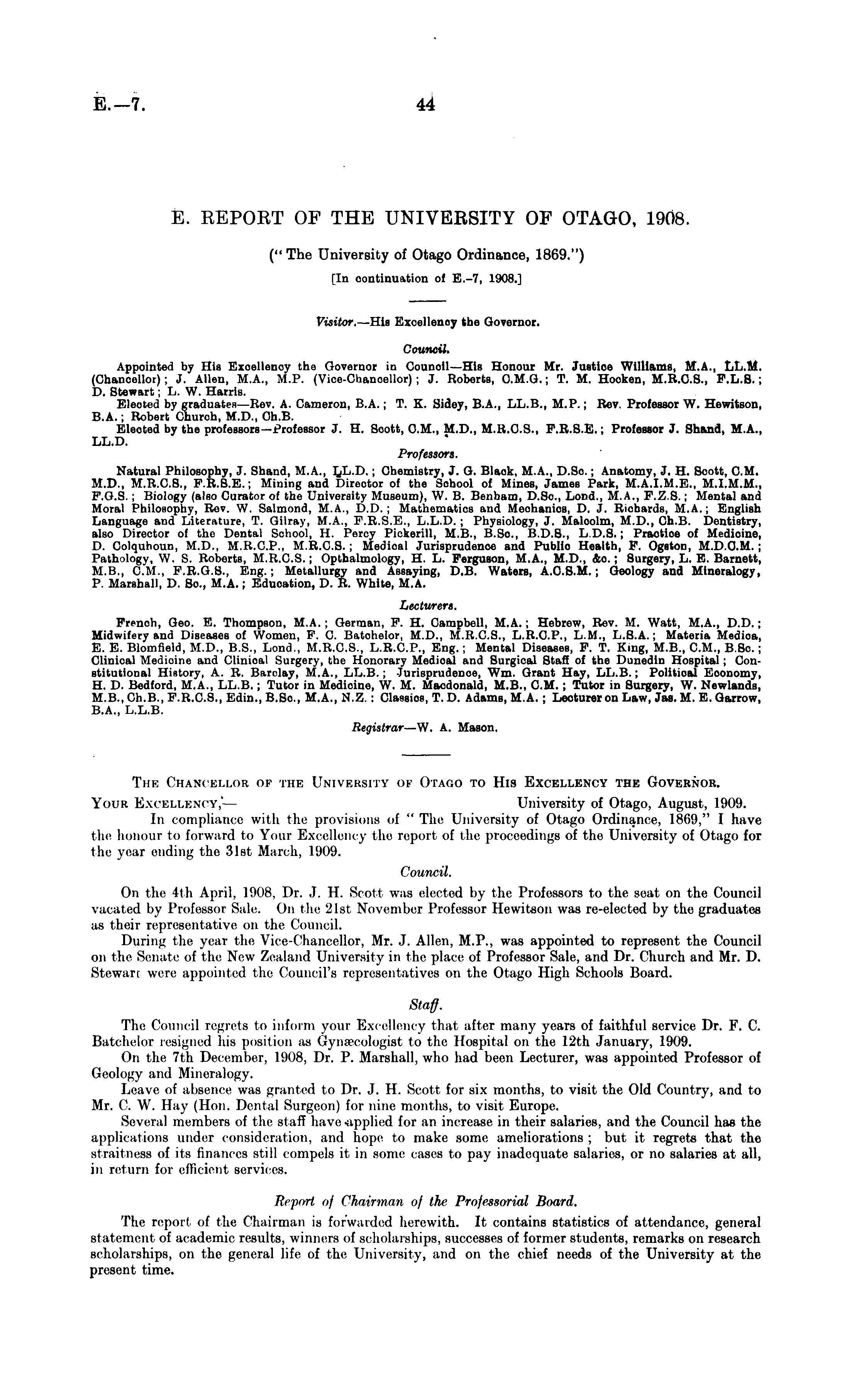 E. REPOKT OF THE UNIVERSITY OF OTAGO, 1908. (" The University of Otago Ordinance, 1869.") [In continuation of E.-7, 1908.] Visitor. —Hie Excellenoy the Governor. Council. Appointed by Hie Exoellenoy the Governor in Council—His Honour Mr. Juetioe Williams, M.A., LL.M. (Chancellor) ;J. Allen, M.A., M.P. (Vice-Chanoellor) ;J. Roberts, 0.M.G.; T. M. Hocken, M.R.C.S., F.L.B. ; D. Stewart; L. W. Harris. Eleoted by graduates—Rev. A. Cameron, 8.A.; T. K. Sidey, 8.A., LL.B., M.P.; Rev. Professor W. Hewitson, 8.A.; Robert Church, M.D., Ch.B. Eleoted by the professors—Professor J. H. Soott, CM., M.D., M.8.0.5., P.R.S.E.; Professor J. Shand, M.A., LL.D. Professors. Natural Philosophy, J. Shand, M.A., LL.D.; Chemistry, J. G. Blaok, M.A., D.So.; Anatomy, J. H. Scott, CM. M.D., M.R.C.S., F.R.S.E.; Mining and Direotor of the School of Mines, James Park, M.A.1.M.E., M.1.M.M., F.G.S. ; Biology (also Curator of the University Museum), W. B. Benham, D.Sc, Lond., M.A., P.Z.S.; Mental and Moral Philosophy, Rev. W. Salmond, M.A., D.D. ; Mathematics and Meohanies, D. J. Richards, M.A.; English Language and Literature, T. Gilray, M.A., P.R.S.E., L.L.D. ; Physiology, J. Maloolm, M.D., Ch.B. Dentistry, also Director of the Dental School, H. Percy Pickerill, M.8., 8.50., 8.D.8., L.D.S.; Praotice of Medicine, D. Colquhoun, M.D., M.R.C.P., M.R.C.S. ; Medical Jurisprudence and Public Health, P. Ogston, M.D.C.M. ; Pathology, W. S. Roberts, M.R.C.S.; Opthalmology, H. L. Ferguson, M.A., M.D., <feo. ; Surgery, L. E. Barnett, M.8., CM., F.R.G.8., Eng. ; Metallurgy and Assaying, D.B. Waters, A.C.S.M. ; Geology and Mineralogy, P. Marshall, D. So., M.A. ; Education, D. R. White, M.A. Lecturers. French, Geo. E. Thompson, M.A. ; German, P. H. Campbell, M.A. ; Hebrew, Rev. M. Watt, M.A., D.D.; Midwifery and Diseases of Women, F. C. Batohelor, M.D., M.R.C.S., L.R.C.P., L.M., L.8.A.; Materia Medioa, E. E. Blomfield, M.D., 8.5., Lond., M.R.C.S., L.R.C.P., Eng. ; Mental Diseases, F. T. King, M.8., CM., B.Sc.; Clinical Medicine and Clinioal Surgery, the Honorary Medical and Surgical Staff of the Dunedin Hospital ; Constitutional History, A. R. Barclay, M.A., LL.B. ; Jurisprudence, Wm. Grant Hay, LL.B.; Political Eoonomy, H. D. Bedford, M.A., LL.B. ; Tutor in Medicine, W. M. Macdonald, M.8., CM. ; Tutor in Surgery, W. Newlands, M.8.,Ch.8., P.R.C.S., Edin.,B.Sc, M.A., N.Z. : Claesioa, T. D. Adams, M.A. ; Lecturer on Law, Jas. M. E.Garrow, 8.A., L.L.B. Registrar —W. A. Mason. Tiik Chancellor of the Univkhsiiv <>!■■ Otago to His Excellency the Governor. Your Excki.i.kncy,'— University of Otago, August, 1909. In compliance with the provisions of " The University of Otago Ordinance, 1869," I have tin , honour to forward to Your Excellency the report of the proceedings of the Univorsity of Otago for the year ending the 31st March, 1909. Council. On the 4th April, 1908, Dr. J. H. Scott was elected by the Professors to the seat on the Council vacated by Professor Sale. On the 21st November Professor Hewitson was re-elected by the graduates as their representative on the Council. During the year the Vice-Chancellor, Mr. J. Allen, M.P., was appointed to represent the Council on the Senate of the New Zealand University in the place of Professor Sale, and Dr. Church and Mr. D. Stewart were appointed the Council's representatives on the Otago High Schools Board. Staff. The Council regrets to inform your Excellency that after many years of faithful service Dr. F. C. Batchelor resigned his position as GrynSßCologist to the Hospital on the 12th January, 1909. On the 7th December, 1908, Dr. P. Marshall, who had been Lecturer, was appointed Professor of Geology and Mineralogy. Leave of absence was granted to Dr. J. H. Scott for six months, to visit the Old Country, and to Mr. ( . \\. lln (Hon. Dental Surgeon) for nine months, to visit Europe. Several members of the staff have .applied for an increase in their salaries, and the Council has the applications under consideration, and hope to make some ameliorations ; but it regrets that the strait ness of its finances still compels it in some cases to pay inadequate salaries, or no salaries at all, in return for efficient services. Report of Chairman of the Professorial Board. The report of the Chairman is forwarded herewith. It contains statistics of attendance, general statement of academic results, winners of scholarships, successes of former students, remarks on research scholarships, on the general life of the University, and on the chief needs of the University at the present time.