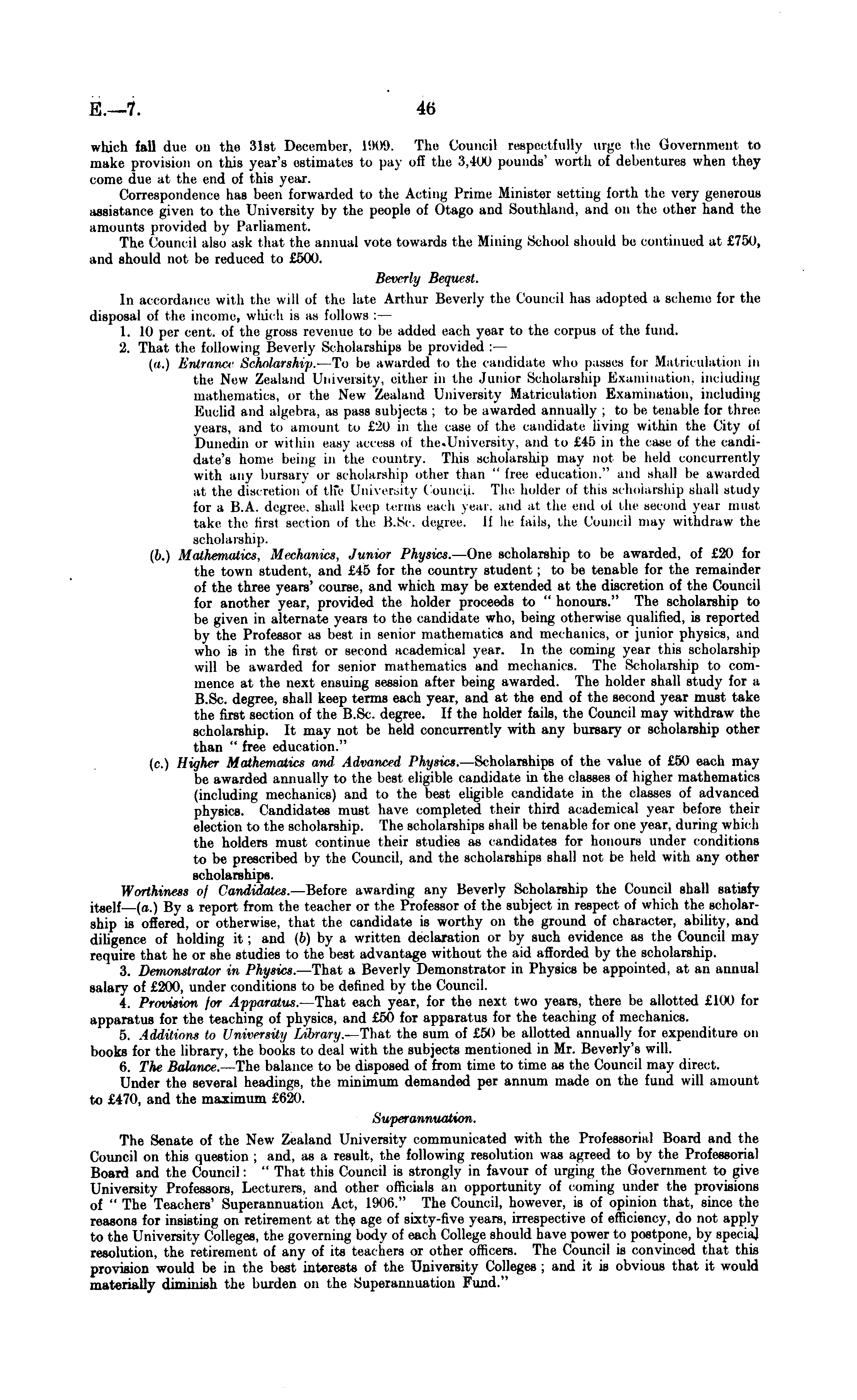 which fall due on the 31st December, 1909. The Council respectfully urge the Governmeni to make provision on this year's estimates to pay off the 3,400 pounds' worth of debentures when they come due at the end of this year. Correspondence has been forwarded to the Acting Prime Minister getting forth tin , very generous assistance given to the University by the people of Otago and Southland, and on the other hand the amounts provided by Parliament. The Council also ask that the annual vote towards the Mining School should Ijo continued at £750, and should not be reduced to £500. Beverly Bequest. In accordance with the will of the late Arthur Beverly the Council has adopted a scheme for the disposal of the income, which is as follows : — 1. 10 per cent, of the gross revenue to be added each year to the corpus of the fund. 2. That the following Beverly Scholarships be provided : — (a.) ErilratK-i Scholarship.- —To be awarded to the candidate who passes for Matriculation in i lie New Zealand University, either in the Junior Scholarship Examination, including mathematics, or the New Zealand University Matriculation Examination, including Euclid and algebra, as pass subjects; to be awarded annually ;to be tenable for three years, and to amount to £20 in the case of the candidate living within the City oi Dunedin or within easy access ol the.University. ;ind to £45 in the case of the candidate's home being in the country. This scholarship may not be held concurrently with any bursary or scholarship other than " free education." and shall be awarded at the discretion of tl*e University Council. The holder of tins scholarship shall study for a B.A. degree, shall keep terms each year, and at the end ni the second year must take the first section of the H.Sc. degree. If he fails, the Council may withdraw the scholarship. (b.) Mathematics, Mechanics, Junior Physics. —One scholarship to be awarded, of £20 for the town student, and £45 for the country student; to be tenable for the remainder of the three years' course, and which may be extended at the discretion of the Council for another year, provided the holder proceeds to " honours." The scholarship to be given in alternate years to the candidate who, being otherwise qualified, is reported by the Professor as best in senior mathematics and mechanics, or junior physics, and who is in the first or second academical year. In the coming year this scholarship will be awarded for senior mathematics and mechanics. The Scholarship to commence at the next ensuing session after being awarded. The holder shall study for a B.Sc. degree, shall keep terms each year, and at the end of the second year must take the first section of the B.Sc. degree. If the holder fails, the Council may withdraw the scholarship. It may not be held concurrently with any bursary or scholarship other than " free education." (c.) Higher Mathematics and Advanced Physics. —Scholarships of the value of £50 each may be awarded annually to the best eligible candidate in the classes of higher mathematics (including mechanics) and to the best eligible candidate in the classes of advanced physics. Candidates must have completed their third academical year before their election to the scholarship. The scholarships shall be tenable for one year, during which the holders must continue their studies as candidates for honours under conditions to be prescribed by the Council, and the scholarships shall not be held with any other scholarships. Worthiness of Candidates. —Before awarding any Beverly Scholarship the Council shall satisfy itself— (a.) By a report from the teacher or the Professor of the subject in respect of which the scholarship is offered, or otherwise, that the candidate is worthy on the ground of character, ability, and diligence of holding it; and (6) by a written declaration or by such evidence as the Council may require that he or she studies to the best advantage without the aid afforded by the scholarship. 3. Demonstrator in Physics. —That a Beverly Demonstrator in Physics be appointed, at an annual salary of £200, under conditions to be defined by the Council. 4. Provision for Apparatus. —That each year, for the next two years, there be allotted £100 for apparatus for the teaching of physics, and £50 for apparatus for the teaching of mechanics. 5. Additions to University Library. —That the sum of £50 be allotted annually for expenditure on books for the library, the books to deal with the subjects mentioned in Mr. Beverly's will. 6. The Balance. —The balance to be disposed of from time to time as the Council may direct. Under the several headings, the minimum demanded per annum made on the fund will amount to £470, and the maximum £620. Superannuation. The Senate of the New Zealand University communicated with the Professorial Board and the Council on this question ; and, as a result, the following resolution was agreed to by the Professorial Board and the Council: " That this Council is strongly in favour of urging the Government to give University Professors, Lecturers, and other officials an opportunity of coming under the provisions of " The Teachers' Superannuation Act, 1906." The Council, however, is of opinion that, since the reasons for insisting on retirement at the age of sixty-five years, irrespective of efficiency, do not apply to the University Colleges, the governing body of each College should have power to postpone, by special resolution, the retirement of any of its teachers or other officers. The Council is convinced that this provision would be in the best interests of the University Colleges ; and it is obvious that it would materially diminish the burden on the Superannuation Fund."