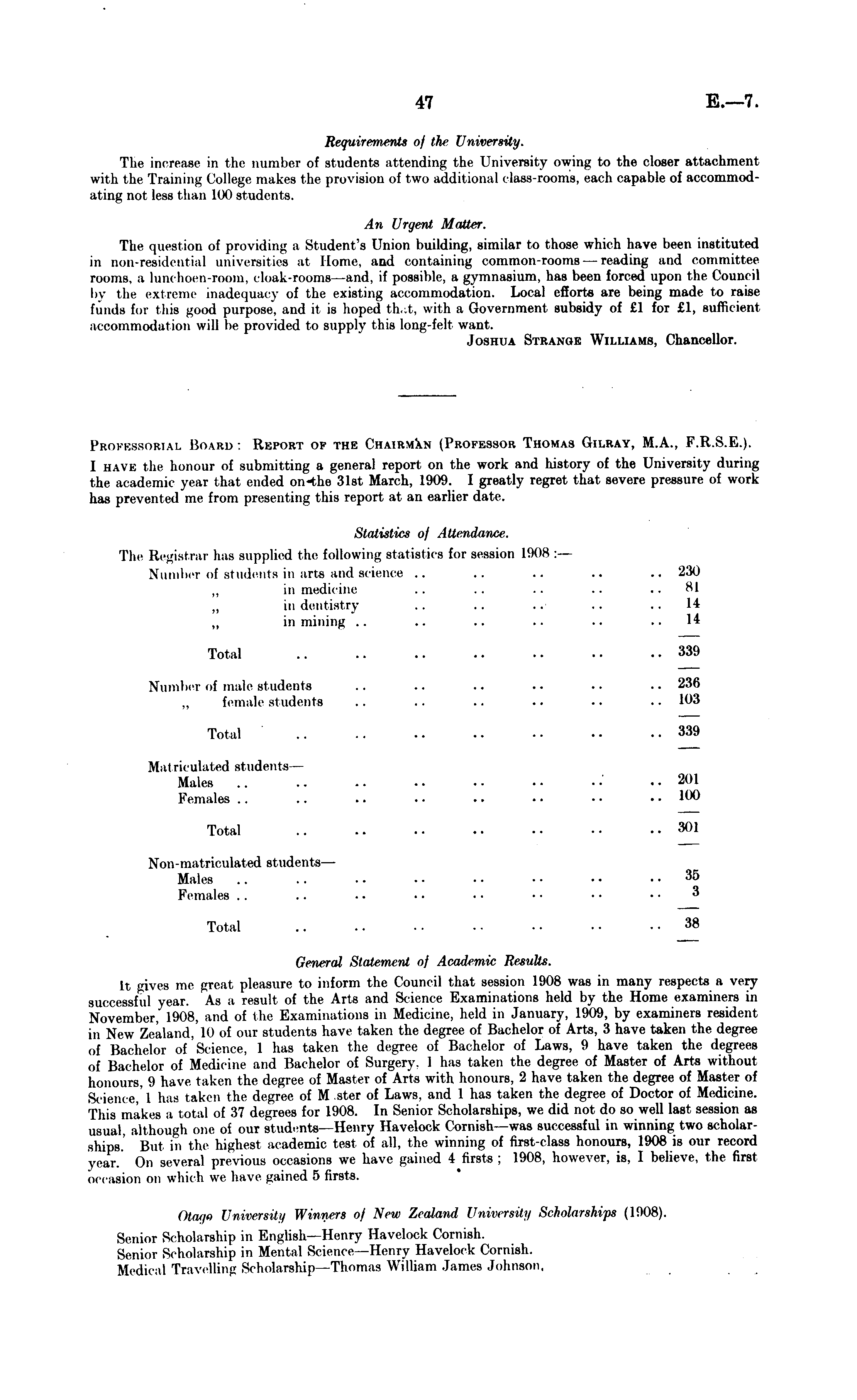 Professorial Board : Report of the ChairmXn (Professor Thomas Gilray, M.A., F.R.S.E.). I have the honour of submitting a general report on the work and history of the University during the academic pear that ended on-the 31st March, 1909. I greatly regret that severe pressure of work has prevented me from presenting this report at an earlier date. Statistics of Attendance. The Registrar has supplied the following statistics for session 1008 :— Number of students in arte and science .. .. .. .. .. 230 „ in medicine . . . . . . . . . . 81 „ in dentistry .. .. .. .. .. 14 „ in mining .. .. .. .. .. .. 14 Total 339 Number of male students .. .. .. •• •• •• 236 ,, female students .. .. .. .. .. •• 108 Total 339 Matriculated students — Males .. .. .. .. •• •• ••' •• 201 Females .. .. .. .. .. • • • • •• 100 Total 301 Non-matriculated students — Males .. .. • • • • • • • • • • 35 Females .. .. .. • • • • • • • • • • 3 Total .. .. .. • • • • 38 General Statement of Academic Results. It gives me great pleasure to inform the Council that session 1908 was in many respects a very successful year. As a result of the Arts and Science Examinations held by the Home examiners in November, 1908, and of the Examinations in Medicine, held in January, 1909, by examiners resident in New Zealand, 10 of our students have taken the degree of Bachelor of Arts, 3 have taken the degree of Bachelor of Science, 1 has taken the degree of Bachelor of Laws, 9 have taken the degrees of Bachelor of Medicine and Bachelor of Surgery. 1 has taken the degree of Master of Arts without honours. 9 have taken the degree of Master of Arts with honours, 2 have taken the degree of Master of Science 1 has taken the degree of M ster of Laws, and 1 has taken the degree of Doctor of Medicine. This makes a total of 37 degrees for 1908. In Senior Scholarships, we did not do so well last session as usual, although one of our students—Henry Havelock Cornish—was successful in winning two scholarships. But in the highest academic test of all, the winning of first-class honours, 1908 is our record year. On several previous occasions we have gained 4 firsts; 1908, however, is, I believe, the first occasion on which we have gained 5 firsts. Otagt) University Winners of New Zealand University Scholarships (1908). Senior Scholarship in English—Henry Havelock Cornish. Senior Scholarship in Mental Science -Henry Havelock Cornish. Medical Travelling Scholarship—Thomas William James Johnson.