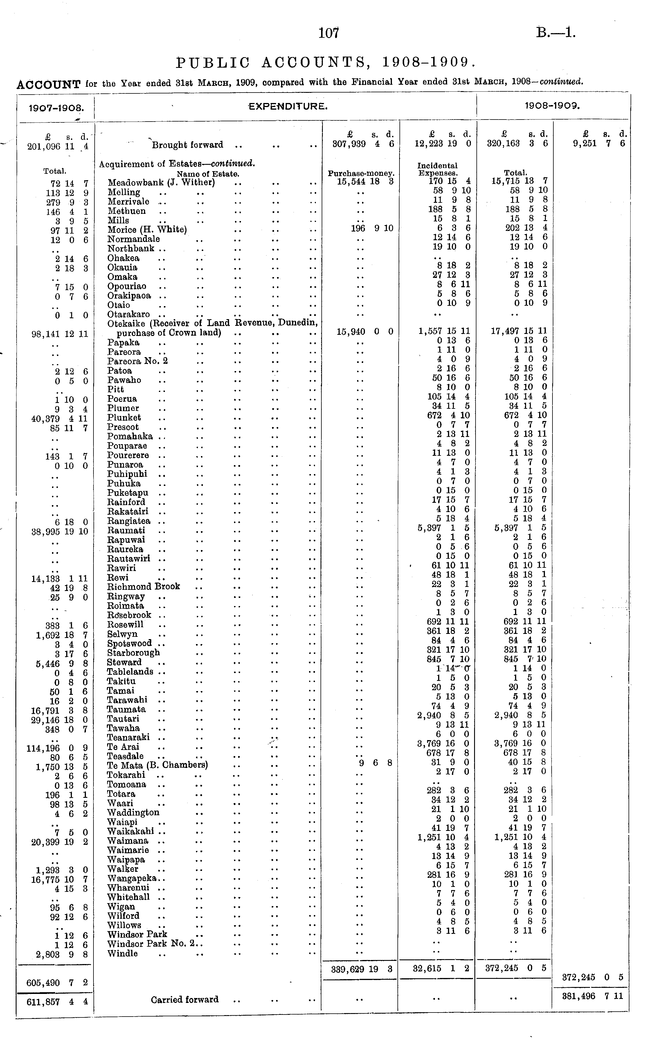 1907-1908. EXPENDITURE. 1908-1909. £ s. d. 201,096 11 4 Brought forward £ s. d. 307,939 4 6 £ s. d. 12,223 19 0 £ s. d. 320,163 3 6 £ s. d. 9,251 7 6 Total. 72 14 7 113 12 9 279 9 3 146 4 1 3 9 5 97 11 2 12 0 6 *2 14 6 2 18 3 "l 15 0 0 7 6 0 10 98,141 12 11 2 12 6 0 5 0 i'lO 0 9 3 4 40,379 4 11 85 11 7 143 1 7 0 10 0 *6 18 0 38,995 19 10 Acquirement of Estates— continued. Name of Estate. Meadowbank (J. Wither) Melling Merrivale ... Methuen Mills Morice (H. White) Normandale Northbank Ohakea Okauia Omaka Opouriao Orakipaoa Otaio Otarakaro Otekaike (Beoeiver of Land Revenue, Dunedin, purchase of Crown land) Papaka Pareora Pareora No. 2 Patoa Pawaho Pitt .. .. .. •• Poerua Plumer Plunket Prescot Pomahaka Pouparae Pourerere Punaroa Puhipuhi Puhuka Puketapu Rainford Rakatairi Rangiatea Raumati Rapuwai Raureka Rautawiri Rawiri Rewi Richmond Brook Ringway .. .. • • • • «• Roimata Ro'sebrook Rosewill Selwyn Spotswood Starborough Steward Tablelands Takitu Tamai Tarawahi Taumata Tautari Tawaha Teanaraki Te Arai Teasdale Te Mata (B. Chambers) Tokarahi Tomoana Totara Waari Waddington Waiapi Waikakahi Waimana Waimarie Waipapa Walker Wangapeka.. Wharenui Whitehall .. Wigan Wilford Willows Windsor Park Windsor Park No. 2.. Windle Purchase-money. 15,544 18 3 196 9 10 15,940 0 0 Incidental Expenses. 170 IS 4 58 9 10 11 9 8 188 5 8 15 8 1 6 3 6 12 14 6 19 10 0 8 18 2 27 12 3 8 6 11 5 8 6 0 10 9 1,557 15 11 0 13 6 1 11 0 4 0 9 2 16 6 50 16 6 8 10 0 105 14 4 34 11 5 672 4 10 0 7 7 2 13 11 4 8 2 11 13 0 4 7 0 4 13 0 7 0 0 15 0 17 15 7 4 10 6 5 18 4 5,397 1 5 2 16 0 5 6 0 15 0 61 10 11 48 18 1 22 3 1 8 5 7 0 2 6 13 0 692 11 11 361 18 2 84 4 6 321 17 10 845 7 10 1 14-1T 15 0 20 5 3 5 13 0 74 4 9 2,940 8 5 9 13 11 6 0 0 3,769 16 0 678 17 8 31 9 0 2 17 0 Total. 15,715 13 7 58 9 10 11 9 8 188 5 8 15 8 1 202 13 4 12 14 6 19 10 0 8 18 2 27 12 3 8 6 11 5 8 6 0 10 9 17,497 15 11 0 13 6 1 11 0 4 0 9 2 16 6 50 16 6 8 10 0 105 14 4 34 11 5 672 4 10 0 7 7 2 13 11 4 8 2 11 13 0 4 7 0 4 13 0 7 0 0 15 0 17 15 7 4 10 6 5 18 4 5,397 1 5 2 16 0 5 6 0 15 0 61 10 11 48 18 1 22 3 1 8 5 7 0 2 6 13 0 692 11 11 361 18 2 84 4 6 321 17 10 845 7 10 1 14 0 15 0 20 5 3 5 13 0 74 4 9 2,940 8 5 9 13 11 6 0 0 3,769 16 0 678 17 8 40 15 8 2 17 0 14,133 1 11 42 19 8 25 9 0 383 1 6 1,692 18 7 3 4 0 3 17 6 5,446 9 8 0 4 6 0 8 0 50 1 6 16 2 0 16,791 3 8 29,146 18 0 348 0 7 114,196 0 9 80 6 5 1,750 13 5 2 6 6 0 13 6 196 1 1 98 13 5 4 6 2 - 9 6 8 282 3 6 34 12 2 21 1 10 2 0 0 41 19 7 1,251 10 4 4 13 2 13 14 9 6 15 7 281 16 9 10 1 0 7 7 6 5 4 0 0 6 0 4 8 5 3 11 6 282 3 6 34 12 2 21 1 10 2 0 0 41 19 7 1,251 10 4 4 13 2 13 14 9 6 15 7 281 16 9 10 1 0 7 7 6 5 4 0 0 6 0 4 8 5 3 11 6 *7 5 0 20,399 19 2 1,293 3 0 16,775 10 7 4 15 3 95 6 8 92 12 6 1 12 6 1 12 6 2,803 9 8 339,629 19 3 32,615 1 2 372,245 0 5 372,245 0 5 605,490 7 2 Carried forward 381,496 7 11 611,857 4 4