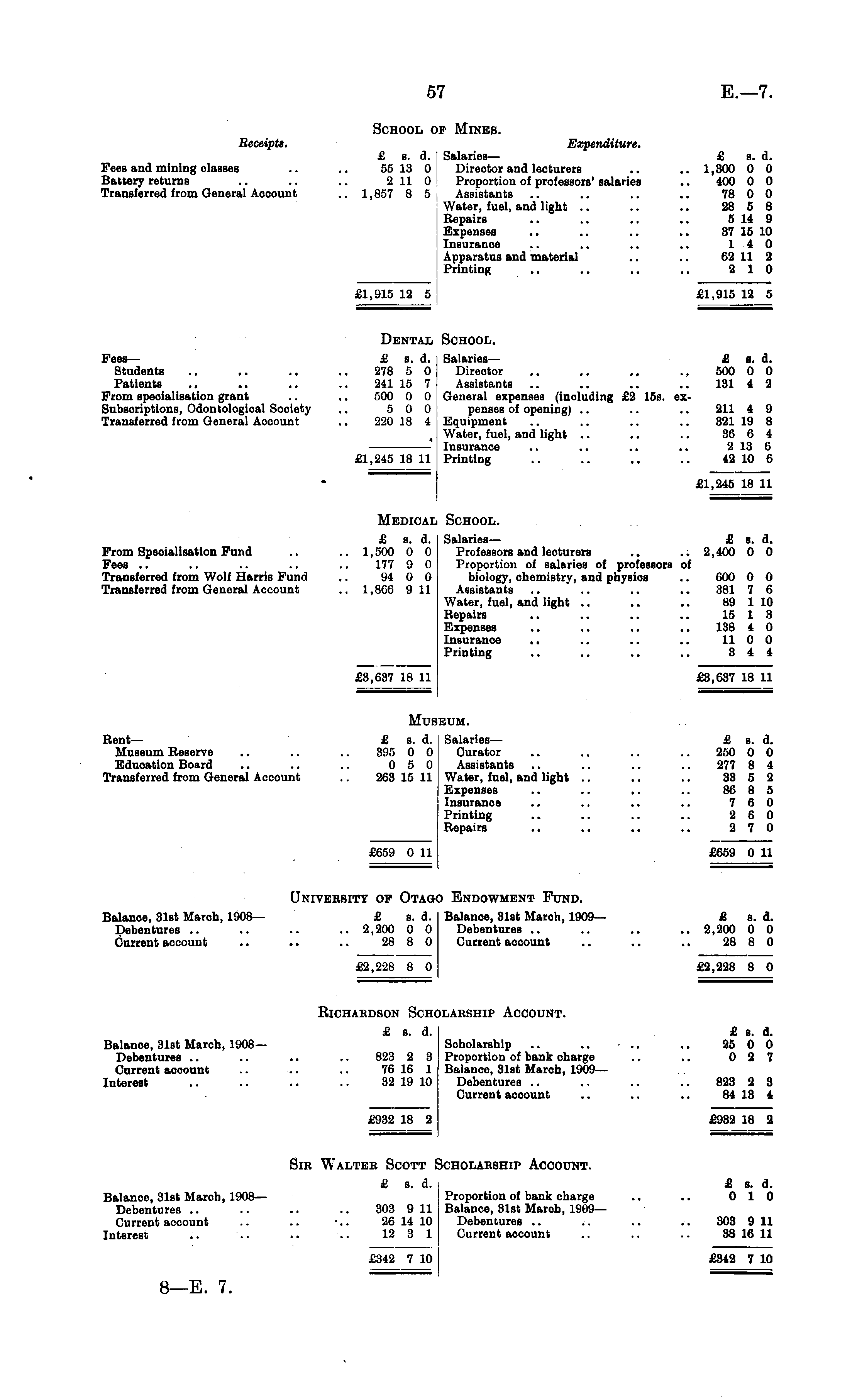 School op Mines. Receipts. Expenditure. £ s. d. Salaries— £ s. d. Fees and mining olasses .. .. 55 13 0 Director and lecturers .. .. 1,300 0 0 Battery returns .. .. .. 2 110 Proportion of professors' salaries .. 400 0 0 Transferred from General Aooount .. 1,857 8 5 Assistants .. .. .. .. 78 0 0 Water, fuel, and light .. .. .. 28 5 8 Repairs .. .. .. .. 5 14 9 Expenses .. .. .. .. 37 15 10 Insurance .. .. .. .. 14 0 Apparatus and material .. .. 62 11 2 Printing .. .. .. .. 2 10 £1,915 12 5 £1,915 12 5 Dental School. Fees — £ s. d. Salaries. £s. d. Students .. .. .. .. 278 5 0 Direotor .. .. .. .. 500 0 0 Patients .. .. .. .. 241 15 7 Assistants .. .. .. .. 131 4 2 From specialisation grant .. .. 500 0 0 General expenses (including £2 15s. exSubscriptions, Odontological Society .. 5 0 0 penses of opening) .. .. .. 211 4 9 Transferred from General Acoount .. 220 18 4 Equipment .. .. .. .. 321 19 8 , Water, fuel, and light .. .. .. 36 6 4 Insurance .. .. .. .. 2 13 6 £1,245 18 11 Printing .. .. .. .. 42 10 6 £1,245 18 11 Medical School. £ s. d. Salaries— £ s. d. From Specialisation Fund .. .. 1,500 0 0 Professors and lecturers .. .. 2,400 0 0 Fees .. .. .. .. .. 177 9 0 ! Proportion of salaries of professors of Transferred from Wolf Harris Fund .. 94 0 0 biology, chemistry, and physios .. 600 0 0 Transferred from General Account .. 1,866 911 Assistants .. .. .. .. 381 7 6 Water, fuel, and light .. .. .. 89 1 10 Repairs .. .. .. .. 15 1 3 Expenses .. .. .. .. 138 4 0 Insurance .. .. .. .. 110 0 Printing .. .. .. .. 3 4 4 £3,637 18 11 £3,637 18 11 Museum. Rent— £ s. d. Salaries— £ s. d. Museum Reserve .. .. .. 395 0 0 Curator .. .. .. .. 250 0 0 Education Board .. .. .. 0 5 0 Assistants .. .. .. .. 277 8 4 Transferred from General Account .. 263 15 11 Water, fuel, and light .. .. .. 33 5 2 Expenses .. .. .. .. 86 8 5 Insurance .. .. .. .. 7 6 0 Printing .. .. .. .. 2 6 0 Repairs .. .. .. .. 2 7 0 £659 0 11 £659 0 11 University op Otago Endowment Fund. Balance, 31st Maroh, 1908— £ s. d. Balance, 31st Maroh, 1909— £ s. a. Debentures .. .. .. .. 2,200 0 0 Debentures .. .. .. .. 2,200 0 0 Current account .. .. .. 28 8 0 Current account .. .. .. 28 8 0 £2,228 8 0 £2,228 8 0 Richardson Scholarship Account. £ s. d. £ s. d. Balance, 31st March, 1908— Scholarship .. .. ■ .. .. 25 0 0 Debentures .. .. .. .. 823 2 3 Proportion of bank charge .. .. 0 2 7 Current account .. .. .. 76 16 1 Balance, 31st March, 1909— Interest .. .. .. .. 32 19 10 Debentures .. .. .. .. 823 2 3 Current acoount .. .. .. 84 13 4 £932 18 2 £932 18 2 Sir Walter Scott Scholarship Account. £ s. d. £ s. d. Balance, 31st March, 1908— Proportion of bank charge .. .. 0 10 Debentures .. .. .. .. 303 9 11 Balance, 31st March, 1909— Current account .. .. •.. 26 14 10 Debentures .. .. .. .. 303 9 11 Interest .. .. .. . • 12 3 1 Current aocount .. .. .. 38 16 11 £342 7 10 £342 7 10 B—E. 7.