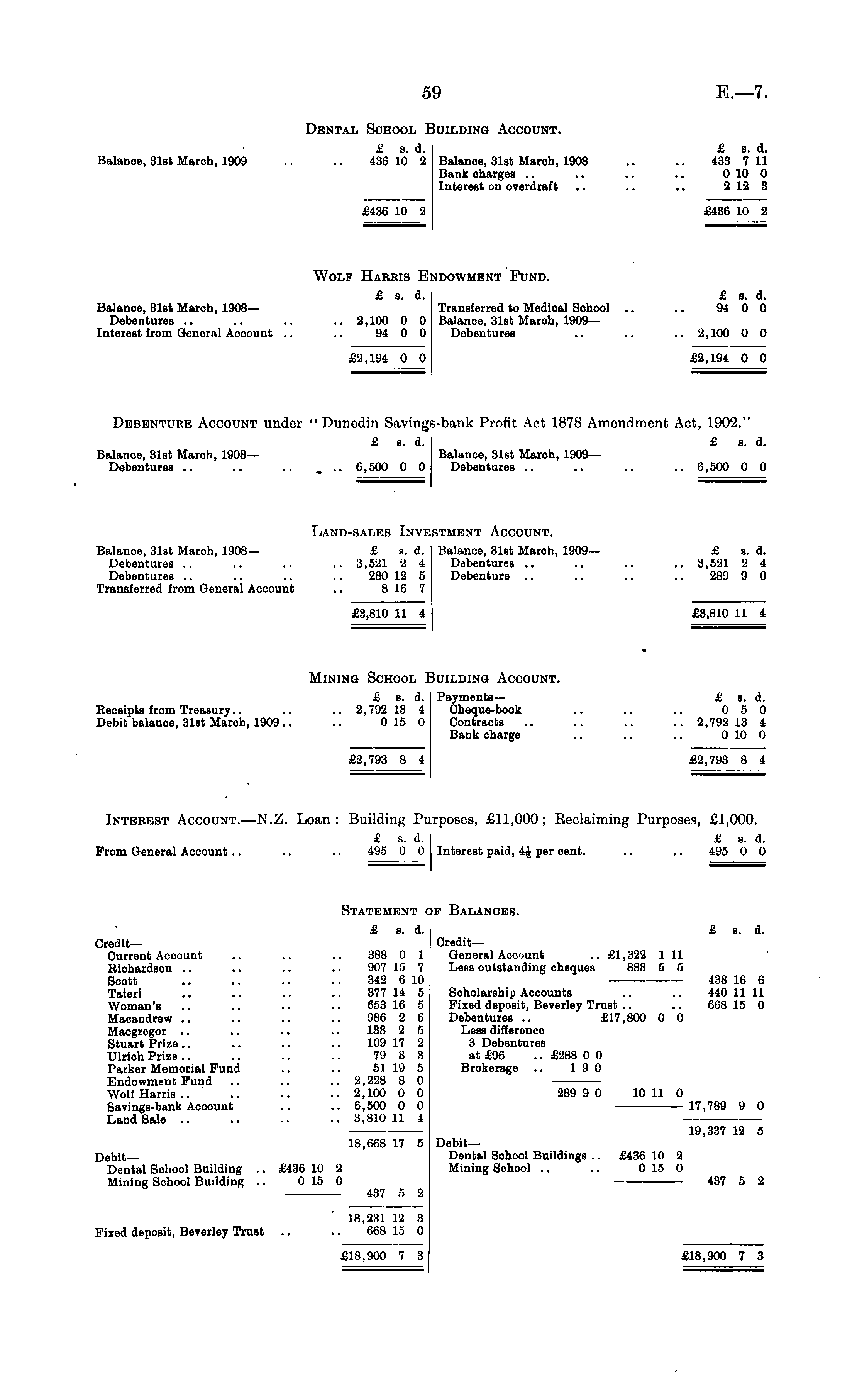 Dental School Building Account. £ s. d. £ s. a. Balance, 31st March, 1909 .. .. 436 10 2 Balance, 31st March, 1908 .. .. 433 7 11 Bank charges .. .. .. .. 0 10 0 i Interest on overdraft .. .. .. 212 3 £436 10 2 £436 10 2 Wolf Harris Endowment Fund. £ s. d. [ £ s. d. Balance, 31st March, 1908— i Transferred to Medical School .. .. 94 0 0 Debentures .. .. .. .. 2,100 0 0 Balance, 31st Maroh, 1909— Interest from General Account .. .. 94 0 0 Debentures .. .. .. 2,100 0 0 £2,194 0 0 £2,194 0 0 Debenture Account under " Dunedin Savings-bank Profit Act 1878 Amendment Act, 1902." £ s. d. £ s. d. Balance, 31st March, 1908— Balance, 31st Maroh, 1909— Debentures .. .. .. ... 6,500 0 0 Debentures .. .. .. .. 6,500 0 0 Land-sales Investment Account. Balance, 31st March, 1908— £ s. d. Balance, 31st Maroh, 1909— £ s. d. Debentures .. .. .. .. 3,521 2 4 Debentures .. .. .. .. 3,521 2 4 Debentures .. .. .. .. 280 12 5 Debenture .. .. .. .. 289 9 0 Transferred from General Account .. 8 16 7 £3,810 11 4 £3,810 11 4 Mining School Building Account. £ s. d. Payments— £ s. d. Receipts from Treasury.. .. .. 2,792 13 4 Cheque-book .. .. .. 0 5 0 Debit balance, 31st March, 1909.. .. 015 0 Contracts .. .. .. .. 2,792 13 4 Bank charge .. .. .. 0 10 0 £2,793 8 4 £2,793 8 4 Interest Account. —N.Z. Loan : Building Purposes, £11,000; Reclaiming Purposes, £1,000. £ s. d. £ s. d. From General Account .. .. .. 495 0 0 Interest paid, 4J per cent. .. .. 495 0 0 Statement op Balances. £ b. d. £ s. d. Credit— CreditCurrent Account .. .. .. 388 0 1 General Acciunt .. £1,322 1 11 Richardson .. .. .. .. 907 15 7 Lees outstanding cheques 883 5 5 Scott .. .. .. .. 342 6 10 ■ 438 16 6 Taieri .. .. .. .. 377 14 5 Scholarship Accounts .. .. 440 11 11 Woman's .. .. .. .. 653 16 5 Fixed deposit, Beverley Trust .. .. 668 15 0 Macandrew .. .. .. .. 986 2 6 Debentures .. £17,800 0 0 Macgregor .. .. ■. .. 133 2 5 Less difference Stuart Prize .. .. .. .. 109 17 2 3 Debentures Ulrich Prize .. .. .. .. 79 3 3 at £96 .. £288 0 0 Parker Memorial Fund .. .. 51 19 5 Brokerage .. 19 0 Endowment Fund .. .. .. 2,228 8 0 ■ Wolf Harris.. .. .. .. 2,100 0 0 289 9 0 10 11 0 Savings-bank Account .. .. 6,500 0 0 17,789 9 0 Land Sale .. .. .. .. 3,810 11 i . 19,337 12 5 18,668 17 5 DebitDebit— Dental School Buildings .. £436 10 2 Dental School Building .. £436 10 2 Mining School .. .. 015 0 Mining School Building .. 0 15 0 437 5 2 437 5 2 18,231 12 3 Fixed depoeit, Beverley Trust .. .. 668 15 0 £18,900 7 3 £18,900 7 3