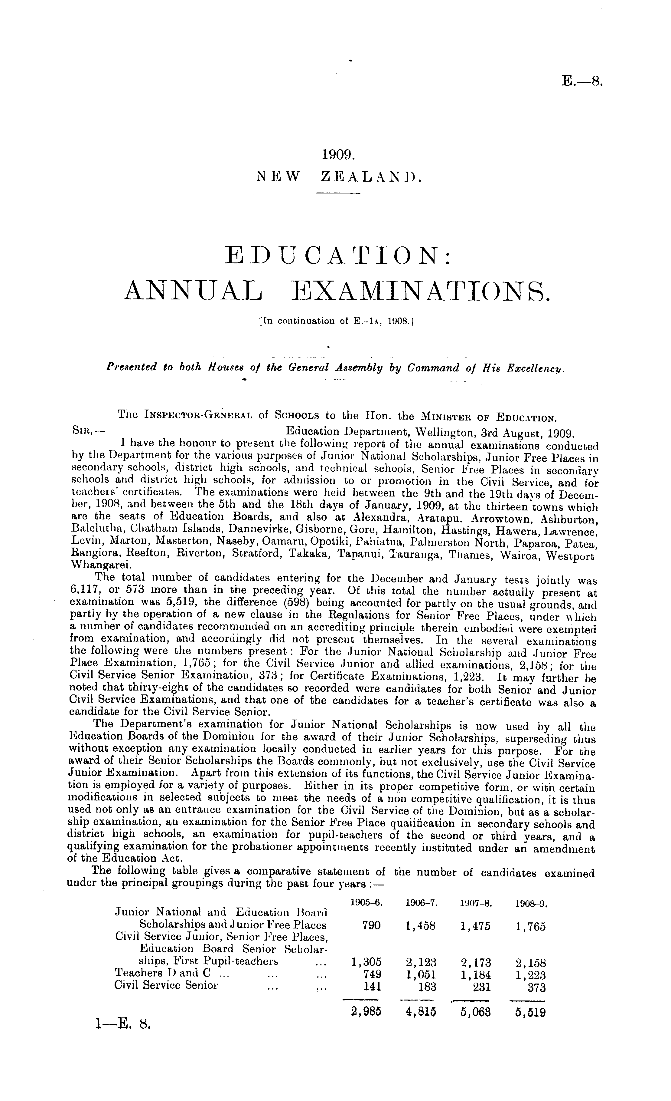 The Inspectok-Genekal of Schools to the Hon. the Minister of Education. ". — Education Department, Wellington, 3rd August, 1909. I have the honour to present the following report of the annual examinations conducted by the Department for the various purposes of Junior National Scholarships, Junior Free Plac. secondary schools, district high schools, and technical schools, Senior Free Places in secondary schools and district high schools, for admission to or promotion in the Civil Service, and for teachers' certificates. The examinations were held between the 9th and the 19th days of December, 1908, and between the sth and the 18th days of January, 1909, at the thirteen'towns which are the seats of Education Boards, and also at Alexandra, Aratapu, Arrowtown, Ashburton, Balclutha, Chatham Islands, Dannevirke, Gisborne, Gore, Hamilton, Hastings, Hawer'a, Lawrence.' Levin, Marton, Masterton, Naseby, Oamaru, Opotiki, Pahiatua, Palmerston North, Paparoa, Patea| Kangiora, Beefton, Eivertou, Stratford, Takaka, Tapanui, Tauranga, Thames, Wairoa, Westport' Whangarei. The total number of candidates entering for the December and January tests jointly was 6,117, or 573 more than in the preceding year. Of this total the number actually present at examination was 5,519, the difference (598) being accounted for partly on the usual grounds, and partly by the operation of a new clause in the Begulations for Senior Free Places, under which a number of candidates recommended on an accrediting principle therein embodied were exempted from examination, and accordingly did not present themselves. In the several examinations the following were the numbers present: For the Junior National Scholarship and Junior Free Place Examination, 1,765; for the Civil Service Junior and allied examinations, 2,158; for the Civil Service Senior Examination, 373; for Certificate Examinations, 1,223. It may further be noted that thirty-eight of the candidates so recorded were candidates for both Senior and Junior Civil Service Examinations, and that one of the candidates for a teacher's certificate was also a candidate for the Civil Service Senior. The Department's examination for Junior National Scholarships is now used by all the Education Boards of the Dominion for the award of their Junior Scholarships, superseding thus without exception any examination locally conducted in earlier years for this purpose. For the award of their Senior Scholarships the Boards commonly, but not exclusively, use the Civil Service Junior Examination. Apart from this extension of its functions, the Civil Service Junior Examination is employed for a variety of purposes. Either in its proper competitive form, or with certain modifications in selected subjects to meet the needs of a non competitive qualification, it is thus used not only as an entrance examination for the Civil Service of the Dominion, but as a scholarship examination, an examination for the Senior Free Place qualification in secondary schools and district high schools, an examination for pupil-teachers of the second or third years, and a qualifying examination for the probationer appointments recently instituted under an amendment of the Education Act. The following table gives a comparative statement of the number of candidates examined under the principal groupings during the past four years :— 1905-6. 1906-7. 1907-8. 1908-9. Junior National and Education Board Scholarships and Junior Free Places 790 1,458 1,475 1,765 Civil Service Junior, Senior Free Places, Education Board Senior Scholarships, First Pupil-teachers ... 1,305 2,123 2,173 2,158 Teachers D and C ... ... ... 749 1,051 1,184 1,223 Civil Service Senior ... ... 141 JB3 231 373 2,985 4,815 5,063 5,519