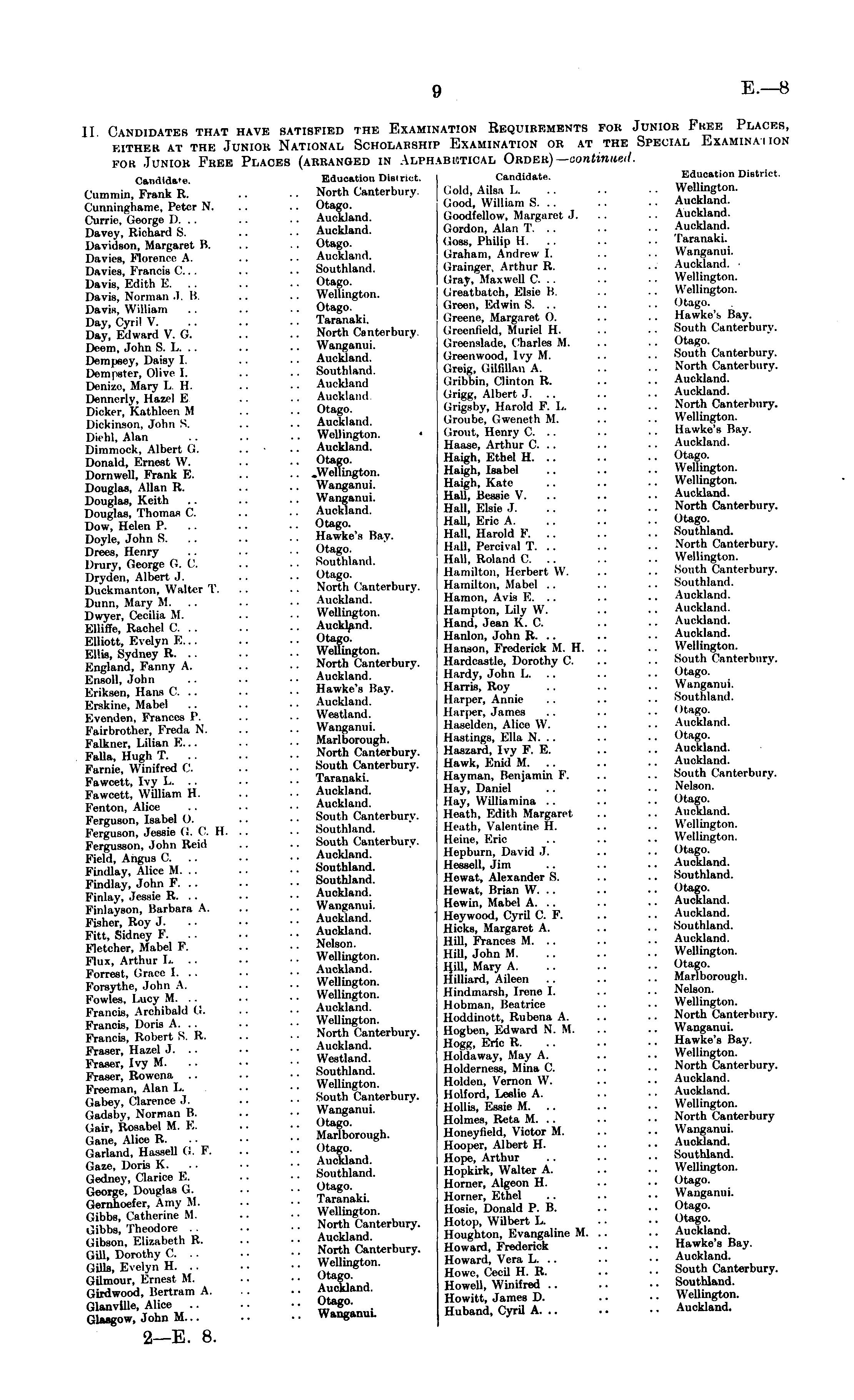 Canrtida'e. Education District. Cummin, Frank R. .. .. North Canterbury. Cunninghame, Peter N. .. .. Otago. Curie, George I). .. .. .. Auckland. Davey, Richard S. .. .. Auckland. Davidson, Margaret B. .. .. Otago. DavicH. Florence A. .. . ■ Auckland. Davies, Francis C... .. .. Southland. Davis, Edith K. . . .. . • Otago. Davis, Norman .1. 15. .. .. Wellington. Davis, William .. .. .. Otago. Day, Cyril V. . . .. .. Taranaki. Day, Ed ward V. G. .. .. North Canterbury. Deem, John S. L. .. .. .. Wanganui. Deinpsey, Daisy I. .. .. Auckland. Dempster, Olive 1. .. .. Southland. Deniie, Mary L. H. .. ■• Auckland Dennerly, Hazel E .. .. Auckland Dicker, Kathleen M .. • • Otago. Dickinson, John S. .. .. Auckland. lliehl. Alan .. .. •• Wellington. Dimmock, Albert (i. .. ■ .. Auckland. Donald, Ernest \\. .. • • Otago. Dornwell, Frank E. .. .. .Wellington. Douglas, Allan R. .. - - Wanganui. Douglas, Keith .. .. .. Wanganui. Douglas, Thomas C. .. . • Auckland. Dow, Helen P. .. • • Otago. Doyle, John S. .. .. .. Hawke's Bay. Drees, Henry .. .. • • Otago. Drury, George (i. ('. .. .. Southland. Dryden, Albert J. .. •• Otago. Duckmanton, Walter T. .. •• North Canterbury. Dunn, Mary .M. .. •• •• Auckland. Dwyer, Cecilia M. .. •• Wellington. Elliffe, Rachel C. .. .. •• Auckland. Elliott, Evelyn E Otago. Ellis, Sydney R. .. .. ■ • Wellington. England, Fanny A. .. •• North Canterbury. Ensoll, John .. .. • • Auckland. Eriksen, Hans C Hawke's Hay. Erekine, Mabel Auckland. Evenden, Frances 1 , . .. .- Westland. Fairbrother, Freda X. .. .. Wanganui. Falkner, Lilian E... .. • • Marlborough. Falla, Hugh T North Canterbury. Farnie, Winifred C. • • ■ • South Canterbury. Fawcett, Ivy L Taranaki. Fawcett, William H. .. •• Auckland. Penton, Alice Auckland. Ferguson, Isabel <). .. ■• Sooth Canterbury. Ferguson. Jessie G. C. H. .. ■■ Southland. Fergusson, John Reid .. .. South Canterbury. Field, Angus C Auckland Findlay, Alice M. .. • • • • Southland. Findlay, John F. .. .. • ■ Southland. Finlay, Jessie R Auckland. Finlayson, Harbara A Wanganui. Fisher, Roy J Auckland. Fitt, Sidney F Auckland. Fletcher, Mabel P. .. • ■ JJelson. Flux, Arthur I Wei mgton. Forrest, Grace I Auckland. Forsythe, John A. .. •■ WeMngton. Kowles, Lucy M Wei ington. Francis, Archibald G ;*!"*'• Francis, Doris A V J ellm^ on ; , Branch, Robert 8. R North Canterbury. Eraser, Hazel J Auck and - Fraser, Ivy M Westland Fraser, Rowona la ' ld - Freeman, Alan L. .. •• Wellington. Gabey, Clarence J. .. ■• South Canterbury. Ga.lsbv, Norman I? Wanganui. Gair, Rosabel M. E OtagO. Gane, Alice R Marlborough. Garland, Hassell G. F Otago. Gaze, Doris X \ Gedney, Clarice E. .. • • Southland. George, Douglas (i. .. •• Otago Gernhoefer, Ann \1 Taranaki. Gibbs, Catherine M Wellington. Gibbs! Theodore .. .. •• North Canterbury. Gibtfro, Elizabeth R Auckland (Jill, Dorothy C North Canterbury. (Jills, Kvelvn 11 Wellington. Gilmour, Ernest M Otago. Girdwood, Bertram A Auckland. Glanville, Alice Otago. Glasgow, John M Wanganui.