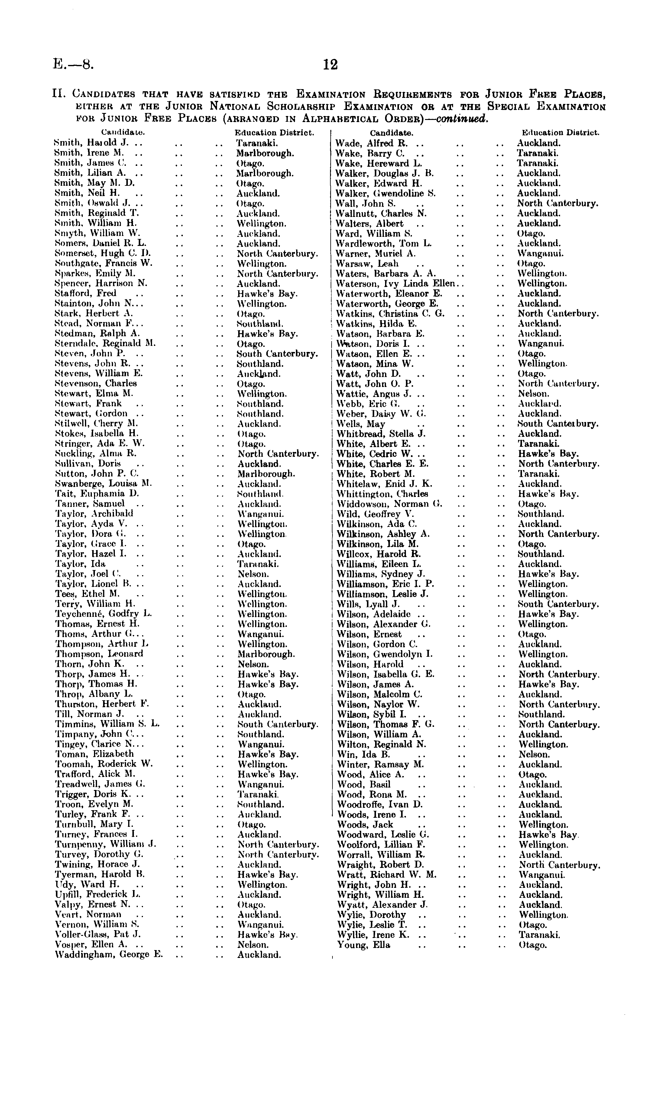 Candidate. Education District. Wade. Alfred R. .. .. .. Auckland. Wake. Barry C. -. .. •• Taranaki. Wake. Hcreward L. .. .. Taranaki. Walker. Douglas J. H. .. .. Auckland. Walker. Edward EL .. .. Auckland. Walker. (Gwendoline S. .. .. Auckland. Wall, John 8. .. .. .. North Canterbury. Wallnutt. Cluirle- V .. .. Auckland. Walters. Albert .. .. .. Auckland. Ward, William S. .. .. Otago. Wardleworth, Tom I. .. .. Auckland. Warner. Muriel A. .. .. Wanganui Warsaw. Leah .. .. .. Ola<ni. Waters, Barbara A. A. .. .. Wellington. Watcrson. Ivy Linda Ellen. . .. Wellington. Watcrworth. Eleanor E. .. .. Auckland. Watei worth, (Jeorge E. .. .. Auckland. W.itkins. Christina C. G. .. North Canterbury. Watkins, Hilda E. .. .. Auckland. Watson. Barbara E. .. .. Auckland. Wiitson. Doris 1. .. .. .. Wanganui. Watson. Ellen E. .. .. .. Otago. Watson. Mina W. .. .. Wellington Watt, John 1). . . .. . . Otago. Watt, John O. P. .. .. North Canterbury. Wat tie. Angus J. .. .. .. Nelson. Webb, Erie 0. .. .. .. Auckland. Wilier. Daisy W. <■. .. .. Auckland. wells. May ■• .. •• South Canterbury. Whit bread. Stella .). .. .. Auckland. White, Albert E. .. .. .. Taranaki White. Ccdric W. .. .. .. llawkc's Hay. White, Charles E. E. .. .. North Canterbury. White. Robert .\l. .. .. Taranaki Whitelaw, Enid J. K. .. .. Auckland. Whittington, Charles .. .. Hawke's Hay. Widdowaon, Norman G. .. .. 01 Wild. Geoffrey V. .. .. Southland. Wilkinson. Ada C. .. .. Auckland. Wilkinson. Ashley A. .. .. North Canterbury. Wilkinson. Lila Si. . . . . Otago. WilleoN. Harold R. .. .. Southland. Williams. Eileen L. .. .. Auckland. Williams. Sydney .1. .. .. Hawke's Hay. Williamson. Erio 1. I. .. .. Wellington. Williamson. Leslie .1. .. .. Wellington. Wills. Lvall .1. .. .. .. South Canterbury. Wilson. Adelaide .. .. .. Hawke's Hay. Wilson. Alexander G. .. .. Wellington. Wilson. Ernest •. .- •■ Otago. Wilson. Gordon C. .. .. Auckland. Wilson, Gwendolyn I. .. .. Wellington. Wilson. Harold .. .. .. Auckland. Wilson, Isabella <!. K. .. .. North Canterbury. ■ Wilson, .lames A. .. .. Hawke's Bay. Wilson, Malcolm ('. .. .. Auckland. Wilson, Niiylor W. .. •■ North Canterbury. Wilson, Sybil 1. . . .. .. Southland. Wilson. Thomas K. ('•. .. .. North Canterbury. Wilson. William A. .. .. Auckland. Wilton, Reginald \ .. .. Wellington. Win, Ida B. . . .. . • Nelson. Winter, Ramsay M. .. .. Auckland. Wood. Alice A. .. .. OtagO. Wood, Basil .. ... .. Auckland. Wood, Rons M. .. .. .. Auckland. Woodroffe, Ivan D. .. .. Auckland. Woods. Irene I. .. .. Auckland. Woods, .lack .. .. .. Wellington. Woodward. Leslie ••. .. .. Hawke's Bay Woolford. Lillian F. .. .. Wellington. Worrall. William R. .. .. Auckland. Wraight, Robert l>. .. .. North Canterbury W ratt, Richard W. '. VI. .. .. Wanganui. Wright, John H. .. .. .. Auckland. Wright, William 11. .. .. Auckland. Wyatt. Alexander .I. .. .. Auckland. W'vlie, Dorothy .. ■■ .. Wellington. Wylie, Leslie T. .. .. . . Otego. W'vllic. Irene K. .. .. .. Taranaki Young, Ella .. .. . Otago.