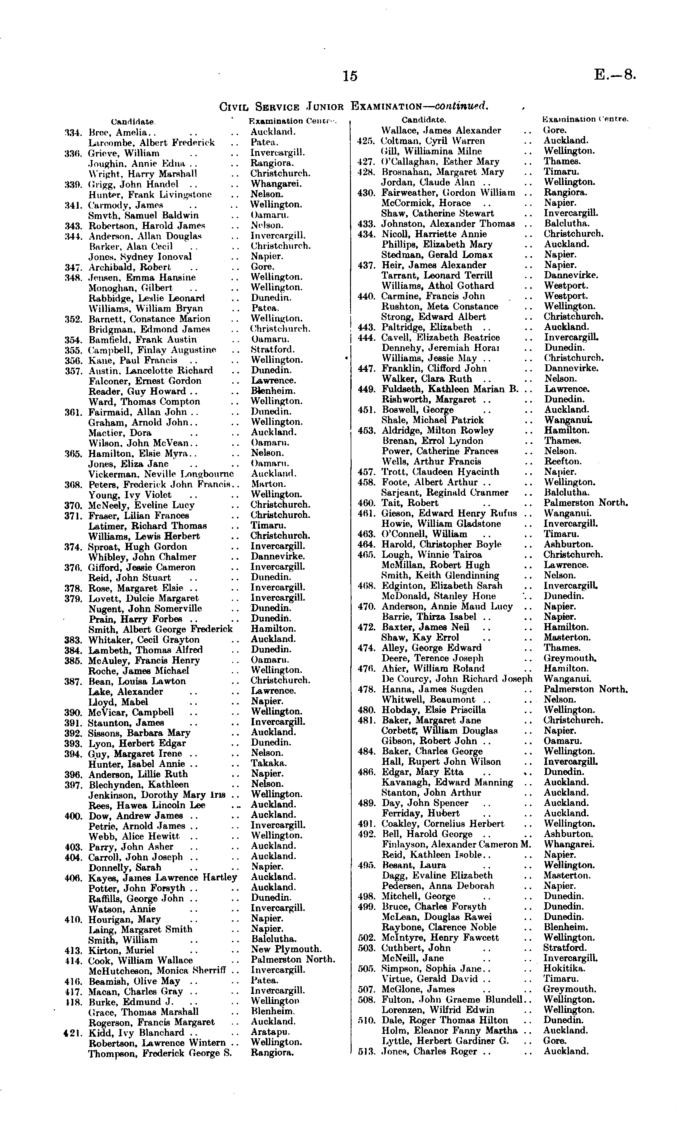 Candidate. Examination Oeunv. 'i:! 4. Bree, Amelia. . .. .. AiuUluikl. Laroombe, Albert Frederick .. Patei 336. Grieve, William .. .. [nveroargill. Joughin, Annie Edna .. .. Rangiora. Wright, Barry Marshall .. Chrietohnrch. 389. Grigg, John Handel .. .. VVhangarei. Hunter, Frank Livingstone .. Nelson. 341. Carmody, James .. .. Wellington. Smyth, Samuel Baldwin .. Oamaru. 343. Robertson, Harold James .. Nelson. 344. Anderson, Allan Douglas .. [nveroargill. Barker, Alan Cecil .. .. Chrutohuroh, Join's. Sydney lonoval .. Napier. 347. Archibald, Robert .. .. Gore. 348. Jensen, Emma Hansine .. Wellington. Monoghan, Gilbert .. .. Wellington. Rabbidge, Leslie Leonard .. Dnnedin. Williams. William Bryan .. Patea. :!fi2. Barnett, Oonetanoe Marion .. Wellington. Bridgman, Edmond James .. Chrietonnroh. :i.")4. Bamfield, Frank Austin .. Oaraaru. BBS. Campbell, Finlay Augustine .. Stratford. :t.">ti. Kane, Paul Francis .. .. Wellington. :!.->7. Austin. Lanoelotte Richard .. Dunedin. Kill oner. Ernest Gordon .. Lawmnoe. Reader, Guy Howard .. .. Blenheim. Ward, Thomas Compton .. Wellington. 36L Fairinaiil. Allan John .. .. Dunedin. Graham, Arnold John. . .. Wellington. Mactici. Dora .. .. Auckland. Wilson, John MeVean.. .. Oamaru. 365. Hamilton, Klsic M .. Nelson. Jones. Eliza Jane .. .. Oamaru. Vickcnnan. Neville Longboumc Auckland. :{<>s. I'ctcrs. Frederick John Francis.. Marion. Young, Ivy Violet .. .. Wellington. 170. MeNeely, Eveline Lnoy .. Christchurch. 371. Friiser, Lilian Frances .. (In istchinch. Latimer, Richard Thomas .. Timaru. Williams, Lewis Herbert .. Christchurch. 374. Sproat, Hugh Gordon .. Invercargill. Whibley, John Chalmer .. Danne\ hke. :i7li. Gilford, Jessie Cameron .. Invercargill. Reid, John Stuart .. .. Dunedin. 378. Rose, Margaret Elsie .. .. [nveroargill. l(7!t. I>ovett, Dulcie Margaret . . [nveroargill. Nugent. John Somcrvillc .. Dunedin. Pram, Harry Forbes .. .. Dunedin. Smith, Albert George Fre<leriek Hamilton. 38.T Wliitaker, Cecil Grayton . . Auckland. 384. Lambeth, Thomas Alfred .. Dunedin. 385. McAuley, Francis Henry .. Oamaru. Roche, James .Michael .. Wellington. 387. Bean, Louisa Lawton .. Christchureh. Lake, Alexander .. .. Lawrence. Lloyd, Mabel .. .. Napier. :i!)0. McVicar, Campbell .. .. Wellington. 301. Staunton, James .. .. Invercargill. 392. Sissons, Barbara Mary .. Auckland. 803. Lyon, Herbert Edgar .. Dunedin. 3!14. (i'uy, Margaret Irene .. .. Nelson. Hunter, Isabel Annie .. .. Takakn. 306. Anderson, Lillie Ruth .. Napier. 3!17. Blechynden, Kathleen . . Nelson. Jenkinson, Dorothy Mary Iris .. Wellington. Kecs, Hawea Lincoln l-ee .. Auckland. 400. Dow, Andrew James .. .. Auckland. I'etrie. Arnold James .. .. Invercargill. Wcl>li, Alice Hewitt .. .. Wellington. 403. Parry, John Asher .. . . Auckland. 404. Carroll, John Joseph .. .. Auckland. Donnelly, Sarah . . . . Napier. 406. Kayes, James I>awrenee Hartley Auckland. Potter, John Forsyth .. .. Auckland. Raffills, George John .. .. Dunedin. Watson. Annie .. .. Inverciiruill. 410. Hourigan, Mary .. .. Napier. l<aing. Margaret Smith .. Napier. Smith, William .. .. Bnlclutha. 413. Kirton, Muriel .. .. New Plymouth. 414. Cook, William Wallace .. Palmerston North. McHutcheson. Monica Slienill .. [nveroargill. 416. Beamish, Olive May . . . . Patea. H7. Macau, Charles Cray .. .. Invercargill. lls. Burke, Edmund J. .. ■• Wellington Crace. Thomas Marshall .. Blenheim Bogenoa, Franoh Margaret .. Auckland. 421. Kidd, Ivy Blanchard .. .. Aratapu. Robertson, Lavrenoe Winters .. Wellington. Thompson, Frederick George S. Rangiora.