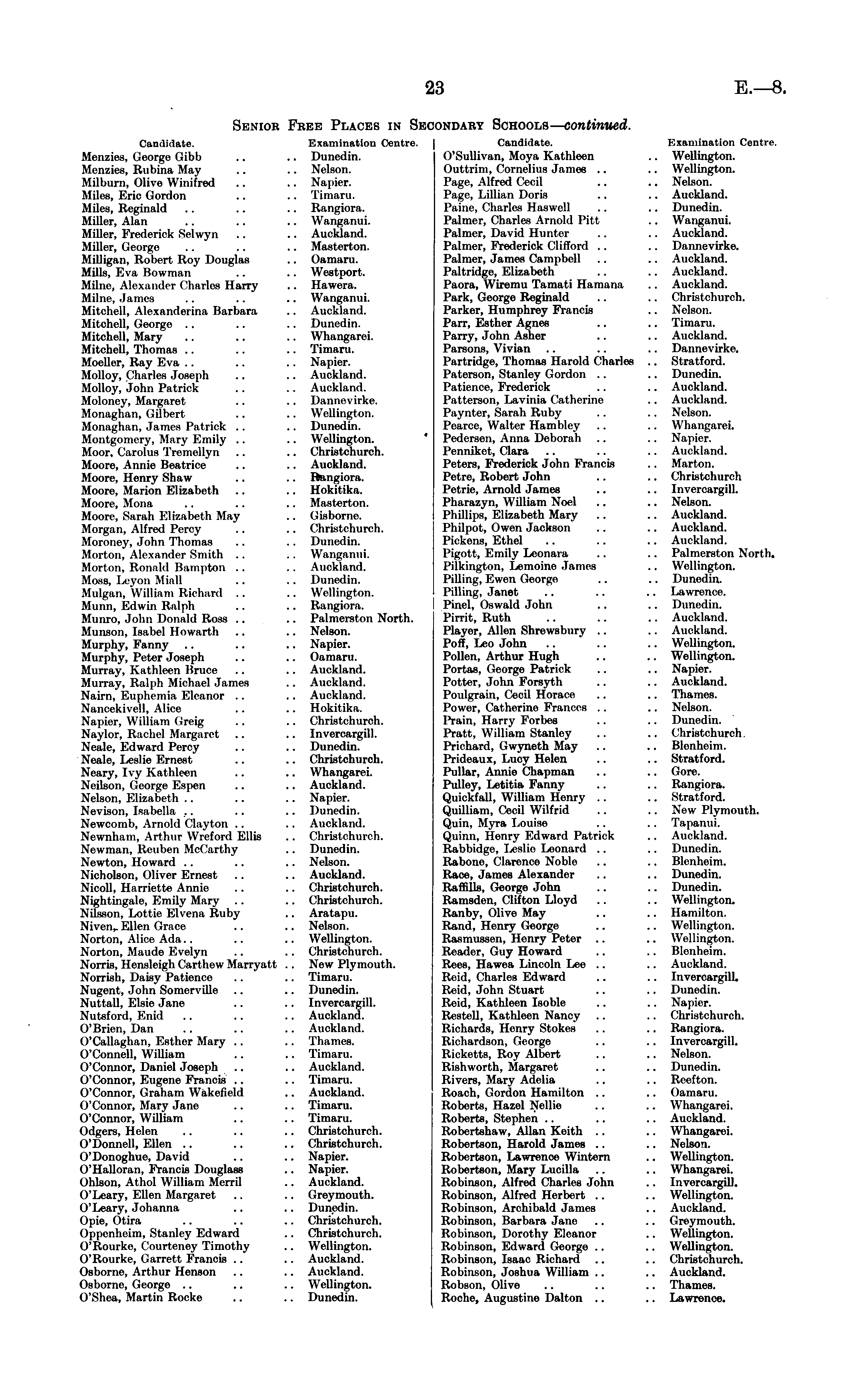 Candidate. Examination Centre. Menzies, George Gibb .. .. Dunedin. Menzies, Rubina May .. .. Nelson. Milburn, Olive Winifred .. .. Napier. Miles, Erie Gordon .. .. Timaru. Miles, Reginald .. .. .. Rangiora. Miller, Alan .. .. .. Wanganui. Miller, Frederick Selwyn .. .. Auckland. Miller, George .. .. .. Masterton. Milligan. Robert Roy Douglas .. Oamaru. .Mills, Eva Bowman .. .. Westport. Milne, Alexander Charles Harry .. Hawera. Milne, Janus .. .. .. Wanganui. Mitchell, Alexandeiina Barbara .. Auckland. Mitchell, George .. .. .. Dunedin. Mitchell, Mary .. .. .. Whangarei. Mitchell, Thomas .. .. .. Timaru. Moeller, Ray Eva .. .. .. Napier. Molloy, Charles Joseph .. .. Auckland. Molloy, John Patrick .. .. Auckland. Moloney, Margaret .. .. Dannevirke. Monaghan, Gilbert .. .. Wellington. Monaghan, James Patrick .. .. Dunedin. Montgomery, Mary Emily .. .. Wellington. Moor, Carolus Tremellyn .. .. Christchurch. Moore, Annie Beatrice .. .. Auckland. Moore, Henry Shaw .. .. Rangiora. Moore, Marion Elizabeth .. .. Hokltika. Moore, Mona .. .. .. Masterton. Moore, Sarah Elizabeth May .. Gisborne. Morgan, Alfred I'ckv .. .. Christchurch. Moroney, John Thomas .. .. Dunedin. Morton, Alexander Smith .. .. Wanganui. Morton, Ronald Hampton .. .. Auckland. Moss, Leyon Miall .. .. Dunedin. Mulgan, William Richard .. .. Wellington. Munn, Edwin Ralph .. .. Rangiora. Munro, John Donald Rose .. .. Palmerston North. Munson, Isabel Howarth .. .. Nelson. Murphy, Fanny .. .. .. Napier. Murphy, Peter Joseph .. .. Oamaru. Murray, Kathleen Bruce .. .. Auckland. Murray, Ralph Michael James .. Auckland. Nairn, Euphemia Eleanor .. .. Auckland. Nancekivell, Alice .. .. Hokitika. Napier, William (ireig .. .. Christchurch. Naylor, Rachel Margaret .. .. Invercargill. Neale, Edward Percy .. .. Dunedin. Neale, Leslie Ernest .. .. Christchurch. Neary, Ivy Kathleen .. .. Whangarei. Neilson, George Espen .. .. Auckland. Nelson, Elizabeth .. .. .. Napier. Nevison, Isabella .. .. .. Punedin. Newcomb, Arnold Clayton .. .. Auckland. Newnham, Arthur Wreford Ellis .. Christchiucli. Newman, Reuben McCarthy .. Dunedin. Newton, Howard .. .. .. Nelson. Nicholson, Oliver Ernest .. .. Auckland. Nicoll, Harriett* Annie .. .. Christchurch. Nightingale, Emily Mary .. .. Christchurch. Nilsson, Lottie Elvena Ruby .. Aratapu. Niven,. Ellen Grace .. .. Nelson. Norton, Alice Ada.. .. .. Wellington. Norton, Maude Evelyn .. .. Christchurch. Norris, Hensleigh Carthew Marryatt .. New Plymouth. Norrish, Daisy Patience .. .. Timaru. Nugent, John Somerville .. .. Dunedin. Nuttall, Elsie Jane .. .. Invercargill. Nutsford, Enid .. .. .. Auckland. O'Brien, Dan .. .. .. Auckland. O'Callaghan, Esther Mary .. .. Thames. O'Connell, William .. .. Timaru. O'Connor, Daniel Joseph .. .. Auckland. O'Connor, Eugene Francis .. .. Timaru. O'Connor, Graham Wakefield .. Auckland. O'Connor, Mary Jane .. .. Timaru. O'Connor, William .. .. Timaru. Odgers, Helen .. .. .. Christchurch. O'Donnell, Ellen .. .. .. Christchurch. O'Donoghue, David .. .. Napier. O'Halloran, Francis Douglass .. Napier. Ohlson, Athol William Merril .. Auckland. O'Leary, Ellen Margaret .. .. Greymouth. O'Leary, Johanna .. .. Dunedin. Opie, Otira .. .. .. Christchurch. Oppenheim, Stanley Edward .. Christchurch. O'Rourke, Courteney Timothy .. Wellington. O'Rourke, Garrett Francis .. .. Auckland. Osborne, Arthur Henson .. .. Auckland. Osborne, George .. .. .. Wellington. O'Shea, Martin Rocke .. .. Dunedin.