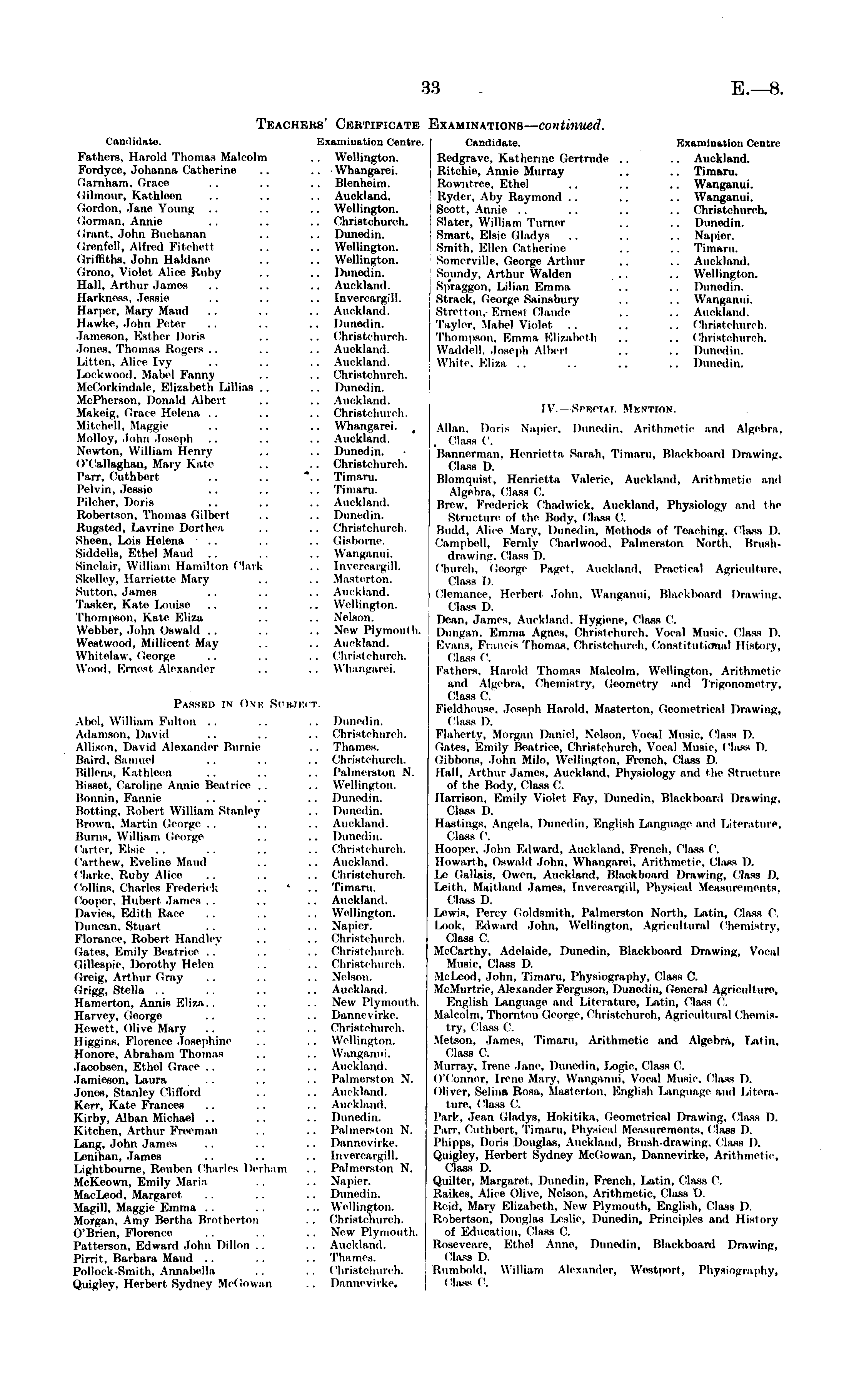 . I Candidate. Examination Centre Redgrave. Katlierine Gertrude .. .. Auckland. Ritchie, Annie Murray .. .. Timaru. Rowntree. Ethel .. .. .. Wanganui. Ryder, Ahy Raymond .. .. .. Wanganui. Scot I. Annie .. .. .. .. Christ chinch. Slater, William Turner .. .. Dunedin. Smart, Elsie Gladys .. .. .. Napier. Smith. Ellen Catherine .. .. Timaru. Somerville, George Arthur .. .. Auckland. Soundy, Arthur Walden ... .. Wellington, Spraggon, Lilian Emma .. .. Dunedin. Strack. Qeorge Sainabury .. .. Wanganui. Streitiin.. Ernest Claude .. .. Auckland. ; Tayler. Mabel Violet .. .. .. Christchuroh. Thompson, Emma Elizabeth .. .. Chriatohurch. Waddell, Joseph Albert .. .. Dunedin. White, Eliza .. .. .. .. Dnnedin. IV.- SiKiTAt. Mention. I Allan. Doris Napier. Dunedin. Arithmetic and Algebra, ('lass ('. Bannerman, Henrietta Sarah. Timaru, Blackboard Drawing. Class 1). BlomquUt, Henrietta Valeric, Auckland. Arithmetic and Algebra, < 'hiss C. Brew. Frederick Chadwiok, Auckland, Physiology and the St I net lire of the Body, Class ('. Budd, Alice Mary, Dunedin, Ifethodt of Teaching. Class 1). Campbell, Fernly Charlwood, Palmerston North. Brushdrawing, Class D. Church. George Paget, Auckland, Practical Agriculture, Class I). Clemanoe, Herbert John. Wanganui. Blackboard Drawing, (lass 11. Dean, James, Auckland. Hygiene, Class C. Dungan, Emms Agues. Christ church. Vocal Music class D. Evans. Francis Thomas, Chrietchurch, Constitutional History, Clae C. Fathers. Harold Thomas Malcolm. Wellington, Arithmetic and Algebra, Chemistry, Geometry and Trigonometry, C'ass C. Eieldhoiisc. Joseph Harold, Masterton, Geometrical Drawing, Class D. Flaherty, Morgan Daniel, Nelson. Vocal Music, class D. Gates, Emily Beatrice. Chrietchurch, Vocal Music. Class I). Gibbons, John Milo, Wellington, French, class i>. Hall. Arthur James, Auckland. Physiology and the Structure of the Body. Class C. Harrison, Emily Violet Fay. Dunedin, Blackboard Drawing, Class l>. Hastings, Angela, Dunedin. English Language and Literature. Class C. Hoo|)cr, John Edward. Auckland. French, (lass C. Howarth, Oswald John, Whangarei, Arithmetic, class I). Le Callais. Owen, Auckland. Blackboard Drawing, class I). Leith. Maitland James. Inveroargill, Physical Measurements. Class I). Lewis. Percy Goldsmith, Palmerston North, Latin, Class C. Look. Edward John, Wellington. Agricultural chemistry. Class ('. McCarthy, Adelaide, Dunedin, Blackboard Drawing, Vocal Music. Class D. MoLeod, John, Timaru, Physiography, Class C. McMurtiie. Alexander Ferguson, Dunedin,General Agriculture, English Language and Literature, Latin, Class C. Malcolm, Thornton Qeorge, Christchuroh, Agricultural Chemistry, Class C. Meteon, James, Timaru, Arithmetic and Algebra, Tallin, Class C. Murray, Irene Jane. Dunedin, Logic, Class C. O'Connor, Irene Mary. Wanganui, Vocal Music. Class D. Oliver. Selina Rosa. Masterton, English Language and Literat lire. < 'lass ('. Park, .lean (lladys. llokitika. Geometrical Drawing, class D. Parr, Cuthbert, Timaru, Physical Measurements, daiss I). Phipps. Doris Douglas. Auckland. Brush-drawing, Class I). Quigley. Herbert Sydney McGowan, Dannevirke, Arithmetic, (lass I). Quilter, Margaret, Dunedin. French. Latin. Class ('. Raikes, Alice Olive. Nelson. Arithmetic-. Class l>. Reid. Mary Elizabeth, New Plymouth, English. Class D. Robertson. Douglas Leslie, Dunedin, Principles and History of Education. Class C. Roseveare, Ethel Anne, Dunedin, Blackboard Drawing, CUas D. Rnmbokl, William Alexander, West|«)rt, Physiography, Class C.