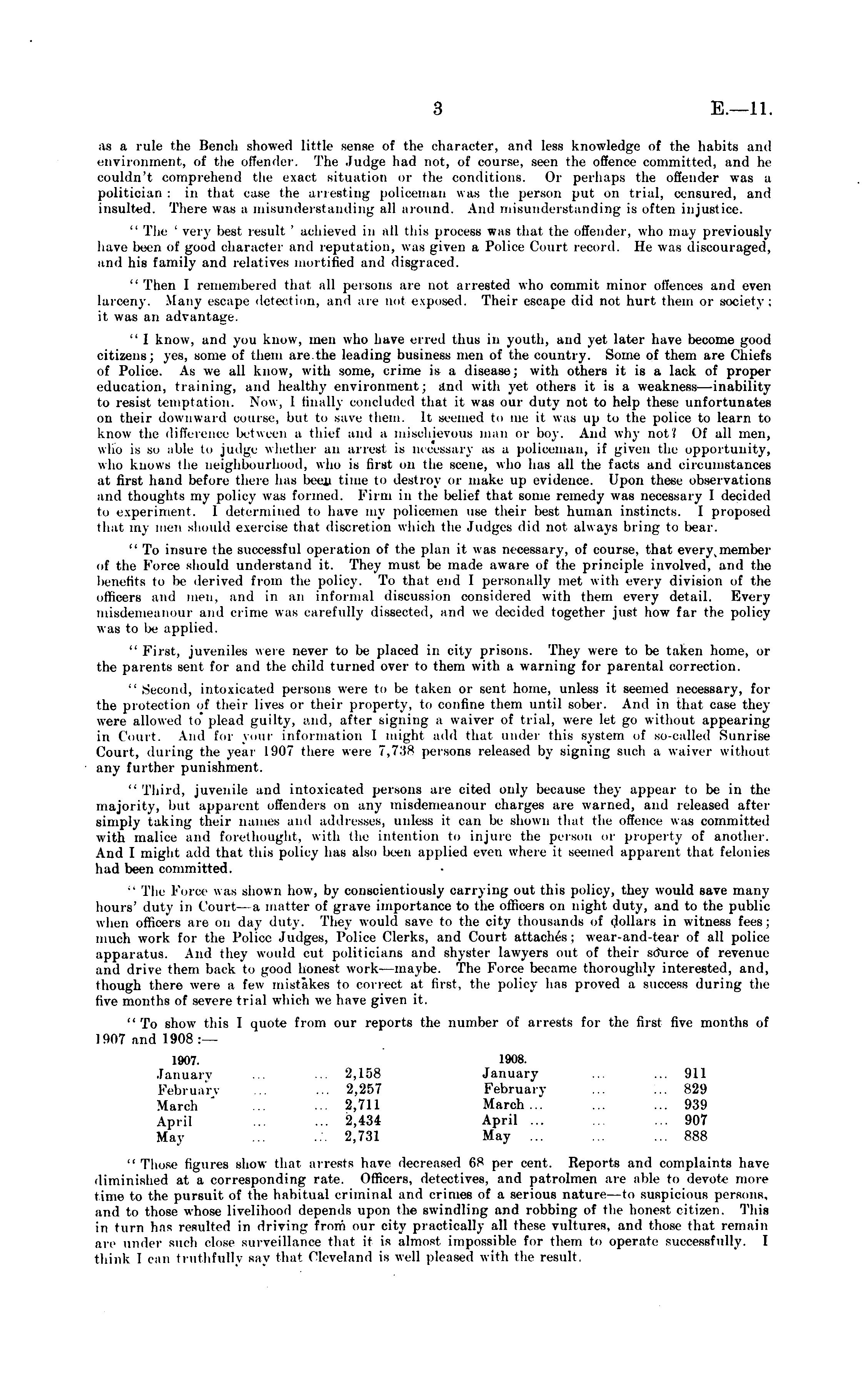 em a rule the Bench showed little souse of the character, and less knowledge of the habits ami environment, of the offender. The Judge had net, of course, seen the offenoe committed, and lie couldn't comprehend the exaci situation or the conditions. Or perhaps the offender was a politician: in thai oaae the arresting policeman was the person pul on trial, oensured, ami insulted. There was a misunderstanding all around. And misunderstanding is often injustice. " The ' very best result ' achieved in all this process was that the offender, who nia\ pivviouslv have been of good character and reputation, was given a Police Court reoord. He was discouraged, and his family and relatives mortified and disgraced. "Then I remembered that all persons are not arrested who oommil minor offences and even larceny. Many escape detection, and are not exposed. Their escape did not hurt them or society ; it was an advantage. "I know, and you know, men who have erred thus in youth, and yet later have become good citizens; yes, some of them are the leading business men of the country. Some of them are Chiefs of Police. As we all know, with some, crime is a disease; with others it is a lack of proper education, training, and healthy environment: Mud with yet others it is a weakness—inability to resist temptation. Now, 1 finally concluded that it was our duty not to help these unfortunates on their downward course, but to save them. It seemed to me it was up to the police to learn to know the difference between a thief and a mischievous man or boy. And why not? Of all men, who is so able to judge whether an arrest is necessary as a policeman, if given the opportunity, who knows the neighbourhood, who is lirst on the scene, who has all the facts and circumstances at first hand before there has beeii time to destroy or make up evidence. Upon these observations and thoughts my policy was formed. Firm in the belief that some remedy was necessary I decided to experiment. 1 determined to have my policemen use their best human instincts. I proposed that my men should exercise that discretion which the Judges did not always bring to bear, " To insure the successful operation of the plan it was necessary, of course, that of the Foroe should understand it. They must be made aware of the principle involved, and the benefits to be derived from the policy. To that end I personally met with every division of the offioere ami men. and in an informal discussion considered with them every detail. Every misdemeanour and crime was carefully dissected, and we decided together just how far the policy was to be applied. "First, juveniles were never to be placed in cily prisons. They were to be taken home, or the parents sent for and the child turned over to them with a warning for parental correction. " Second, intoxicated persons were to be taken or sent home, unless it seemed necessary, for the protection of their lives or their property, to confine them until sober. Ami in that case they were allowed to* plead guilty, and, after signing a waiver of trial, were let go without appearing in Court. And for your information I might add thai under this system of 80-Called Sunrise Court, during the year 1907 there were 7,7:>S persons released by signing such a waiver without any further punishment. " Third, juvenile and intoxicated persons are cited only because they appear to be in the majority, but apparent offenders on any misdemeanour charges an' warned, ami released after simply taking their names and addresses, unless it can be shown thai the offence was committed with malice and forethought, with the intention to injure the person or property of another. And I might add that this policy has also been applied even where it seemed apparent that felonies had been committed. ■■ The Force was shown how, by conscientiously carrying out this policy, they would save many hours' duty in Court— a matter of grave importance to the officers on night duty, and to the public when officers are on day duty. They would save to the city thousands of dollars in witness fees: much work for the Police Judges, Police Clerks, and Court attaches: wear and-tear of all police apparatus. And they would cut politicians and shyster lawyers out of their source of revenue and drive them back to good honest work —maybe. The Force became thoroughly interested, and, though there were a. few mistakes to correct at first, the policy has proved a success during the five months of severe trial which we have given it. "To show this I quote from our reports the number of arrests for the first five months of 1907 and 1908:— 1907. 1908. January ... . 2,158 January ... ... 911 February ... 2,267 February ... ... 829 March ' ... 2,711 March.." ... ... 939 April ... ... 2,434 April ... ... .907 \l, ; , ... ... 2,731 May ... ... ... 888 " Those figures show that arrests have decreased 68 per cent. Reports and complaints have diminished at a corresponding rate. Officers, detectives, and patrolmen are able to devote more time to the pursuit of the habitual criminal and crimes of a serious nature to suspicious persons, and to those whose livelihood depends upon the swindling and robbing of the honest citizen. This in turn has resulted in driving from our city practically all these vultures, and those thai remain are under such close surveillance that it is almost impossible for them to operate successfully. I think I can truthfully say thai Cleveland is well pleased with the result.