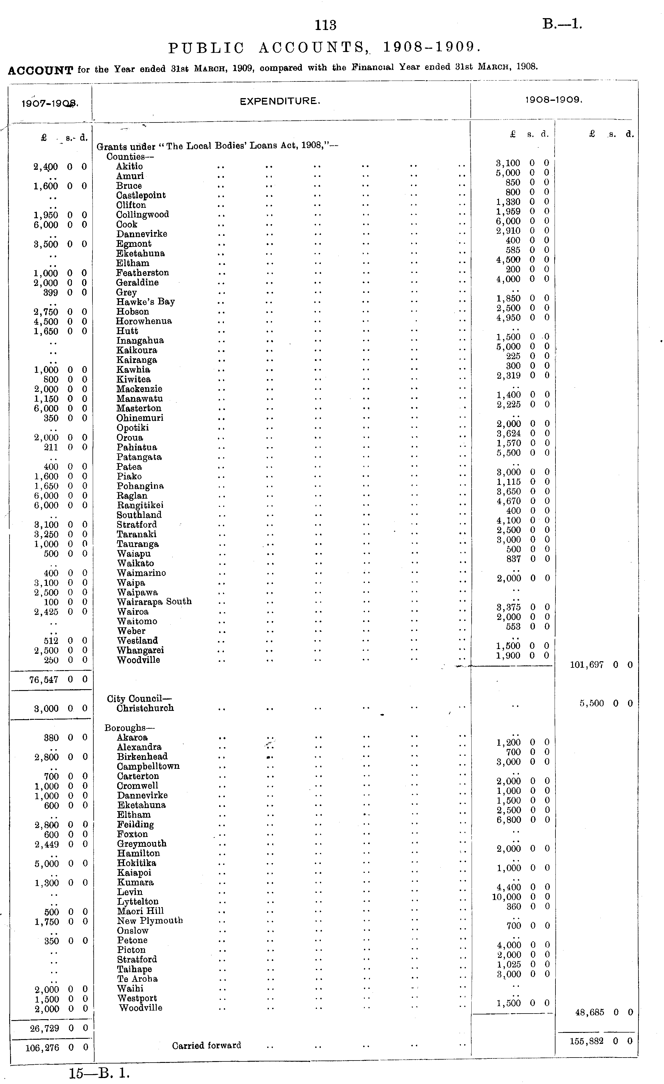 1907-19QS. EXPENDITURE. F, £ s. d. £ s. d. £ s. d. Grants under "The Looal Bodies' Loans Act, 1908,"— Counties — Akitio Amuri Bruoe Castlepoint Clifton Collingwood Cook Dannevirke Egmont Eketahuna .. ■ • Eltham Featherston Geraldine Grey Hawke's Bay Hobson Horowhenua Hutt Inangahua Kaikoura Kairanga Kawhia Kiwitea Mackenzie Manawatu Masterton Ohinemuri Opotiki Oroua Pahiatua Patangata Patea Piako Pohangina Raglan Rangitikei Southland Stratford Taranaki Tauranga Waiapu Waikato Waimarino Waipa Waipawa Wairarapa South Wairoa Waitomo Weber Westland Whangarei Woodville 2,4,00 0 0 1,600 0 0 1,950 0 0 6,000 0 0 3,100 0 0 5,000 0 0 850 0 0 800 0 0 1,330 0 0 1,959 0 0 6,000 0 0 2,910 0 0 400 0 0 585 0 0 4,500 0 0 200 0 0 4,000 0 0 3,500 0 0 1,000 0 0 2,000 0 0 399 0 0 2,750 0 0 4,500 0 0 1,650 0 0 1,850 0 0 2,500 0 0 4,950 0 0 1,500 0 0 5,000 0 0 225 0 0 300 0 0 2,319 0 0 1,000 0 0 800 0 0 2,000 0 0 1,150 0 0 6,000 0 0 350 0 0 1,400 0 0 2,225 0 0 2,000 0 0 211 0 0 2,000 0 0 3,624 0 0 1,570 0 0 5,500 0 0 400 0 0 1,600 0 0 1,650 0 0 6,000 0 0 6,000 0 0 3,000 0 0 1,115 0 0 3,650 0 0 4,670 0 0 400 0 0 4,100 0 0 2,500 0 0 3,000 0 0 500 0 0 837 0 0 3,100 0 0 3,250 0 0 1,000 0 0 500 0 0 400 0 0 3,100 0 0 2,500 0 0 100 0 0 2,425 0 0 2,000 0 0 3,375 0 0 2,000 0 0 553 0 0 101,697 0 0 512 0 0 2,500 0 0 250 0 0 1,500 0 0 1,900 0 0 76,547 0 0 City Council — Christohurch 5,500 0 0 3,000 0 0 380 0 0 Boroughs— Akaroa Alexandra • • •• Birkenhead .. »• Campbelltown Carterton Cromwell • • • • Dannevirke Eketahuna Eltham Feilding Foxton ... Greymouth Hamilton Hokitika Kaiapoi Kumara Levin Lyttelton Maori Hill New Plymouth Onslow Petone Pioton Stratford Taihape Te Aroha Waihi Westport Woodville 1,200 0 0 700 0 0 3,000 0 0 2,800 0 0 700 0 0 1,000 0 0 1,000 0 0 600 0 0 2,000 0 0 1,000 0 0 1,500 0 0 2,500 0 0 6,800 0 0 2,800 0 0 600 0 0 2,449 0 0 2,000 0 0 5,000 0 0 1,000 0 0 48,085 0 0 1,800 0 0 4,400 0 0 10,000 0 0 360 0 0 500 0 0 1,750 0 0 700 0 0 350 0 0 4,000 0 0 2,000 0 0 1,025 0 0 3,000 0 0 2,000 0 0 1,500 0 0 2,000 0 0 1,500 0 0 26,729 0 0 Carried forward 155,882 0 0 106,276 0 0