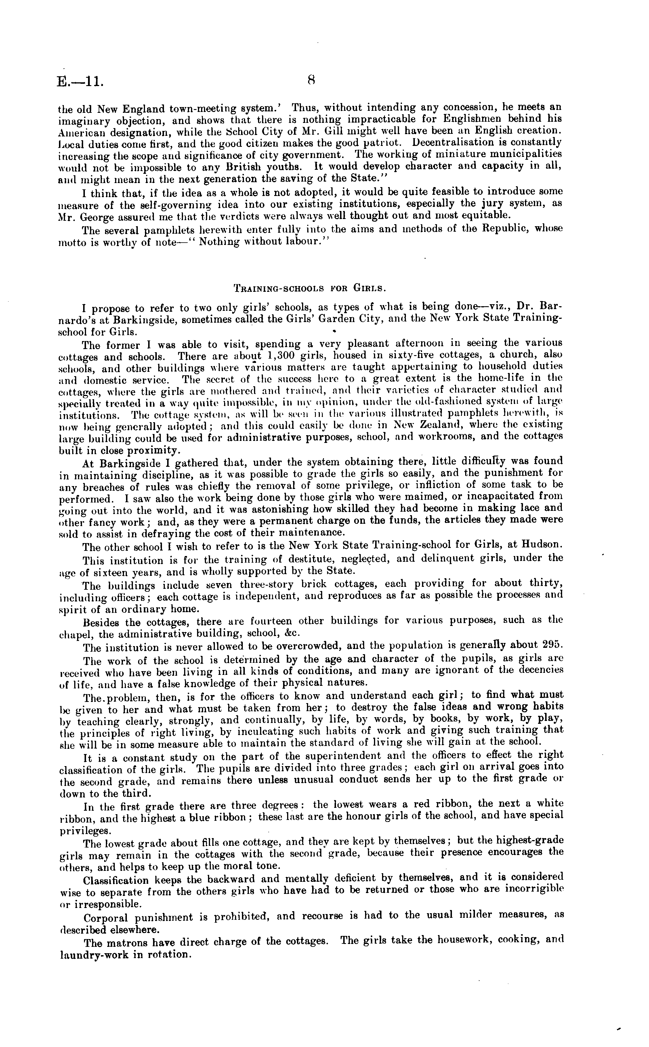 the old New England town-meeting system.' Thus, without intending any concession, lie meets an imaginary objection, and shows thai there is nothing impracticable for Englishmen behind his American designation, while the School City of Mr. Gill might well have been an English creation. Local duties oome first, and the good citizen makes the good patriot. Decentralisation is constantly increasing the scope and significance of city government. The working of miniature municipalities would not be impossible i" any British youths. It would develop character and capacity in all, and might mean in the next generation the saving of the State." 1 think that, if the idea as a whole is not adopted, it would be quite feasible to introduce some measure of the self-governing idea into our existing institutions, especially the jury system, as Mr. George assured me thai the verdicts were always well thought out and most equitable. The several pamphlets herewith enter fully into the aims and methods of the Republic, whose motto is worthy of note —" Nothing without Labour." Training schools fob Giblb. I propose to refer to two only gills' schools, as types of whal is being done—viz., Dr. Barnaido's at Barkingside, sometimes called the Girls' Garden City, and the New York Slate Trainingschool for Girls. The former I was able to visit, spending a very pleasant afternoon in seeing the various cottages and schools. There are about 1,300 girls, housed in sixty-five cottages, a church, also schools, and other buildings where various matters are taught appertaining to household duties and domestic service. The secret of the success here to a L'lv.it extent is the home-life in the cottages, where the girls are mothered and trained, and their varieties of character studied and specially treated in a way quite impossible, in my opinion, under the old-fashioned system of huge institutions. The cottage system, as will be Been in the various illustrated pamphlets herewith, is now being generally adopted; and this could easilj be done in New Zealand, where the existing large building could be used for administrative purposes, school, and workrooms, and the cottages built in close proximity. At Barkingside I gathered that, under the system obtaining there, little difficulty was found in maintaining discipline, as it was possible to grade the girls so easily, and the punishment for any breaches of rules was chiefly the removal of some privilege, or infliction of some task to be performed. I saw also the work being done by those girls who were maimed, or incapacitated iron going out into the world, and it was astonishing how skilled they had become in making lace ami other fancy work ; and, as they were a permanent charge on the funds, the articles they made were sold to assist in defraying Hie cost of their maintenance. The other school I wish to refer to is the New York State Training-school for Girls, at Hudson. This institution is for the training of destitute, neglected, and delinquent girls, under the age of sixteen years, and is wholly supported by the State. The buildings include seven three-Story brick cottages, each providing for about thirty, including otlicers; each cottage is independent, and reproduces as far as possible the processes and spirit of an ordinary home. liesides the cottages, there are fourteen other buildings for various purposes, such as the chapel, the administrative building, school, &c. The institution is never allowed to be overcrowded, and the population is generally about 295. The work of the school is determined by the age and character of the pupils, as girls are received who have been living in all kinds of conditions, and many are ignorant of the decencies of life, and have a false knowledge of their physical natures. The.problem, then, is for the officers to know and understand each girl; to find what must be u'iven to her and what must be taken from her; to destroy the false ideas and wrong habits by teaching clearly, strongly, and continually, by life, by words, by books, by work, by play, the principles of right living, by inculcating such habits of work and giving such training that she will be in some measure able to maintain the standard of living she will gain at the school. It is a constant study on the pait of the superintendent and the ollicers to effect the right classification of the ei,ls. The pupils are divided into three grades; each girl on arrival goes into the second grade, and remains there unless unusual conduct sends her up to the first grade or down to the third. In the first grade there are three degrees: the lowest wears a red ribbon, the next a white ribbon, ami the highest a blue ribbon : these last are the honour girls of the school, and have special privileges. The lowest grade about fills one cottage, and they are kept by themselves ; but the highest-grade Mirls may remain in the ooltages with the second grade, because their presence encourages the others, and helps to keep up the moral tone. Classification keeps the backward and mentally deficient by themselves, and it is considered wise to separate from 111<- others iris who have had to be returned or those who are incorrigible or irresponsible. Corporal punishment is prohibited, and recourse is had to the usual milder measures, as described elsewhere. The matrons have direct charge of the cottages. The girls take the housework, cooking, and laundry-work in rotation.