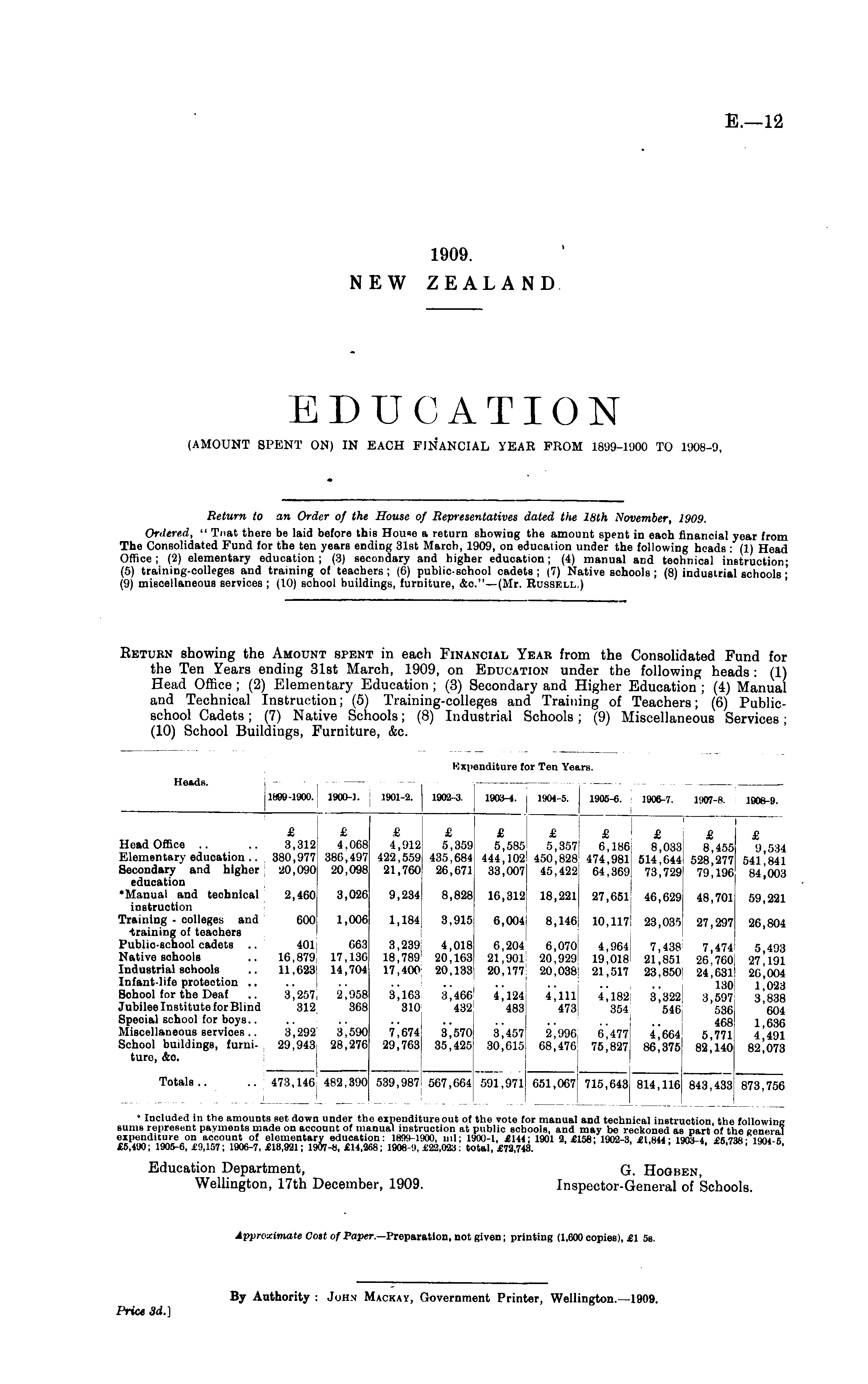 Return to an Order of the House of Representatives dated the 18th November, 1909. Ordered, " Tnat there be laid before this House a return showing the amount spent in each financial year from The Consolidated Fund for the ten years ending 31st March, 1909, on education under the following heads : (1) Head Office; (2) elementary education; (3) secondary and higher education; (4) manual and technical instruction(s) training-colleges and training of teachers; (6) public-school cadets ; (7) Native schools; (8) industrial schools;' (9) miscellaneous services ; (10) school buildings, furniture, &c." —(Mr. Russell.)