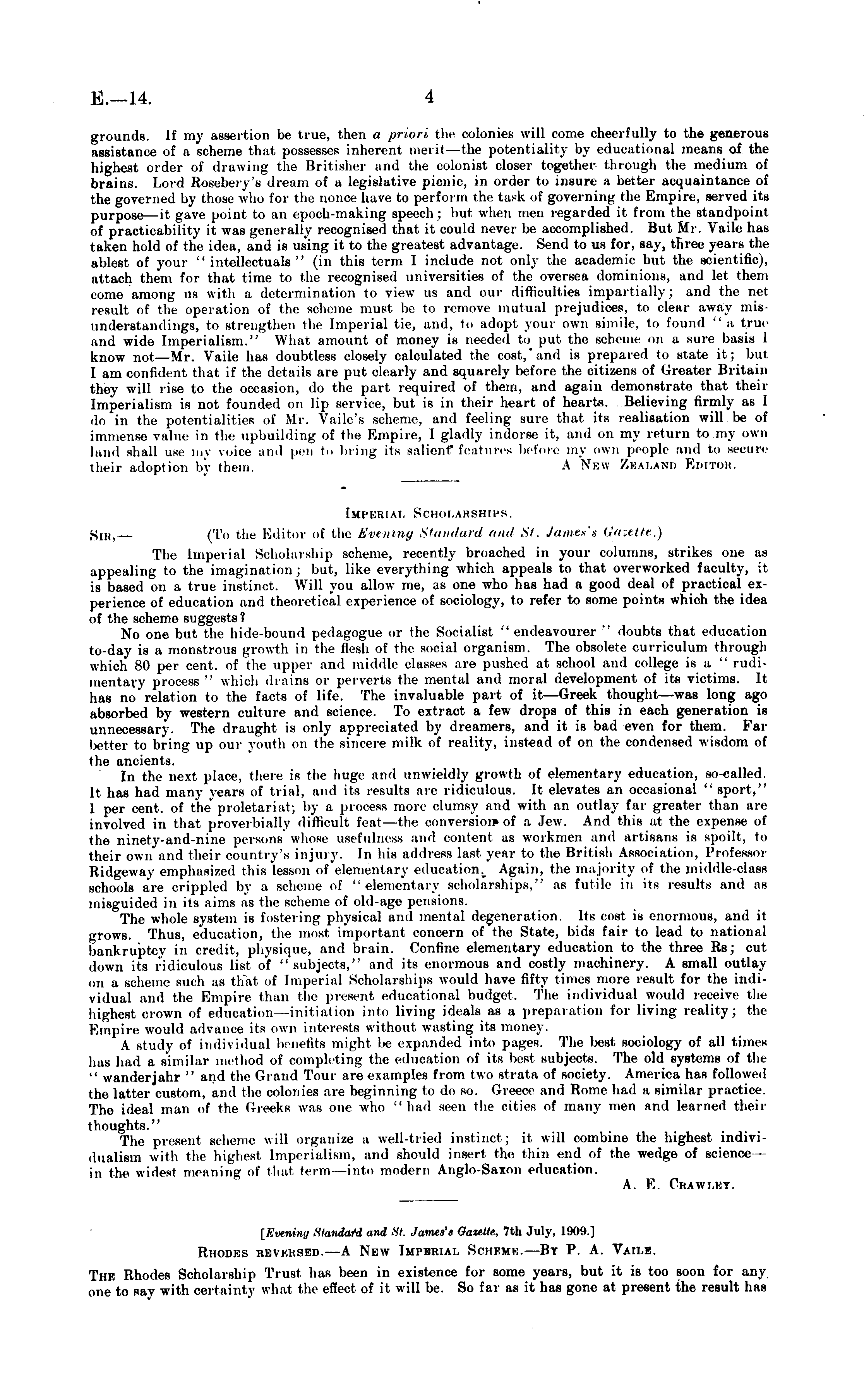 grounds. If my assertion be true, then ti priori the colonies will come cheerfully to the generous assistance of a scheme that possesses inherent merit the potentiality by educational means of the highest order of drawing the Britisher and the colonist closer together through the medium of brains. Lord Rosebery's dream of a legislative picnic, in order to insure a better acquaintance of the governed by those who for the nonce have to perform the task of governing the Empire, served its purpose —it gave point to an epoch-making speech : but when men regarded it from the standpoint of practicability it was generally recognised that it could never be accomplished. But Mr. Vaile has taken hold of the idea, and is using it to the greatest advantage. Send to us for, say, three years the ablest of your "intellectuals" (in this term I include not only the academic but the scientific), attach them for that time to the recognised universities of the oversea dominions, and let them come among us with a determination to view us and our difficulties impartially; and the net result of the operation of the scheme must be to remove mutual prejudices, to clear away mis understandings, to strengthen the Imperial tie, and, to adopt your own simile, to found "a true and wide Imperialism." What amount of money is needed to put the scheme on a sure basis I know not —Mr. Vaile has doubtless closely calculated the cost/and is prepared to state it; but I am confident that if the details are put clearly and squarely before the citizens of Greater Britain they will rise to the occasion, do the part required of them, and again demonstrate that their Imperialism is not founded on lip service, but is in their heart of hearts. Believing firmly as I do in the potentialities of Mr. Yaile's scheme, and feeling sure that its realisation will be of immense value in the upbuilding of the Empire, I gladly indorse it. and on my return to my own land shall use my voice and pen to bring its salient - features before my own people and to secure their adoption by them. A Nkw Zkm.anu Editor. htt'KuiAt, Scholarships, Shi, — (To the Editor of the Evening Standard and St. .hunts'* Gazette.) The Imperial Scholarship scheme, recently broached in your columns, strikes one as appealing to the imagination; but, like everything which appeals to that overworked faculty, it is based on a true instinct. Will you allow me, as one who has had a good deal of practical experience of education and theoretical experience of sociology, to refer to some points which the idea of the scheme suggests 1 No one but the hide-bound pedagogue or the Socialist " endeavourer " doubts that education to-day is a monstrous growth in the flesh of the social organism. The obsolete curriculum through which 80 per cent, of the upper and middle classes are pushed at school and college is a " rudimentary process" which drains or perverts the mental and moral development of its victims. It has no relation to the facts of life. The invaluable part of it—Greek thought—was long ago absorbed by western culture and science. To extract a few drops of this in each generation is unnecessary. The draught is only appreciated by dreamers, and it is bad even for them. Far better to bring up our youth on the sincere milk of reality, instead of on the condensed wisdom of the ancients. In the next place, there is the huge and unwieldly growth of elementary education, so-called. It has had many years of trial, and its results are ridiculous. It elevates an occasional "sport," 1 per cent, of the proletariat; by a process more clumsy and with an outlay far greater than are involved in that proverbially difficult feat —the conversion*of a Jew. And this at the expense of the ninety-and-nine persons whose usefulness and content as workmen and artisans is spoilt, to their own and their country's injury. In his address last year to the British Association, Professor Ridgeway emphasized this lesson of elementary Again, the majority of the middle-class schools are crippled by a scheme of "elementary scholarships," as futile in its results and as misguided in its aims as the scheme of old-age pensions. The whole system is fostering physical and mental degeneration. Its cost is enormous, and it grows. Thus, education, the most important concern of the State, bids fair to lead to national bankruptcy in credit, physique, and brain. Confine elementary education to the three Rs; cut down its ridiculous list of "subjects." and its enormous and costly machinery. A small outlay on a scheme such as that of Imperial Scholarships would have fifty time's more result for the individual and the Empire than the present, educational budget. The individual would receive the highest crown of education—initiation into living ideals as a preparation for living reality; the Empire would advance its own interests without wasting its money . A study of individual benefits might be expanded into pages. The best sociology of all times has had a similar method of completing the education of its lust subjects. The old systems of the " wanderjahr " ami the Grand Tour arecxamples from two strata of society. America has followed the latter custom, anil the colonies are beginning to do so. Greece and Rome hail a similar practice. The ideal man of the Creeks was one who " had seen the cities of many men and learned their thoughts." The present scheme will organize a well-tried instinct; it will combine the highest individualism with the highest Imperialism. ami should insert the thin end of the wedge of science in the widest meaning of that term into modern Anglo Saxon education. A. E. CItAWI.EY. \Koeniiuj StandaM ami SI. James's Gazette. 7th July, 1909.J Rhodes reversed. —A New Imperiai. Scheme. —By P. A. Vaile. The Rhodes Scholarship Trust has been in existence for some years, but it is too soon for any one to say with certainty what the effect of it will be. So far as it has gone at present the result has