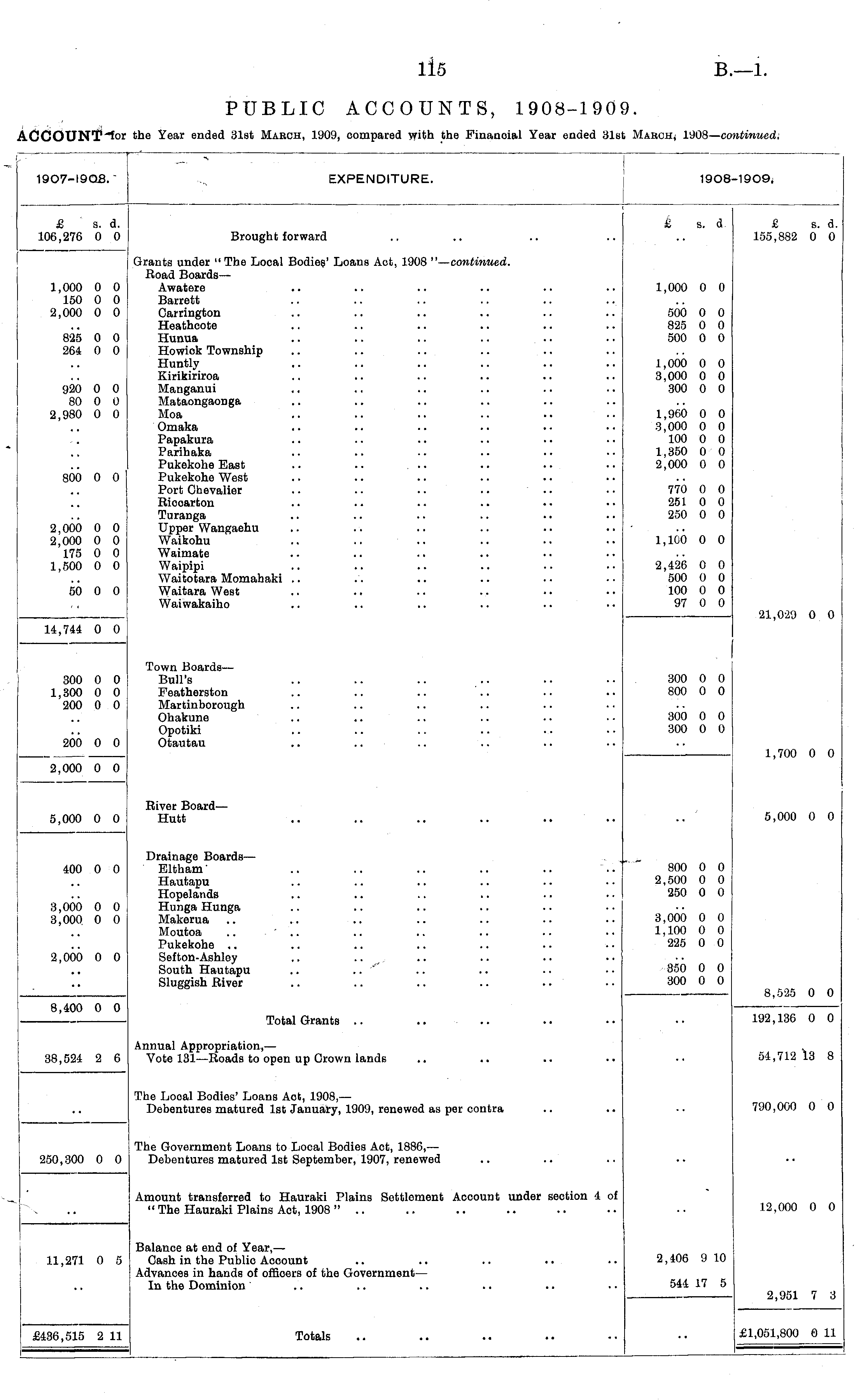 £ s. d. 106,276 0 0 £ s. d. £ s. d. 155,882 0 0 Brought forward 1,000 0 0 150 0 0 2,000 0 0 825 0 0 264 0 0 920 0 0 80 0 0 2,980 0 0 Grants under "The Local Bodies' Loans Act, 1908 " — continued. Road Boards— Awatere Barrett Carrington Heatheote Hunua Howiok Township Huntly Kirikiriroa Manganui Mataongaonga Moa Omaka Papakura Parihaka Pukekohe East .. .. Pukekohe West Port Chevalier Ricoarton Turanga Upper Wangaehu Waikohu Waimate Waipipi Waitotara Momahaki Waitara West Waiwakaiho 1,000 0 0 500 0 0 825 0 0 500 0 0 1,000 0 0 3,000 0 0 300 0 0 1,960 0 0 3,000 0 0 100 0 0 1,350 0 0 2,000 0 0 21,029 0 0 800 0 0 770 0 0 251 0 0 250 0 0 2,000 0 0 2,000 0 0 175 0 0 1,500 0 0 1,100 0 0 50 0 0 2,426 0 0 500 0 0 100 0 0 97 0 0 14,744 0 0 300 0 0 1,300 0 0 200 0 0 Town Boards — Bull's Featherston Martinborough Ohakune Opotiki Otautau 300 0 0 800 0 0 300 0 0 300 0 0 1,700 0 0 200 0 0 2,000 0 0 River Board— Hutt 5,000 0 0 Drainage Boards— Eltham' Hautapu Hopelands Hunga Hunga Makerua Moutoa .. ' .. Pukekohe Sef ton-Ashley South Hautapu .. Sluggish River 800 0 0 2,500 0 0 250 0 0 5,000 0 0 400 0 0 3,000 0 0 3,000 0 0 3,000 0 0 1,100 0 0 225 0 0 8,525 0 0 2,000 0 0 850 0 0 300 0 0 8,400 0 0 Total Grants 192,136 0 0 38,524 2 6 Annual Appropriation,— Vote 131—Roads to open up Crown lands 54,712 13 8 The Looal Bodies' Loans Aot, 1908, — Debentures matured 1st January, 1909, renewed as per contra 790,000 0 0 250,300 0 0 The Government Loans to Local Bodies Act, 1886, — Debentures matured 1st September, 1907, renewed Amount transferred to Hauraki Plains Settlement Acoount under section 4 of " The Hauraki Plains Act, 1908 " .. 12,000 0 0 11,271 0 5 Balance at end of Year, — Cash in the Public Acoount Advances in hands of offioers of the Government— In the Dominion 2,406 9 10 2,951 7 3 544 17 5 Totals £436,515 2 11 £1,051,800 6 11