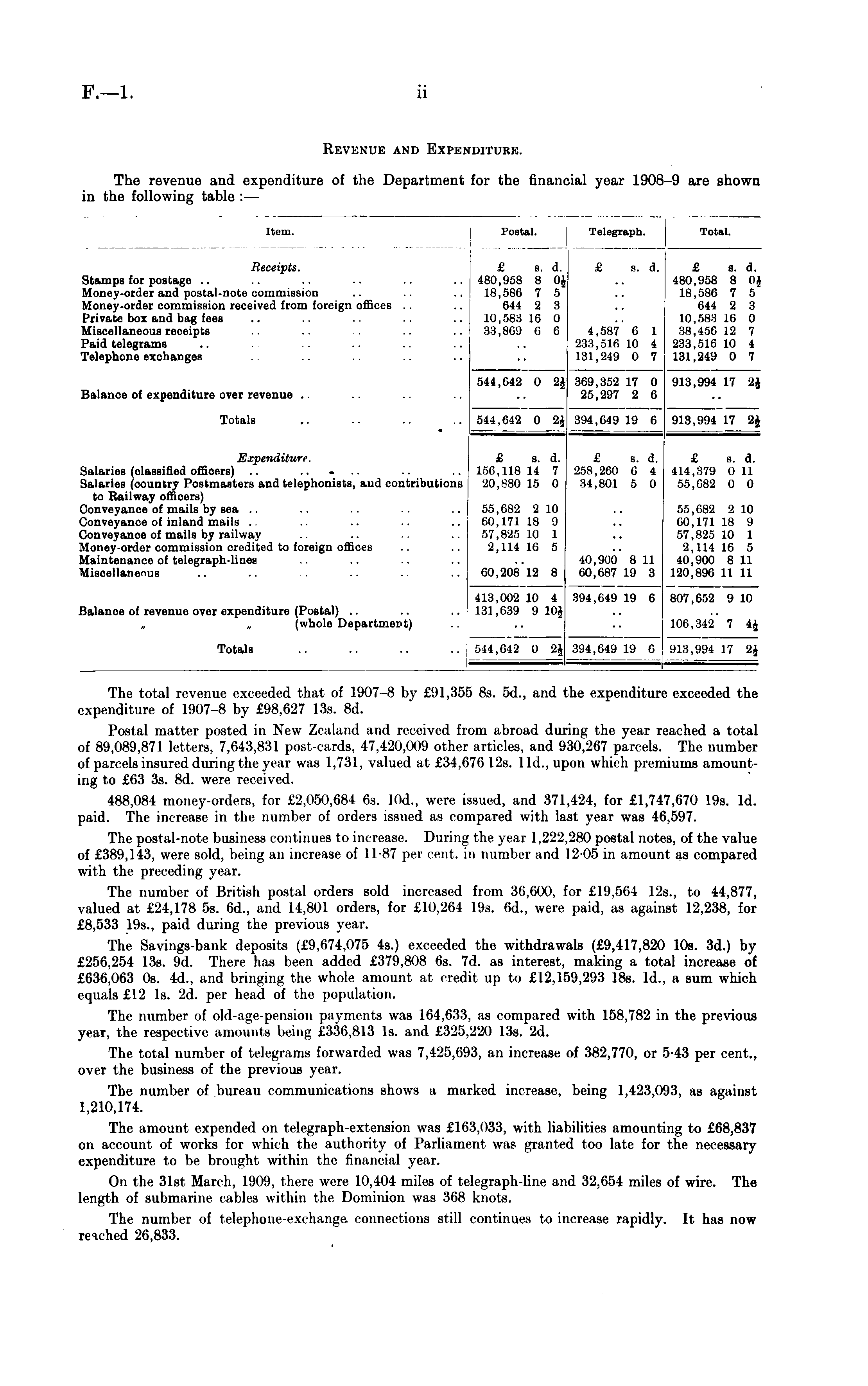 The total revenue exceeded that of 1907-8 by £91,355 Bs. 5d., and the expenditure exceeded the expenditure of 1907-8 by £98,627 13s. Bd. Postal matter posted in New Zealand anil received from abroad during the year reached a total of 89,089,871 letters, 7,643,831 post-cards, 47,420,009 other articles, and 930,267 parcels. The number of parcels insured during the year was 1.731, valued at £34,676 12s. lid., upon which premiums amounting to £63 3s. Bd. were received. 488,084 money-orders, for £2,050,684 6s. 10d., were issued, and 371,424, for £1,747,670 19s. Id. paid. The increase in the number of orders issued as compared with last year was 46,597. The postal-note business continues to increase. During the year 1.222,280 postal notes, of the value of £389,143, were sold, being an increase of 11-87 per cent, in number and 12-05 in amount as compared with the preceding year. The number of British postal orders sold increased from 36,600, for £19,564 125., to 44,877, valued at £24,178 ss. 6d., and 14,801 orders, for £10,264 19s. 6d., were paid, as against 12,238, for £8,533 195., paid during the previous year. The Savings-bank deposits (£9,674,075 45.) exceeded the withdrawals (£9,417,820 10s. 3d.) by £256,254 13s. 9d. There has been added £379,808 6s. 7d. as interest, making a total increase of £636,063 os. 4d., and bringing the whole amount at credit up to £12,159,293 18s. Id., a sum which equals £12 Is. 2d. per head of the population. The number of old-age-pension payments was 164,633, as compared with 158,782 in the previous year, the respective amount, being £336,813 Is. and £325,220 13s. 2d. The total number of telegrams forwarded was 7,425,693, an increase of 382,770, or 5-43 per cent., over the business of the previous year. The number of bureau communications shows a marked increase, being 1,423,093, as against 1,210,174. The amount expended on telegraph-extension was £163,033, with liabilities amounting to £68,837 on account of works for which the authority of Parliament was granted too late for the necessary expenditure to be brought within the financial year. On the 31st March, 1909, there were 10,404 miles of telegraph-line and 32,654 miles of wire. The length of submarine cables within the Dominion was 368 knots. The number of telephone-exchange, connections still continues to increase rapidly. It has now reached 26,833.