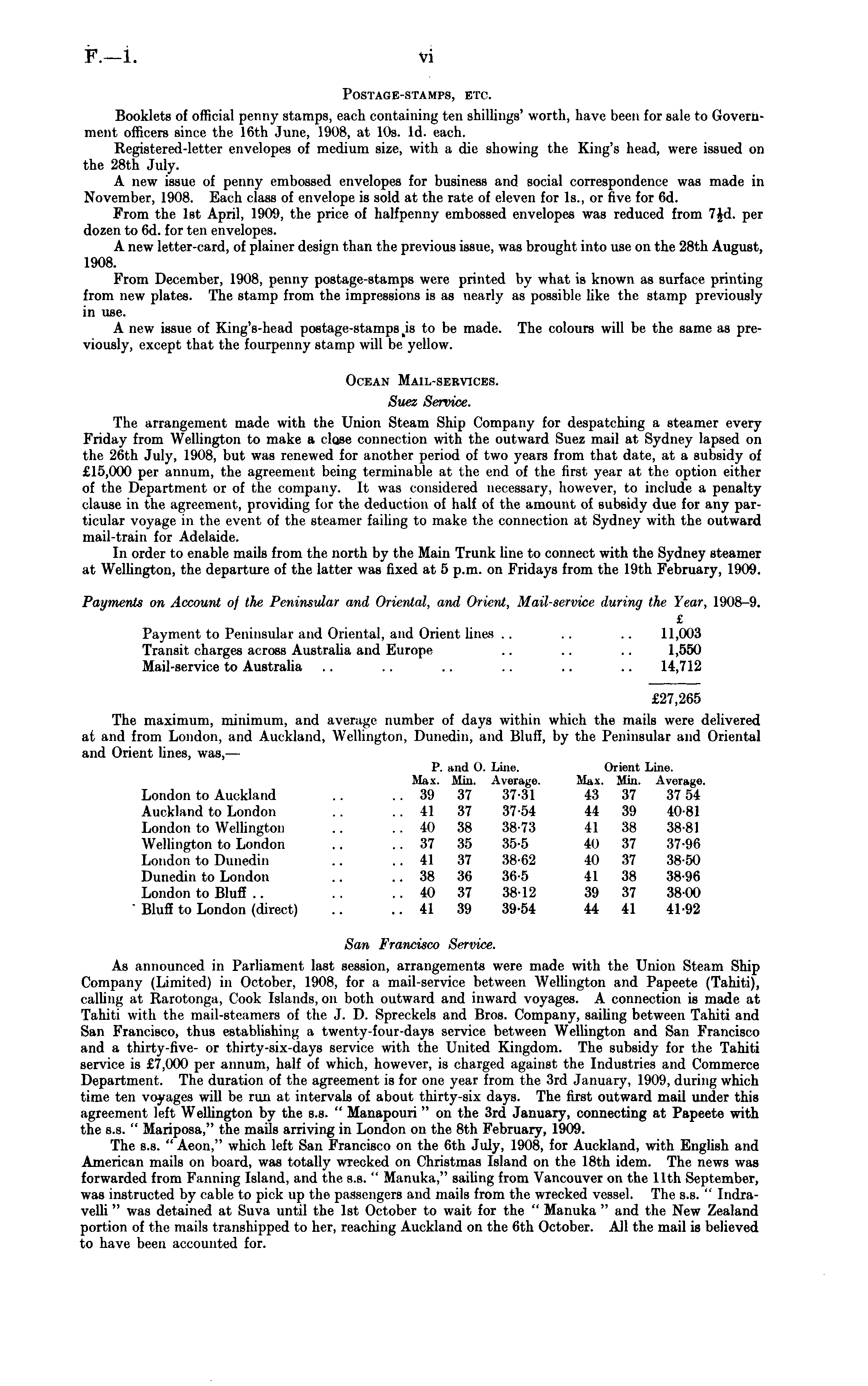 Postaoe-stamps, f.ic. Booklets of official penny stamps, each containing ten shillings' worth, have been for sale to Government officers since the 16th June, 1908, at 10s. Id. each. Registered-letter envelopes of medium size, with a die showing the King's head, were issued on the 28th July. A new issue of penny embossed envelopes for business and social correspondence was made in November, 1908. Each class of envelope is sold at the rate of eleven for Is., or five for 6d. From the Ist April, 1909, the price of halfpenny embossed envelopes was reduced from 7£d. per dozen to 6d. for ten envelopes. A new letter-card, of plainer design than the previous issue, was brought into use on the 28th August, 1908. From December, 1908, penny postage-stamps were printed by what is known as surface printing from new plates. The stamp from the impressions is as nearly as possible like the stamp previously in use. A new issue of Kings-head postage-stamps t is to be made. The colours will be the same as previously, except that the fourpenny stamp will be yellow. Ocean Mail-services. Suez Service. The arrangement made with the Union Steam Ship Company for despatching a steamer every Friday from Wellington to make a close connection with the outward Suez mail at Sydney lapsed on the 26th July, 1908, but was renewed for another period of two years from that date, at a subsidy of £15,000 per annum, the agreement being terminable at the end of the first year at the option either of the Department or of the company. It was considered necessary, however, to include a penalty clause in the agreement, providing for the deduction of half of the amount of subsidy due for any particular voyage in the event of the steamer failing to make the connection at Sydney with the outward mail-train for Adelaide. In order to enable mails from the north by the Main Trunk line to connect with the Sydney steamer at Wellington, the departure of the latter was fixed at 5 p.m. on Fridays from the 19th February, 1909. Payments on Account of the Peninsular and Oriental, and Orient, Mail-service during the Year, 1908-9. Payment to Peninsular and Oriental, and Orient lines .. .. .. 11,003 Transit charges across Australia and Europe .. .. .. 1,550 Mail-service to Australia . . .. .. .. .. .. 14,712 £27,265 The maximum, minimum, and average number of days within which the mails were delivered at and from London, and Auckland, Wellington, Dunedin. and Bluff, by the Peninsular and Oriental and Orient lines, was, — P. and O. Line. Orient Line. Max. Mm. Average. Max. Mm. Average. London to Auckland .. .. 39 37 37-31 43 37 37 54 Auckland to London .. .. 41 37 37-54 44 39 40-81 London to Wellington .. .. 40 38 38-73 41 38 38-81 Wellington to London .. .. 37 35 35-5 40 37 37-96 London to Dunedin .. ..41 37 38-62 40 37 38-50 Dunedin to London .. .. 38 36 36-5 41 38 38-96 London to Bluff .. .. .. 40 37 38-12 39 37 38-00 " Bluff to London (direct) .. ..41 39 39-54 44 41 41-92 San Francisco Service. As announced in Parliament last session, arrangements were made with the Union Steam Ship Company (Limited) in October, 1908, for a mail-service between Wellington and Papeete (Tahiti), calling at Rarotonga, Cook Islands, on both outward and inward voyages. A connection is made at Tahiti with the mail-steamers of the J. D. Sprockets and Bros. Company, sailing between Tahiti and San Francisco, thus establishing a twenty-four-days service between Wellington and San Francisco and a thirty-five- or thirty-six-days service with the United Kingdom. The subsidy for the Tahiti service is £7,000 per annum, half of which, however, is charged against the Industries and Commerce Department. The duration of the agreement is for one year from the 3rd January. 1909, during which time ten voyages will be run at intervals of about thirty-six days. The first outward mail under this agreement left Wellington by the s.s. " Manapouri" on the 3rd January, connecting at Papeete with the s.s. " Mariposa," the mails arriving in London on the Bth February, 1909. The s.s. " Aeon," which left San Francisco on the 6th July, 1908, for Auckland, with English and American mails on board, was totally wrecked on Christmas Island on the 18th idem. The news was forwarded from Fanning Island, and the s.s. " Manuka," sailing from Vancouver on the 11th September, was instructed by cable to pick up the passengers and mails from the wrecked vessel. The s.s. " Indravelli " was detained at Suva until the Ist October to wait for the " Manuka " and the New Zealand portion of the mails transhipped to her, reaching Auckland on the 6th October. All the mail is believed to have been accounted for.