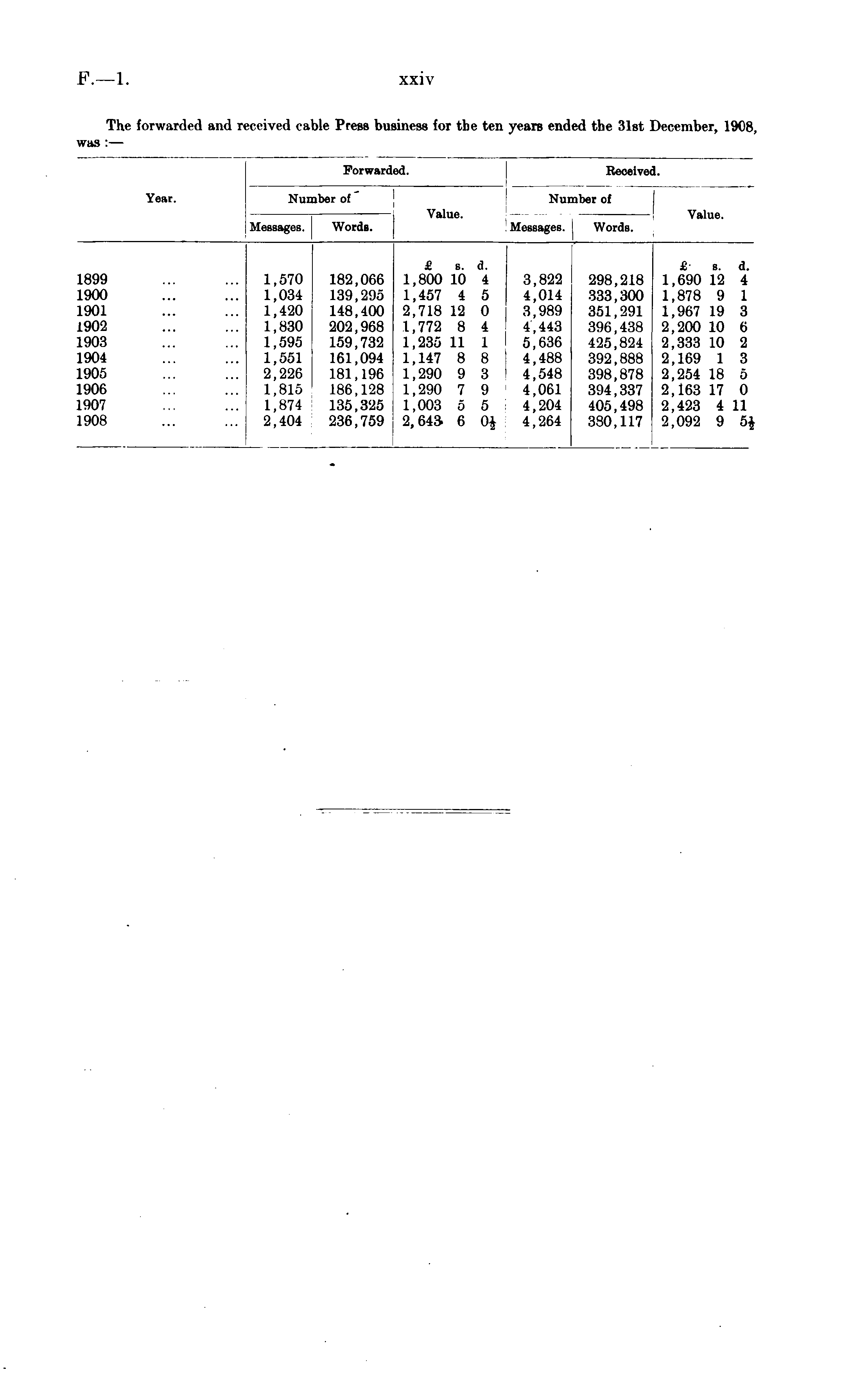 The forwarded and received cable Press business for the ten years ended the 31st December, 1908,