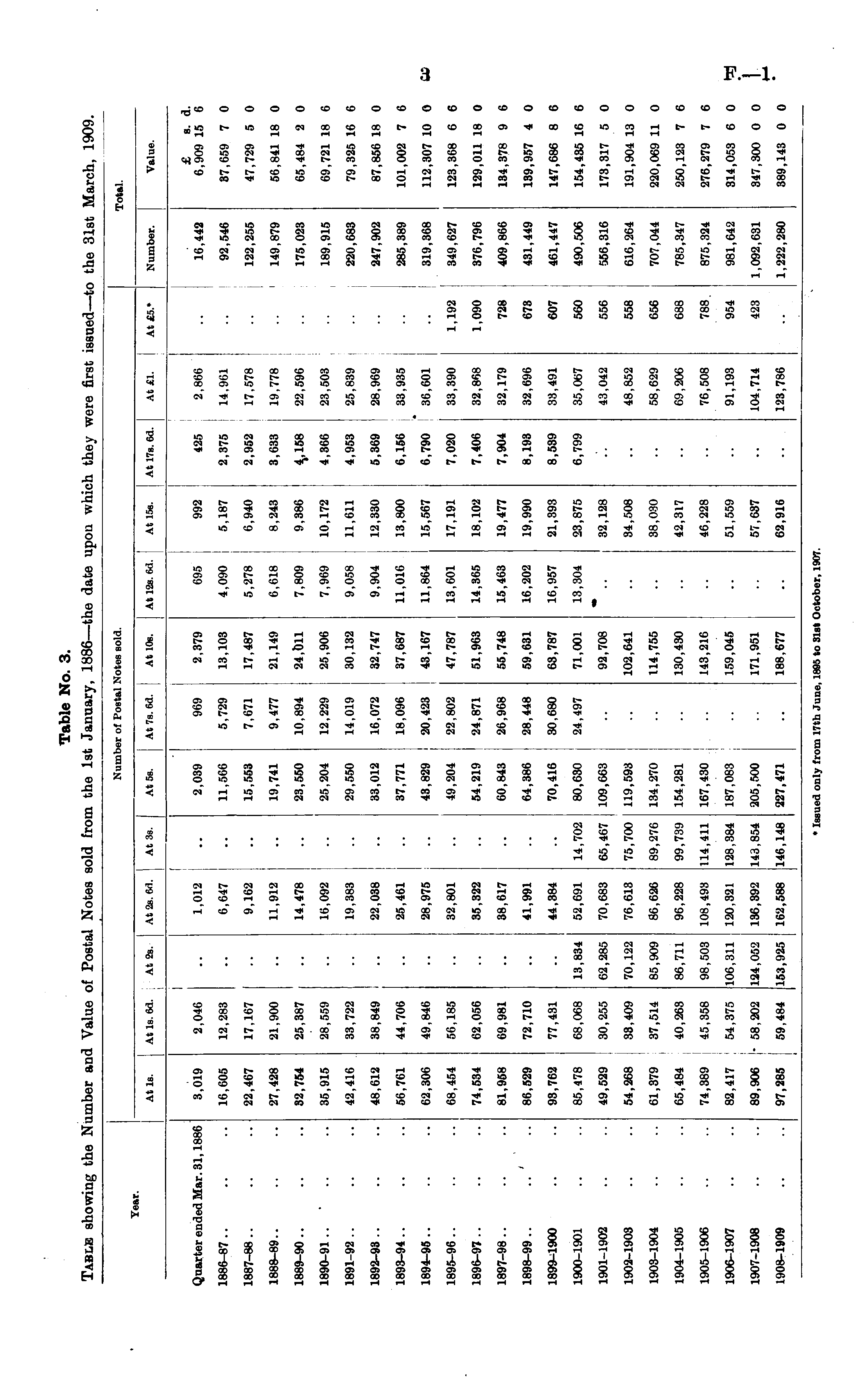 Table No. 3. Table showing the Number and Value of Postal Notes sold from the 1st January, 1886— the date upon which they were first issued— to the 31st March, 1909.