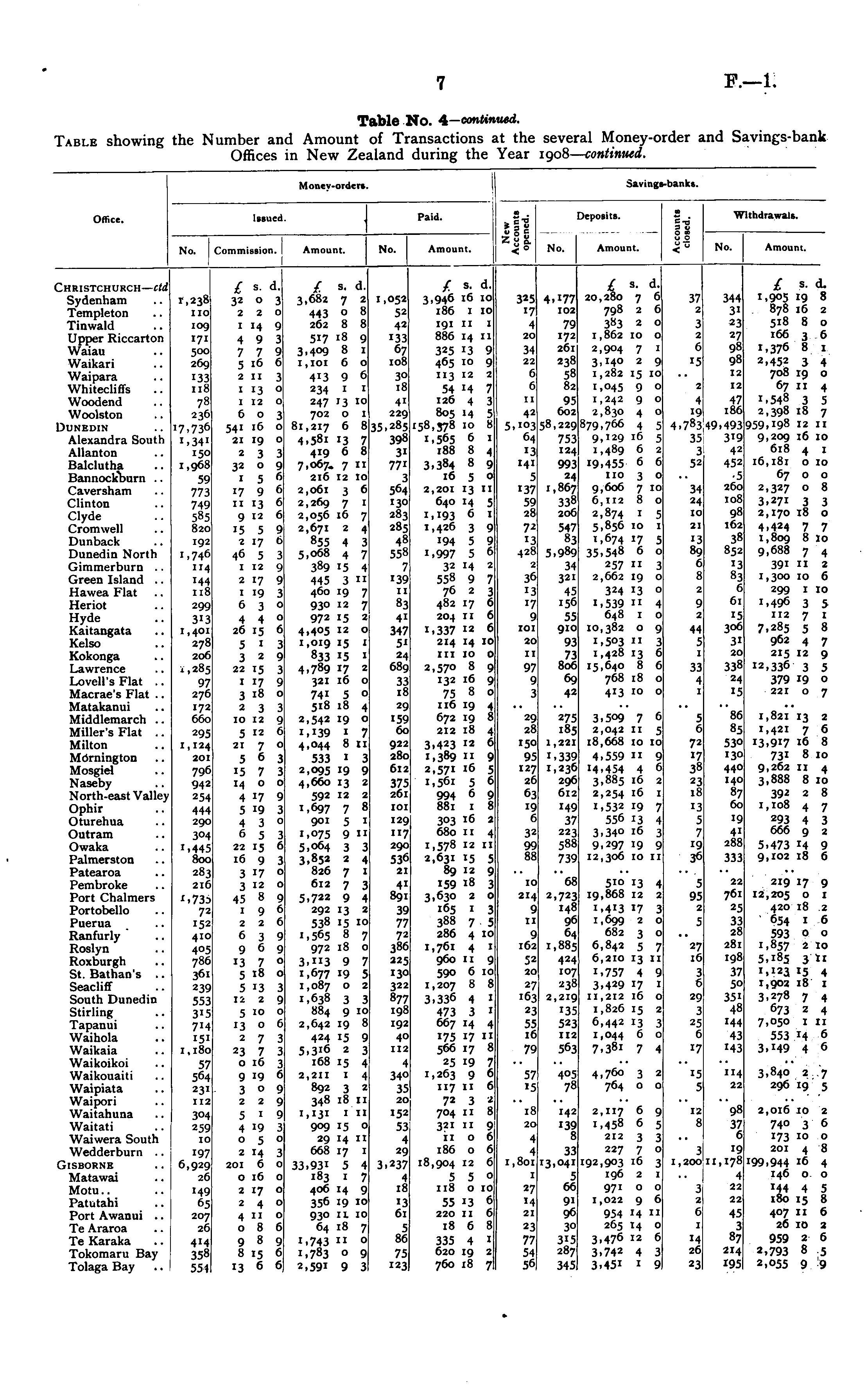 Table No. 4— continued. Table showing the Number and Amount of Transactions at the several Money-order and Savings-bank Offices in New Zealand during the Year 1908 — continued.